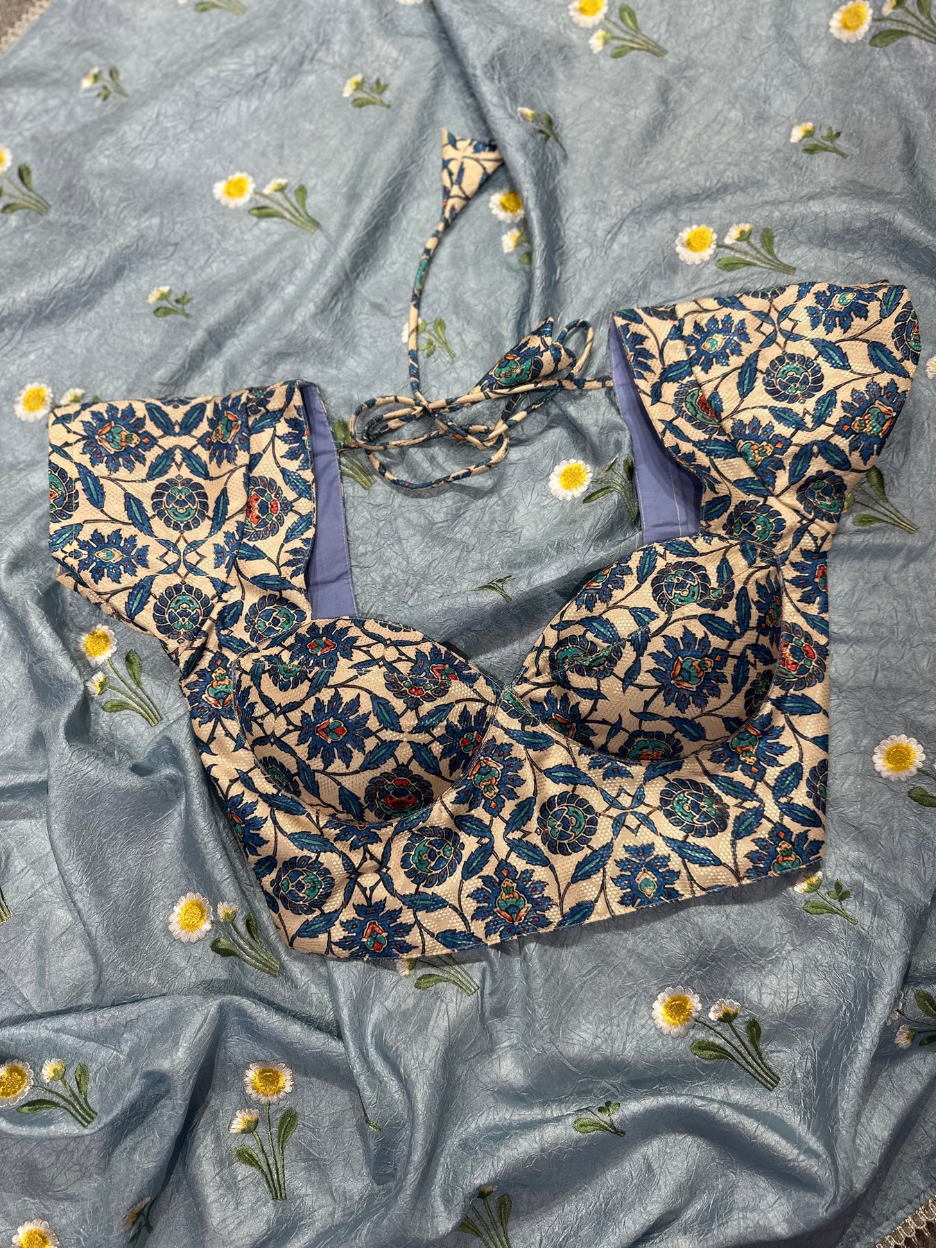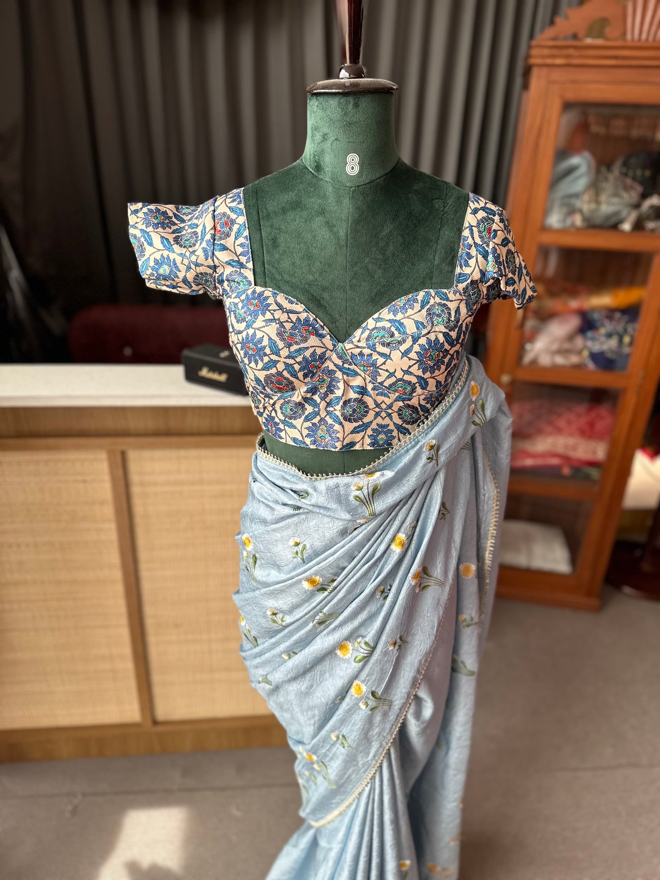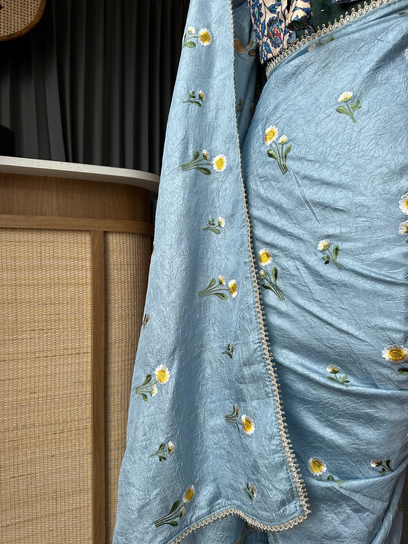 💠 Saree: Powder blue crushed silk with embroidered daisies & delicate lace border