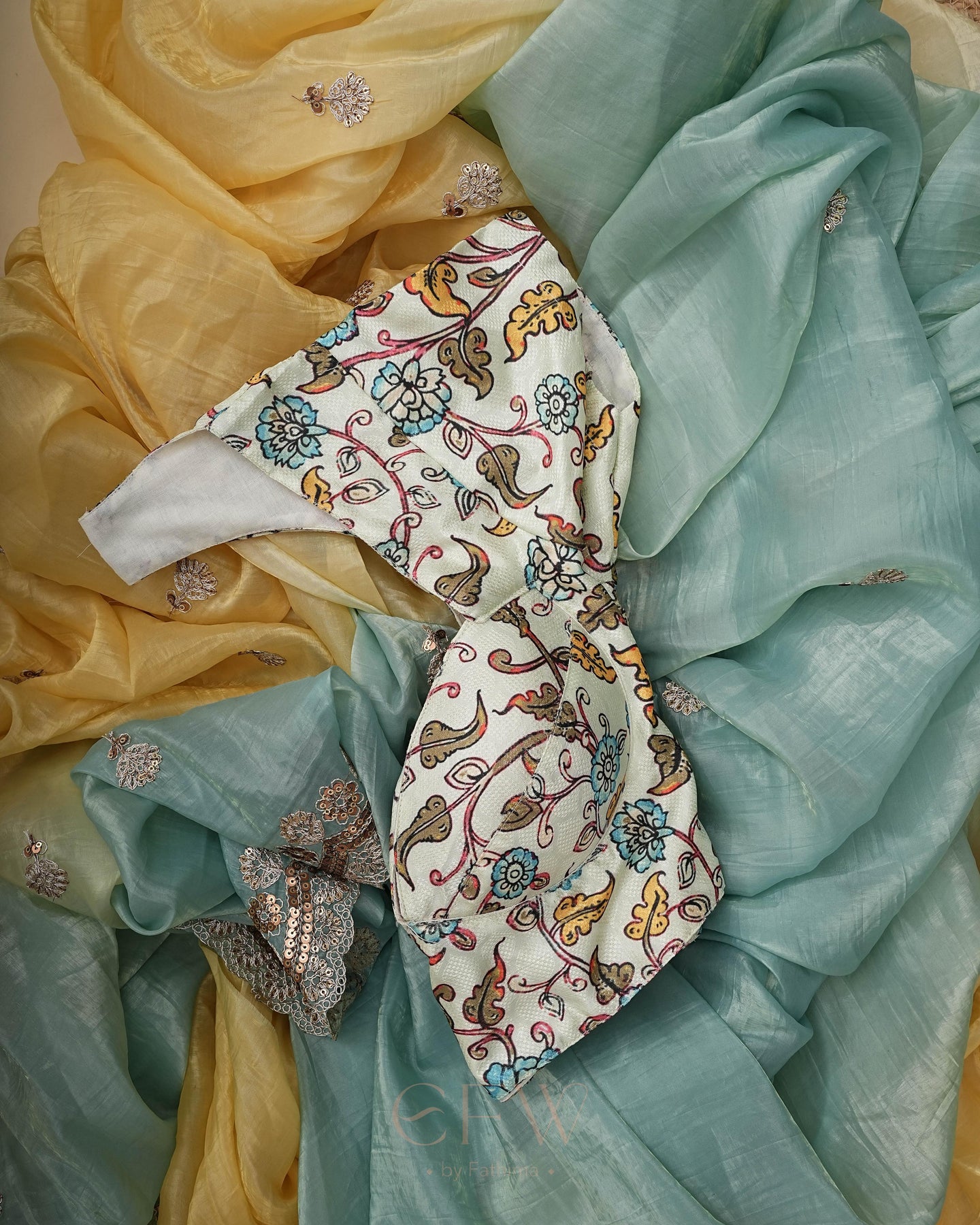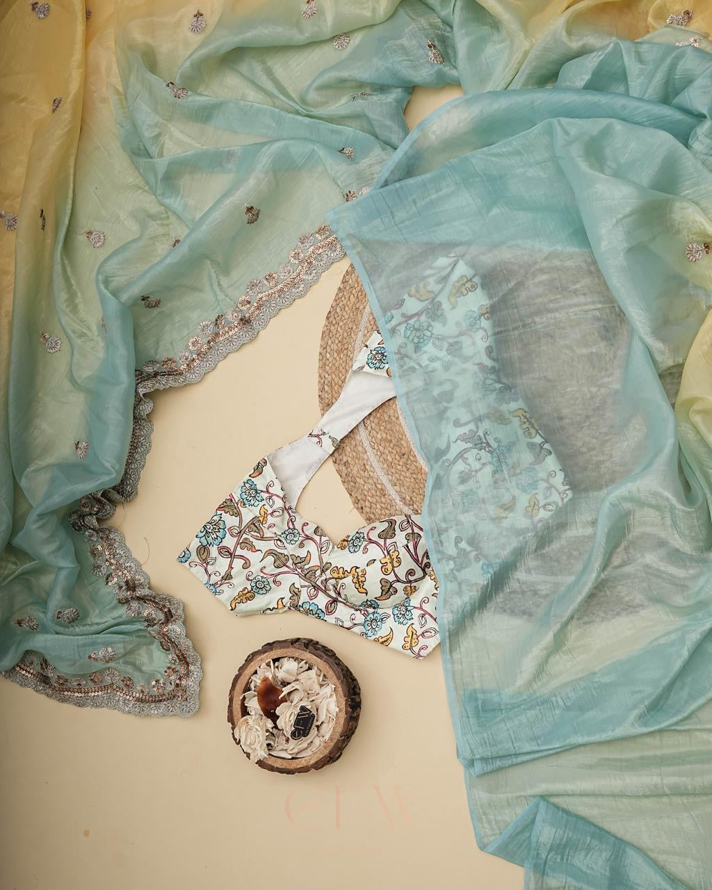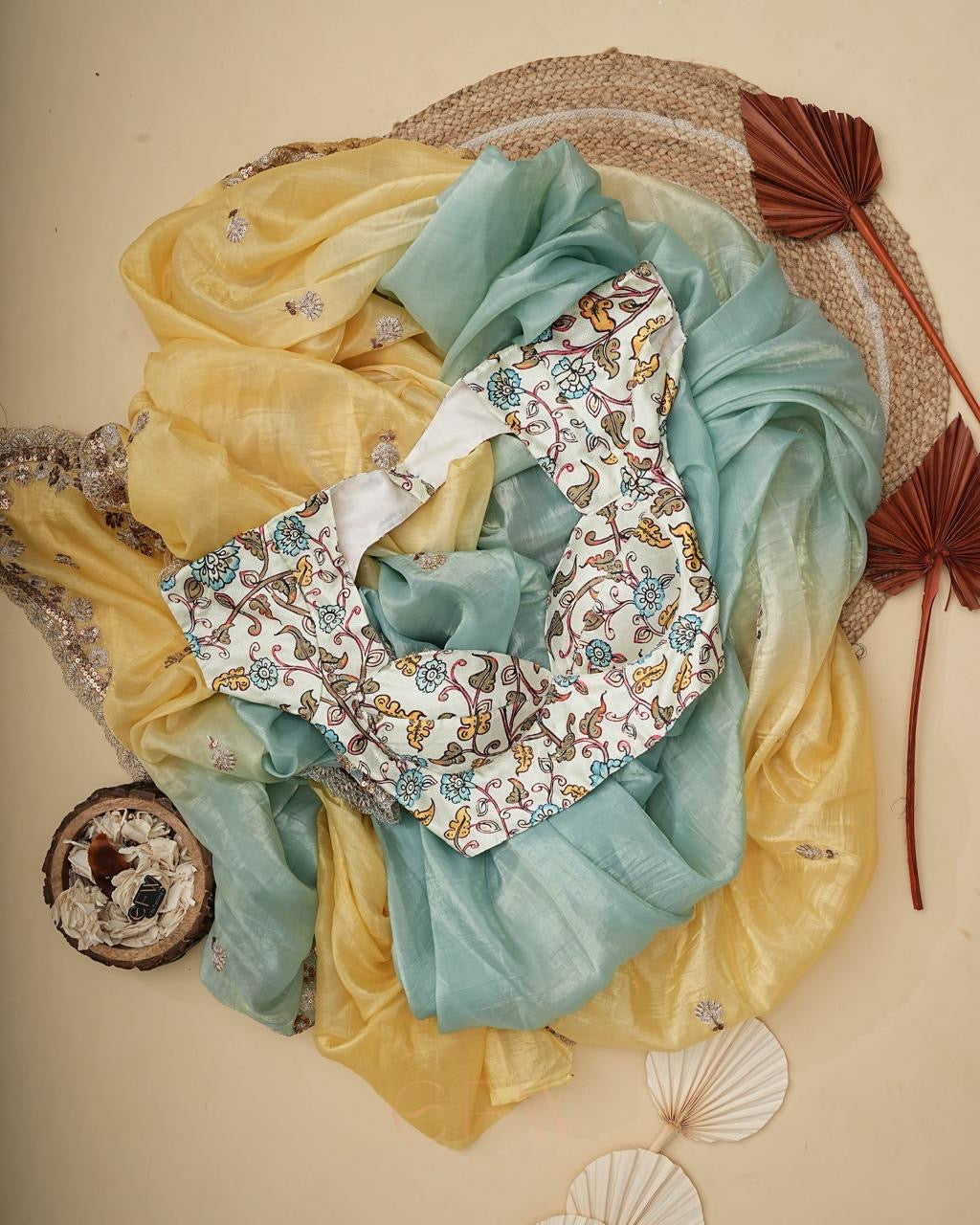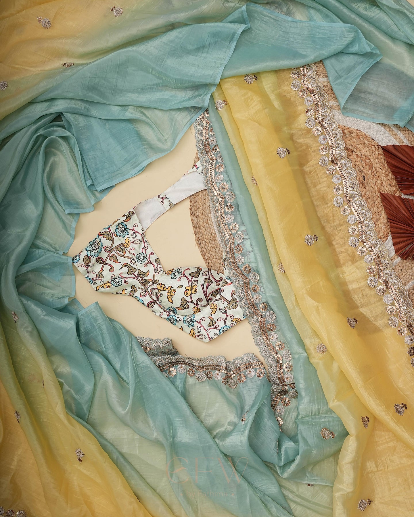 Step into effortless festive charm with this beautifully crafted crush-fabric saree in a soft blend of dreamy yellow and serene blue. The drape is adorned with all-over sequin embroidery, adding a gentle shimmer that catches the light with every move — elegant, not overpowering.