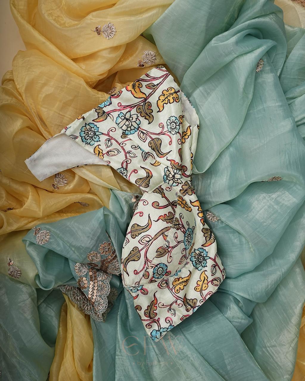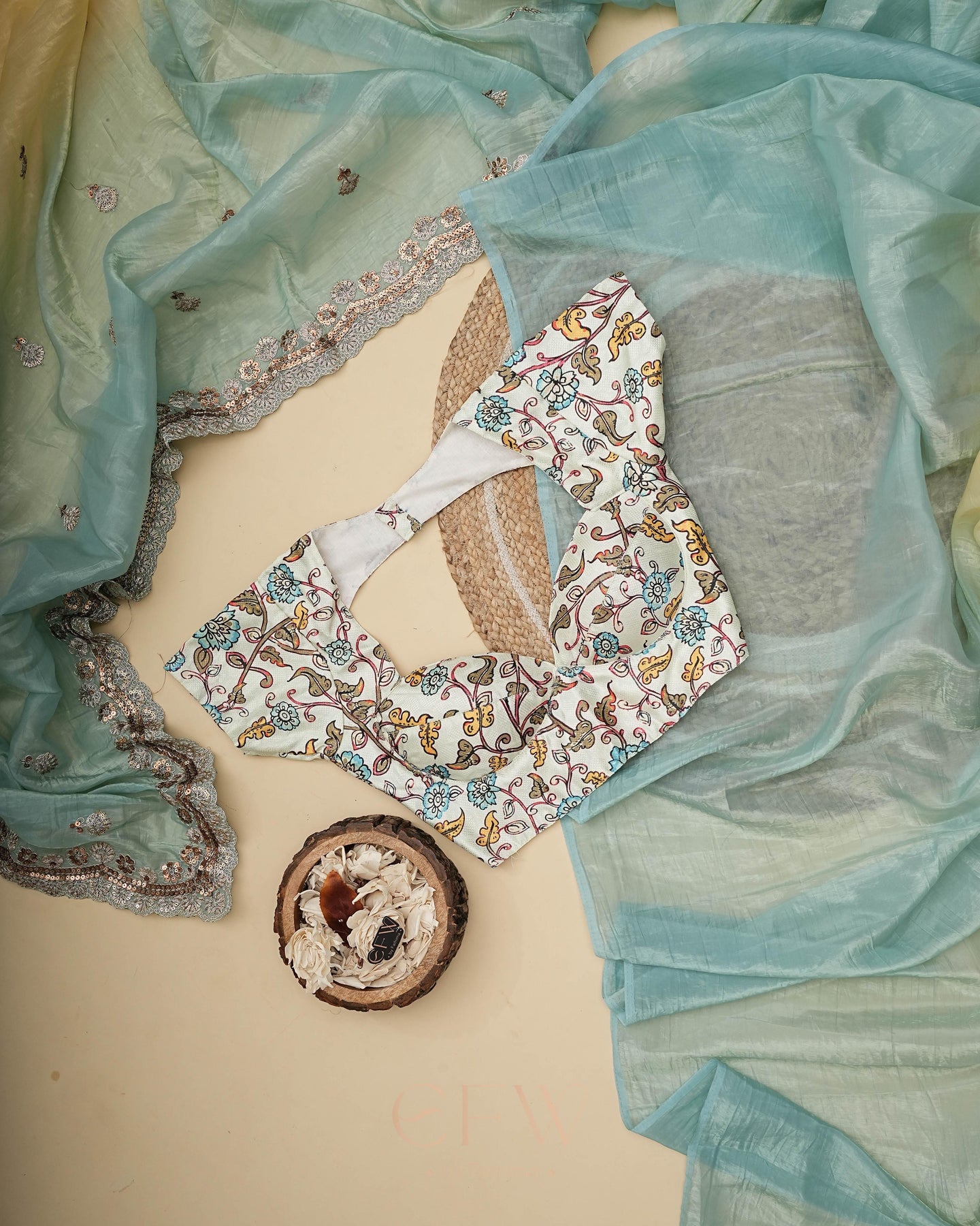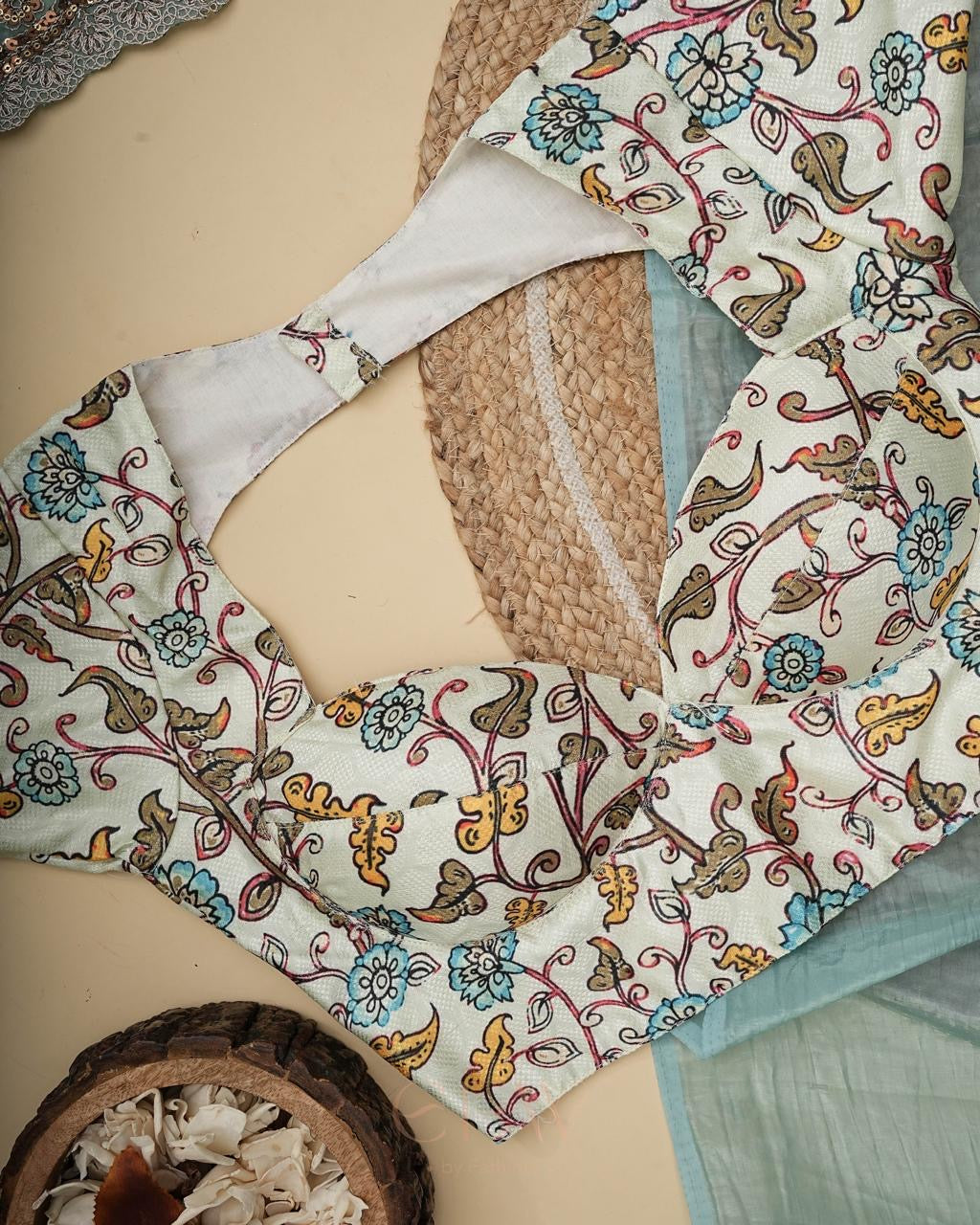 Paired with a vibrant multicolour floral blouse, the ensemble comes alive with hues of pinks, blues, and golds, making it the perfect balance of playful and sophisticated.