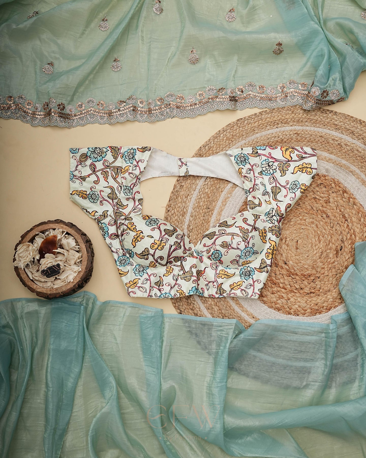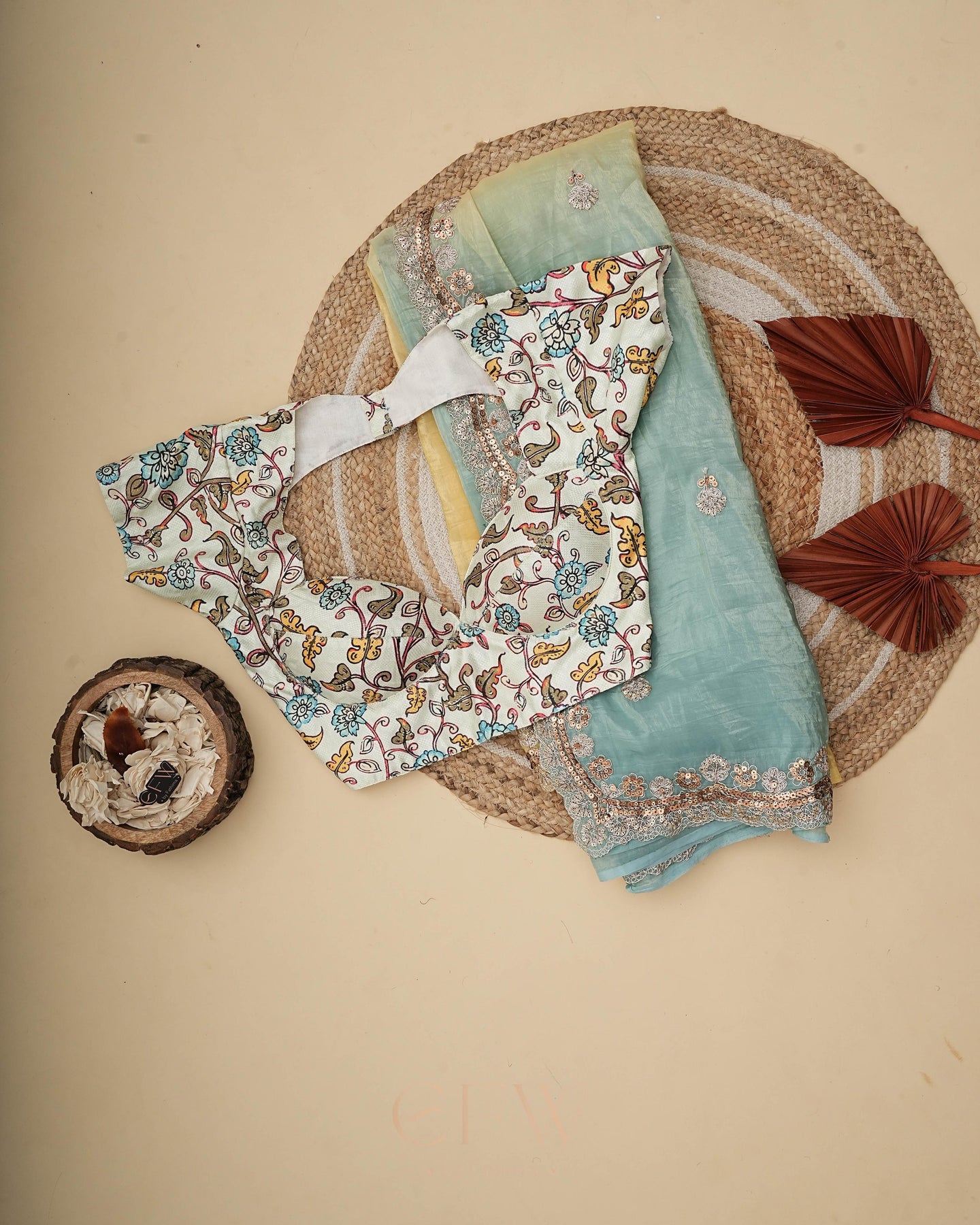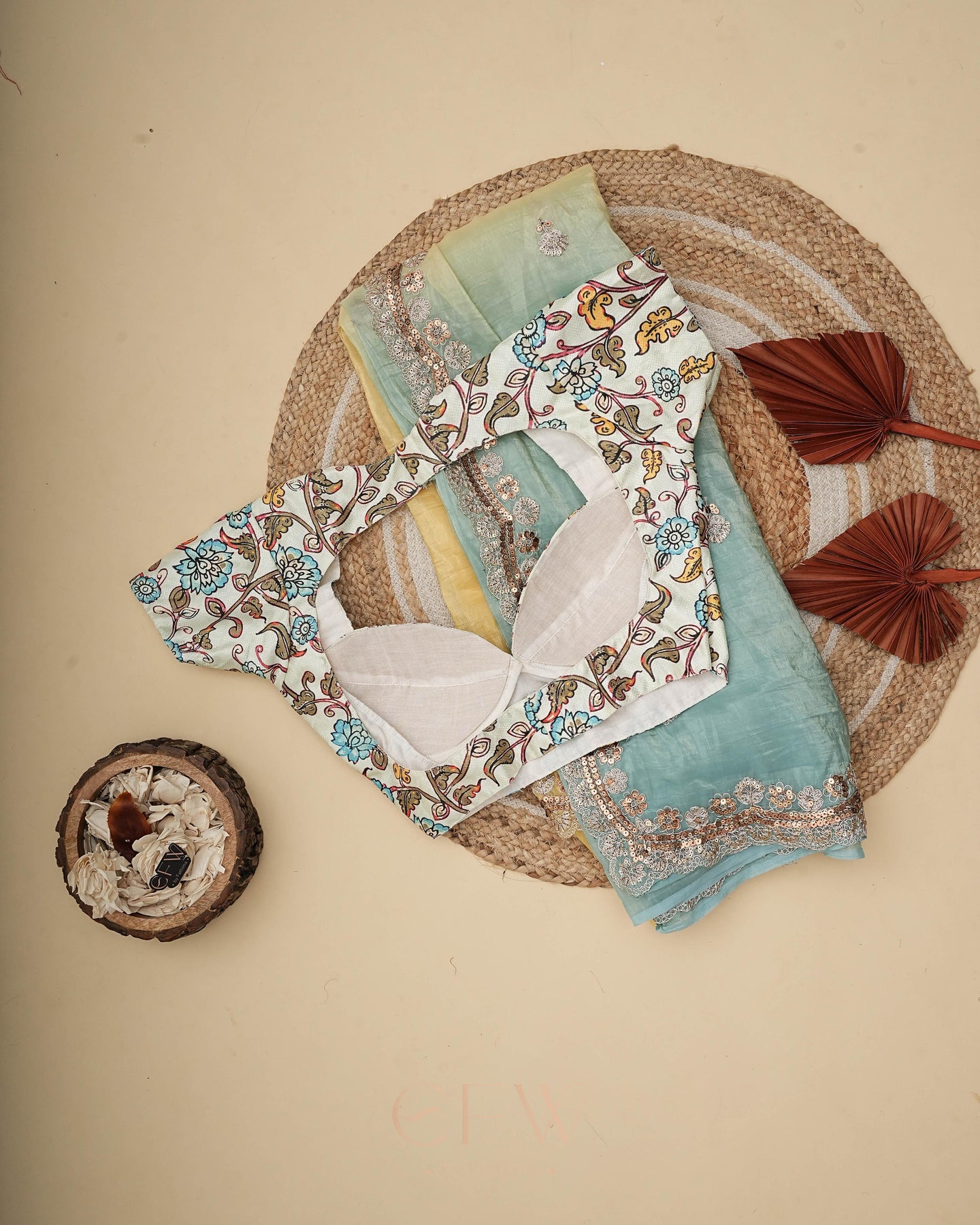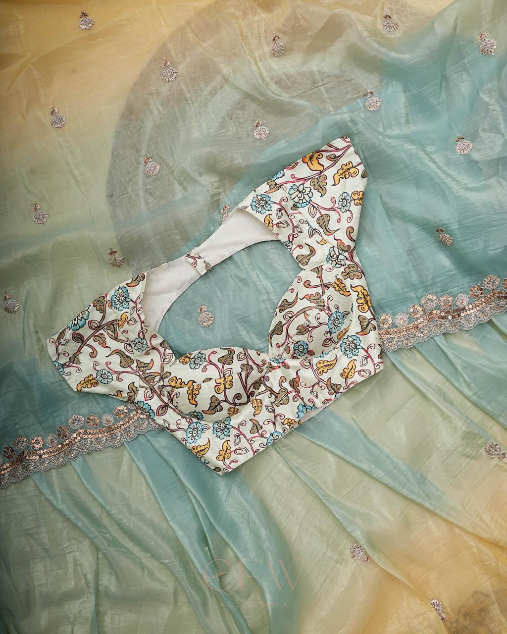 Paired with a vibrant multicolour floral blouse, the ensemble comes alive with hues of pinks, blues, and golds, making it the perfect balance of playful and sophisticated.