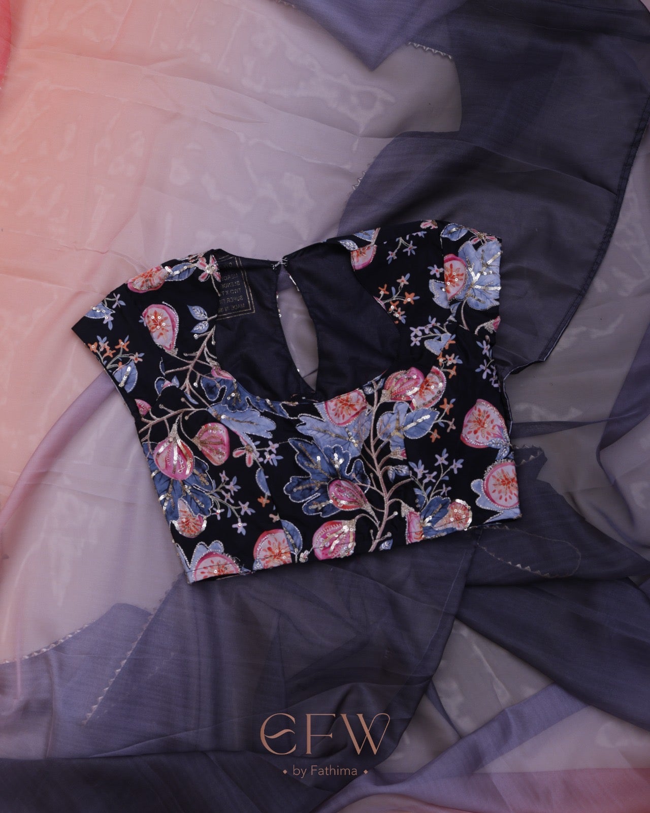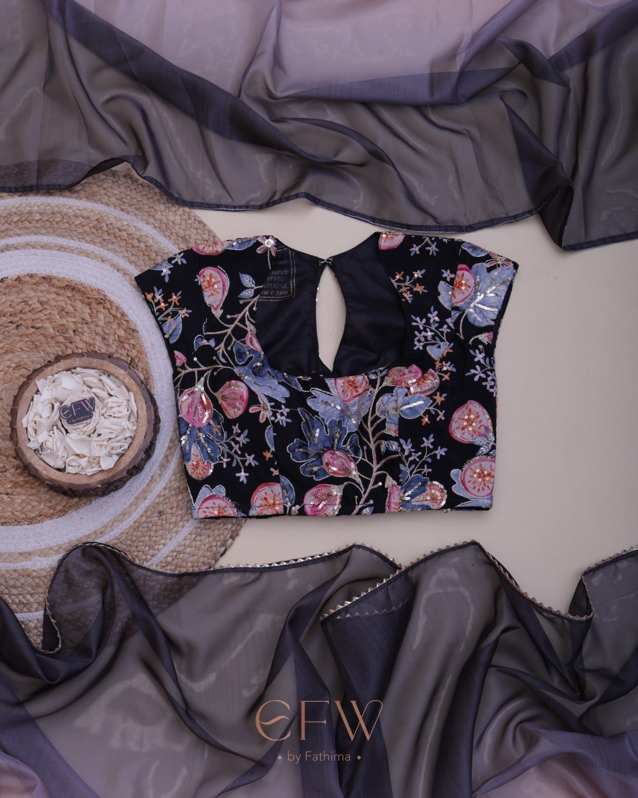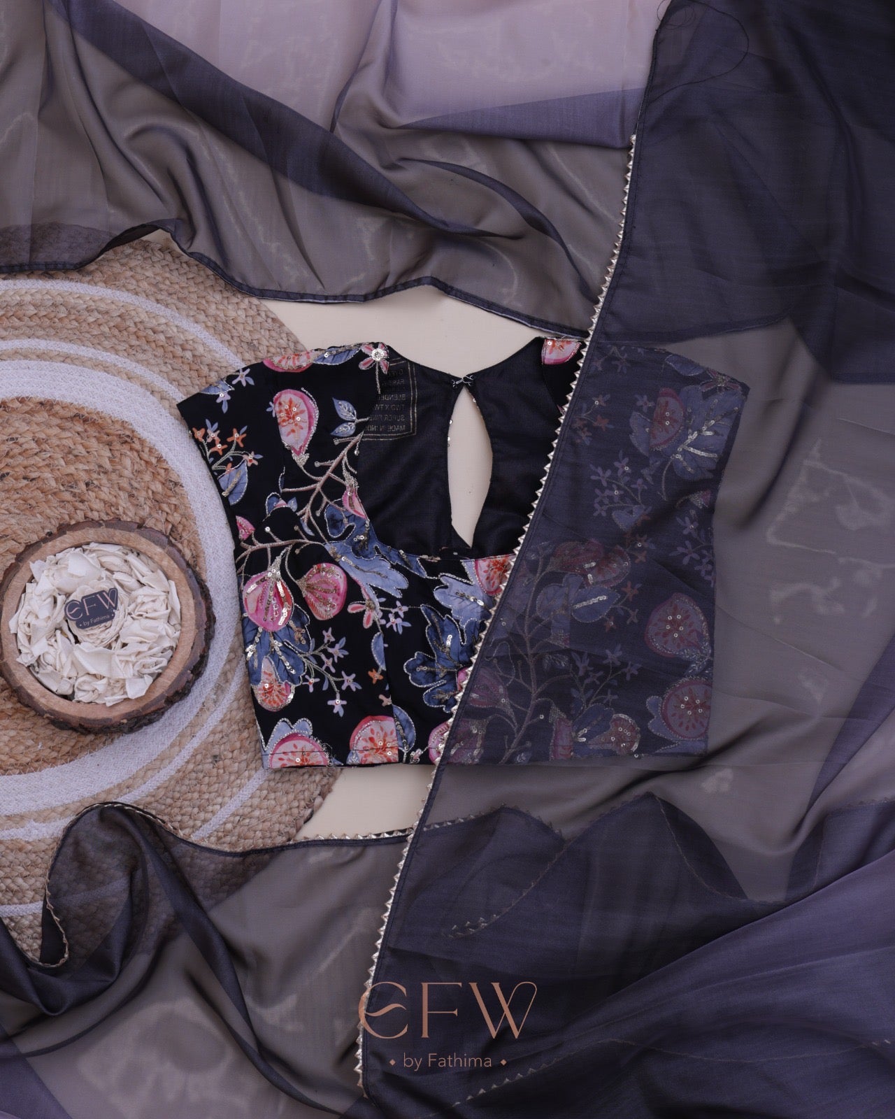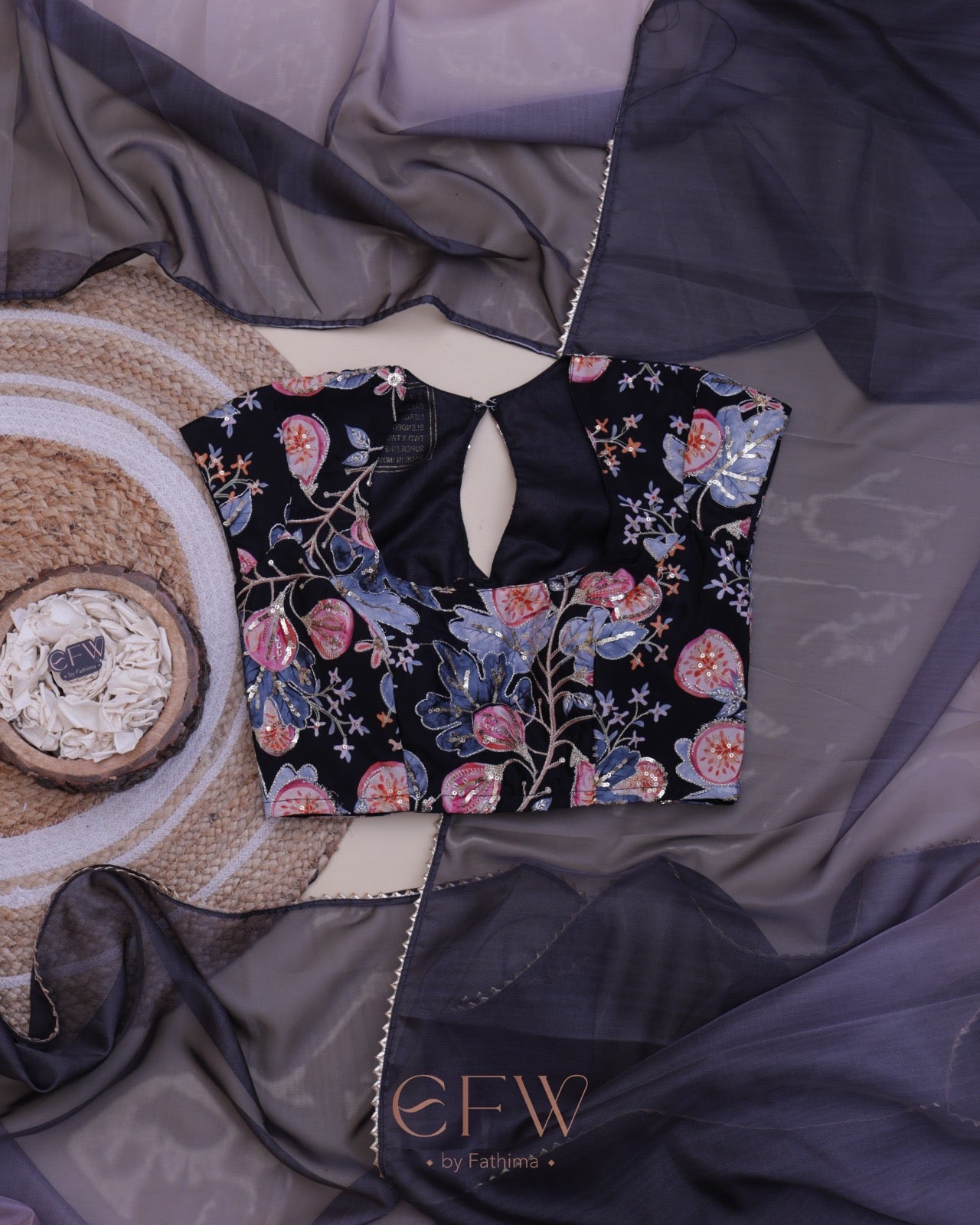 The saree’s delicate organza fabric, edged with subtle shimmer, is paired with a black blouse adorned in pastel floral embroidery—where shades of rose pink, lavender, and silver come alive in fine threadwork and sequins. The keyhole back design adds a hint of contemporary charm, balancing traditional artistry with modern sophistication.