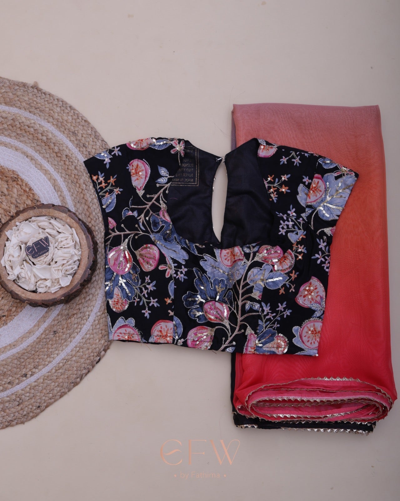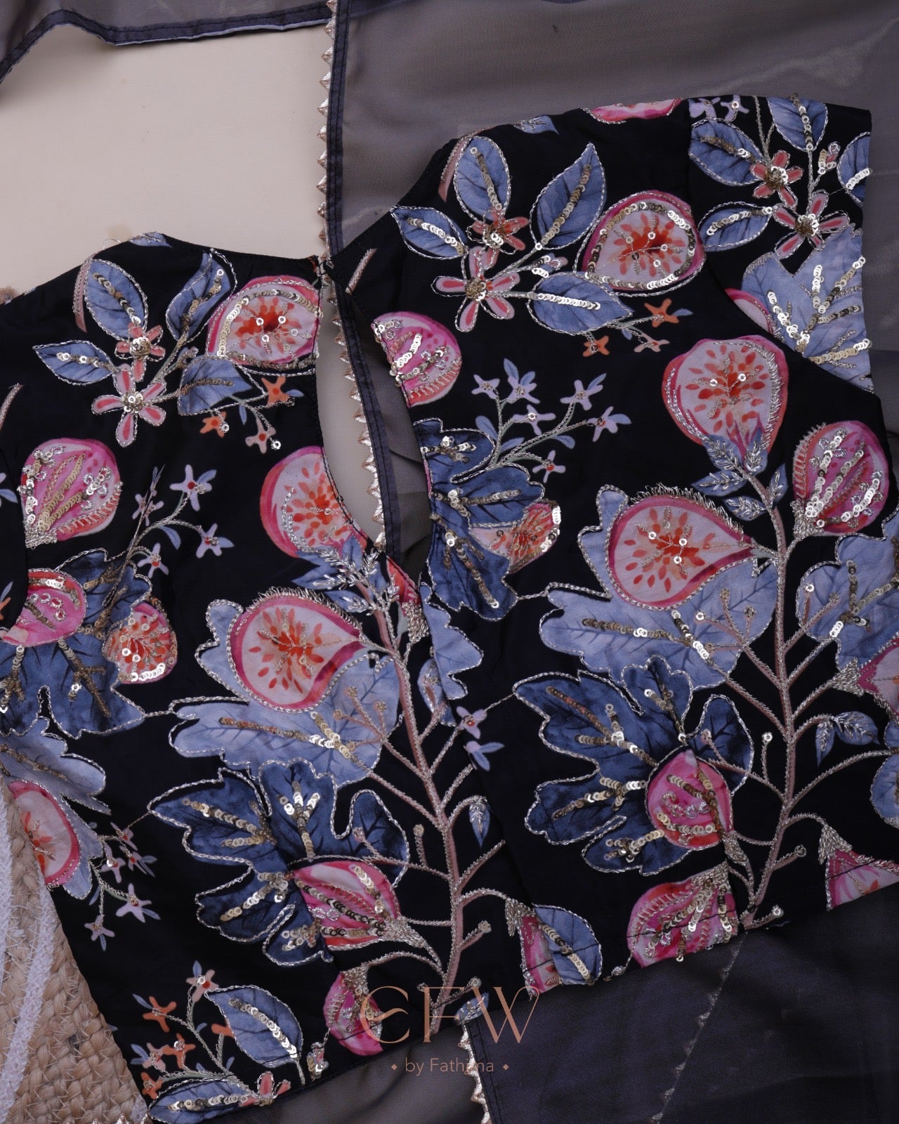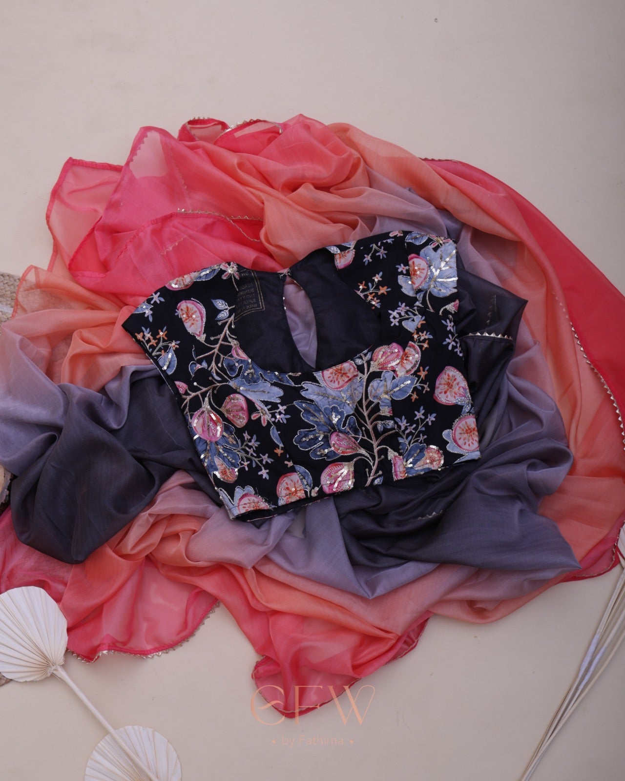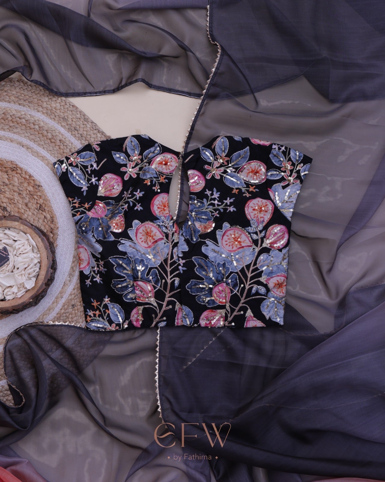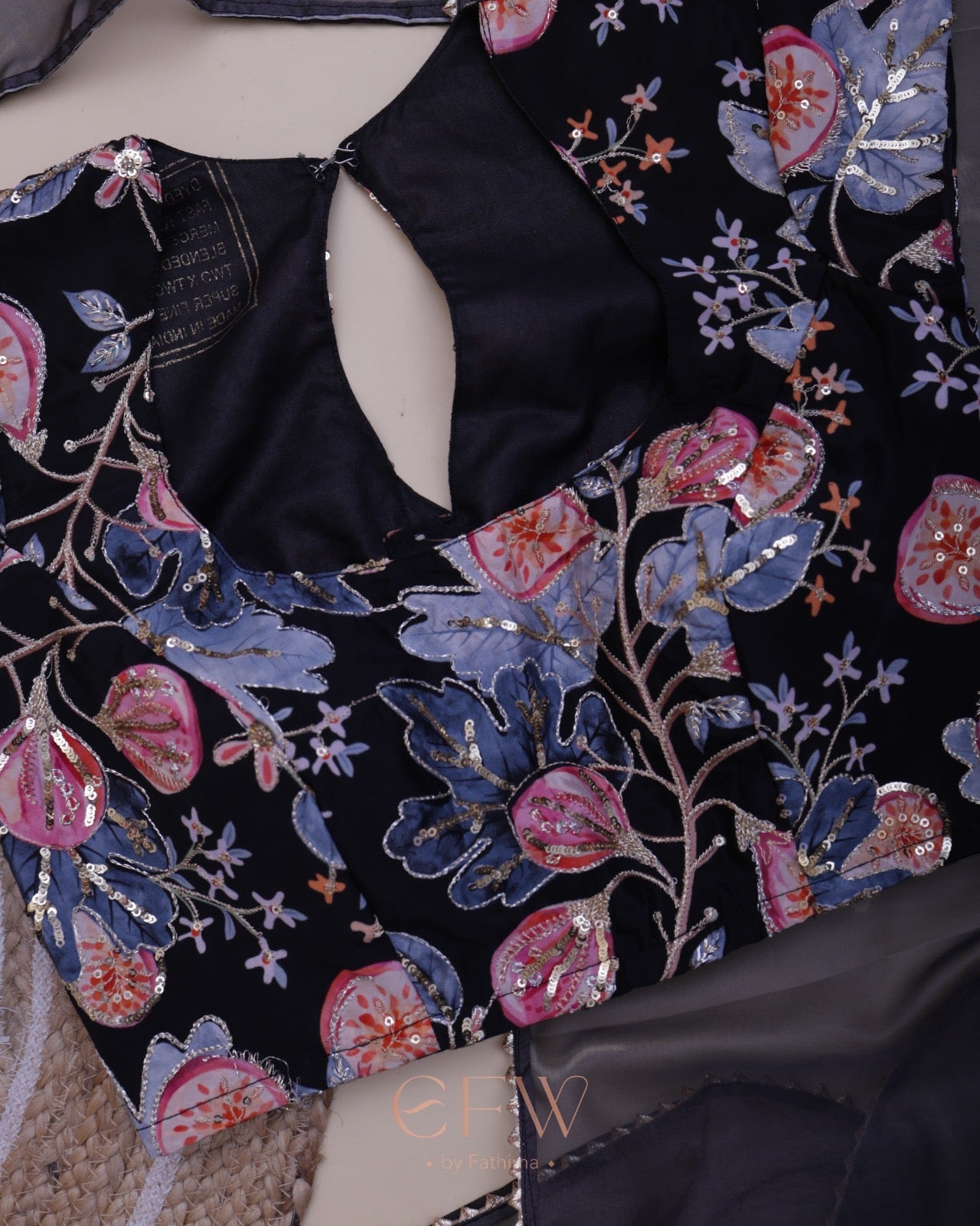 The saree’s delicate organza fabric, edged with subtle shimmer, is paired with a black blouse adorned in pastel floral embroidery—where shades of rose pink, lavender, and silver come alive in fine threadwork and sequins. The keyhole back design adds a hint of contemporary charm, balancing traditional artistry with modern sophistication.