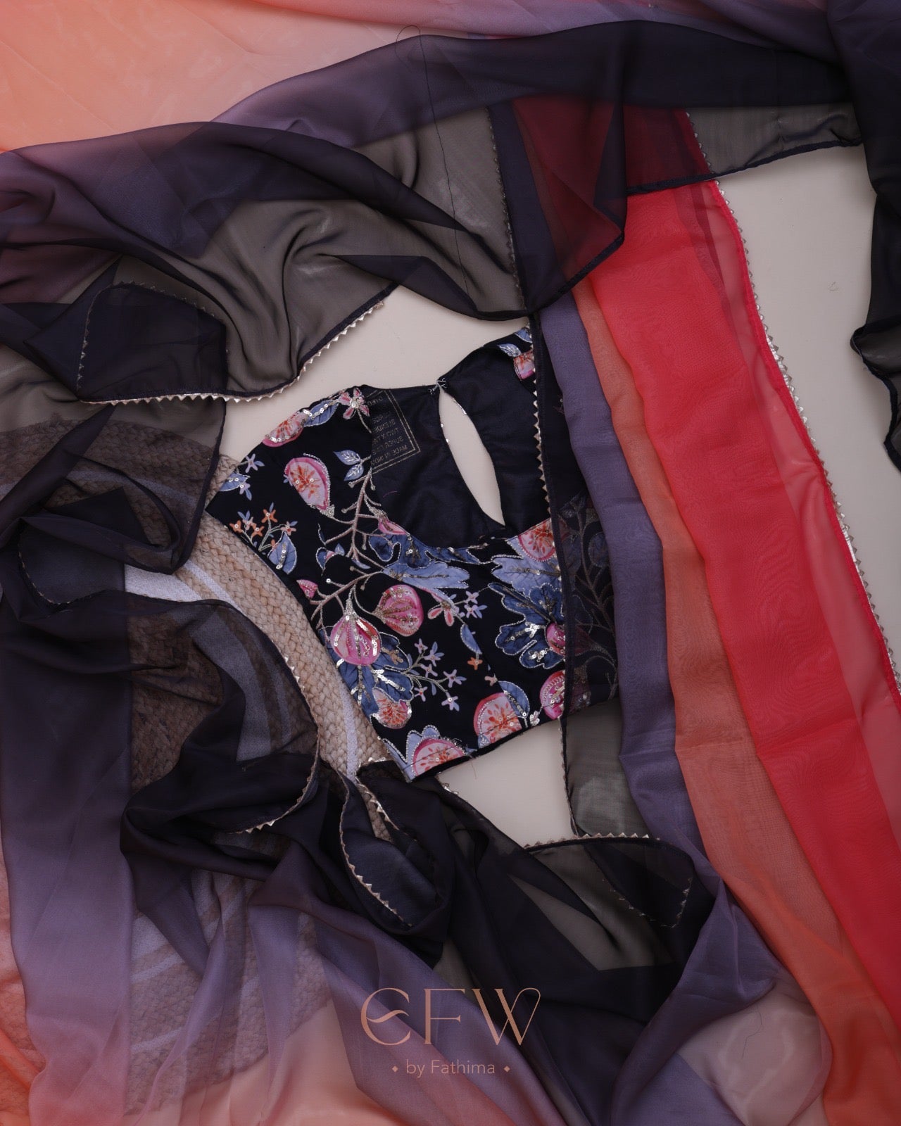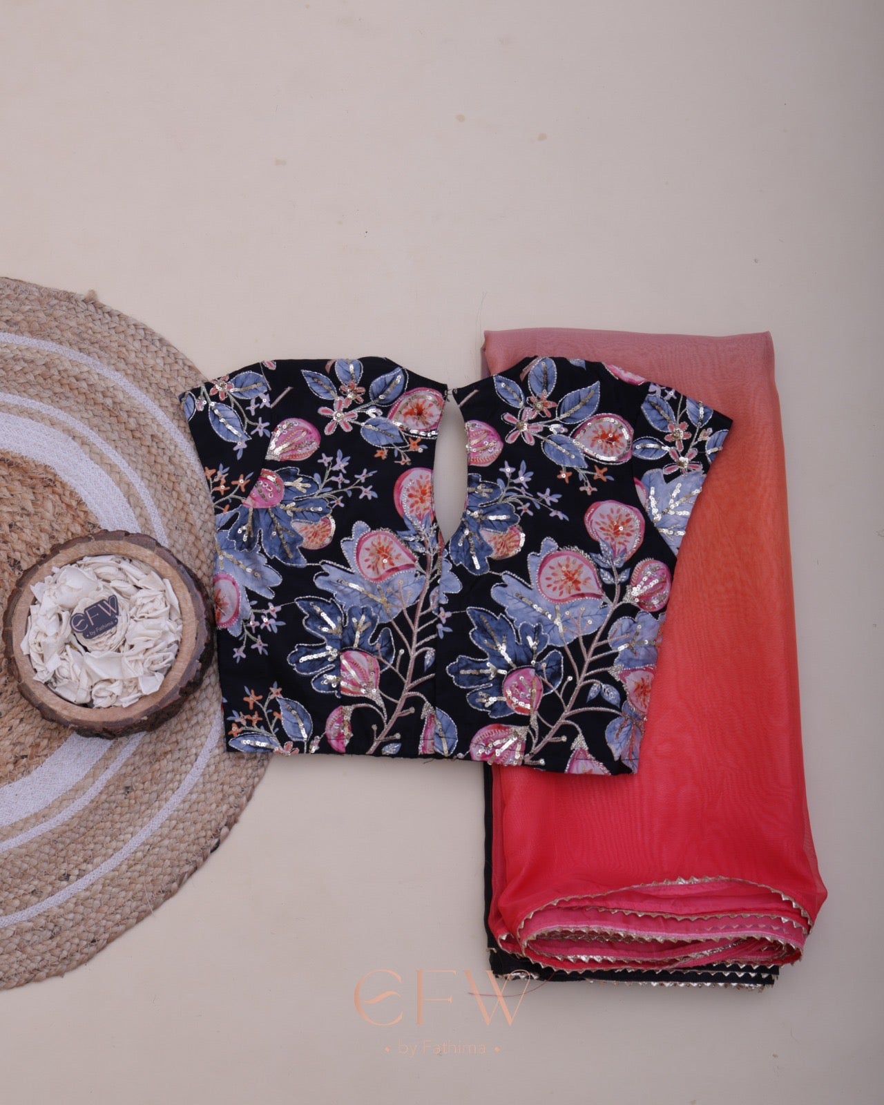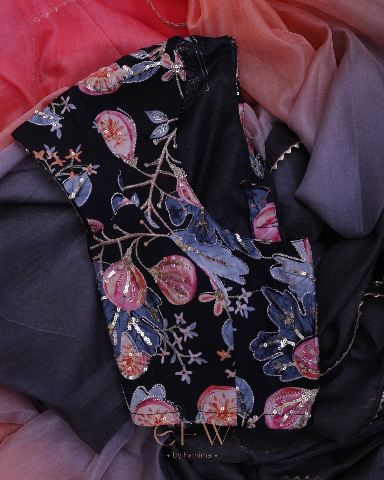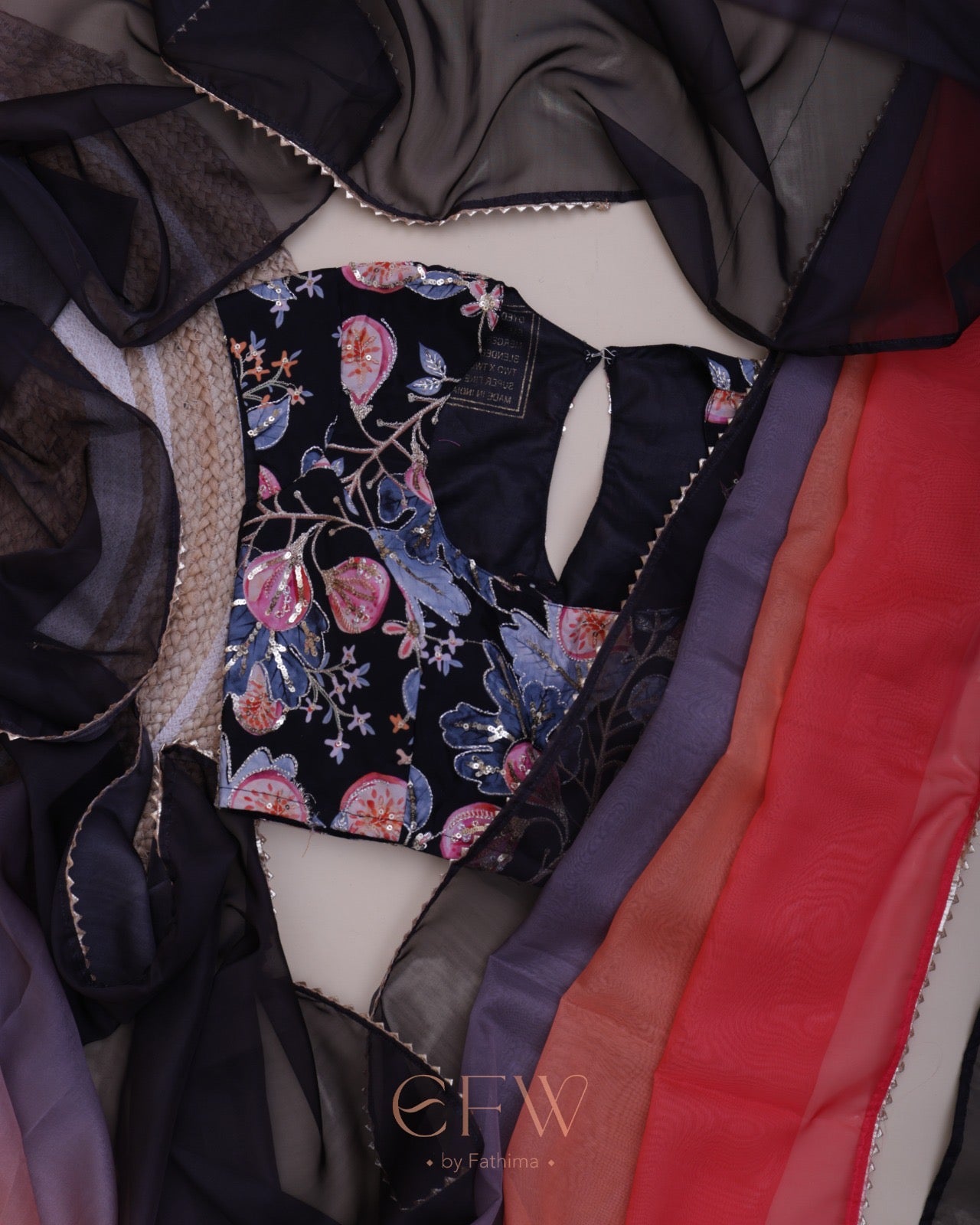 The saree’s delicate organza fabric, edged with subtle shimmer, is paired with a black blouse adorned in pastel floral embroidery—where shades of rose pink, lavender, and silver come alive in fine threadwork and sequins. The keyhole back design adds a hint of contemporary charm, balancing traditional artistry with modern sophistication.