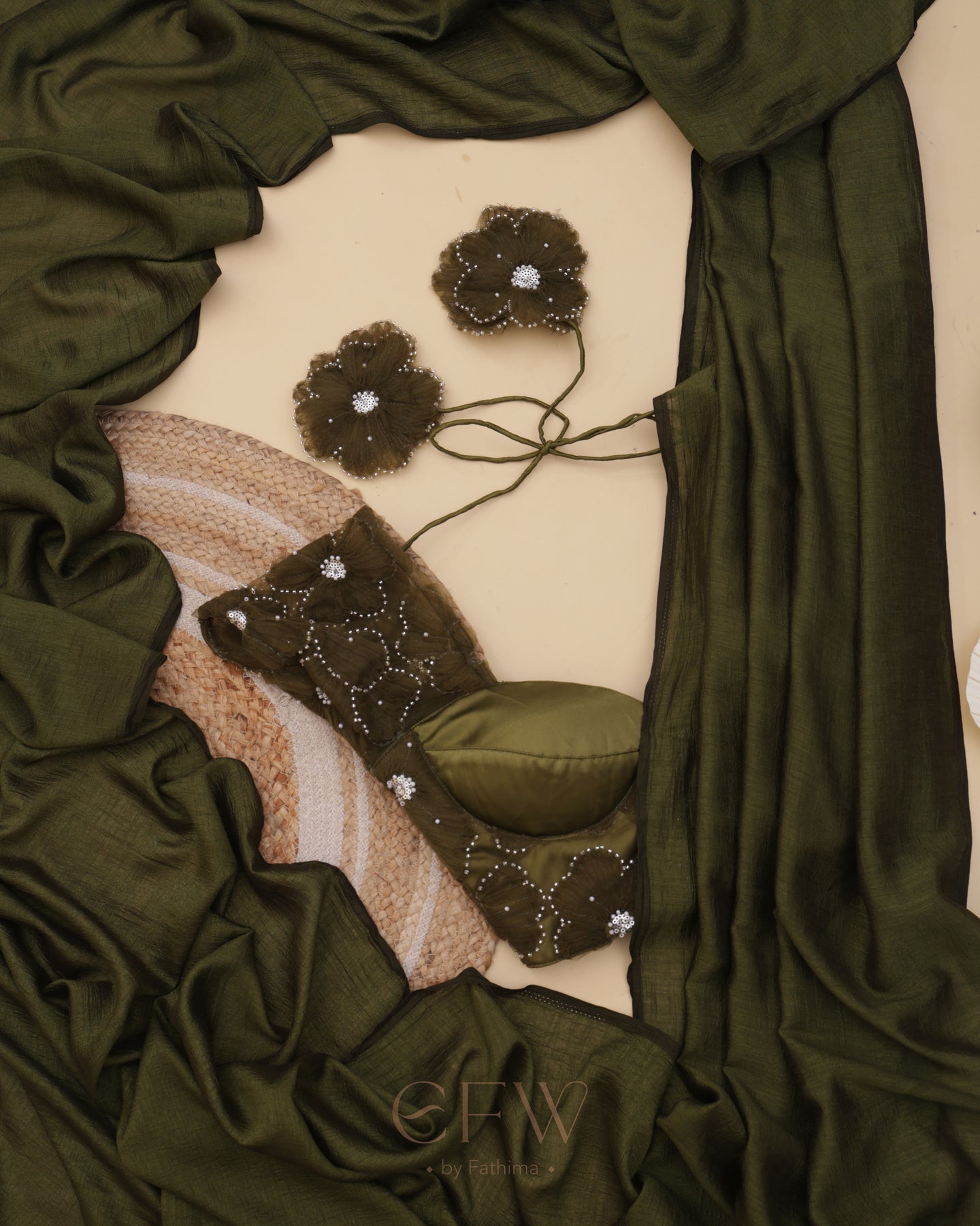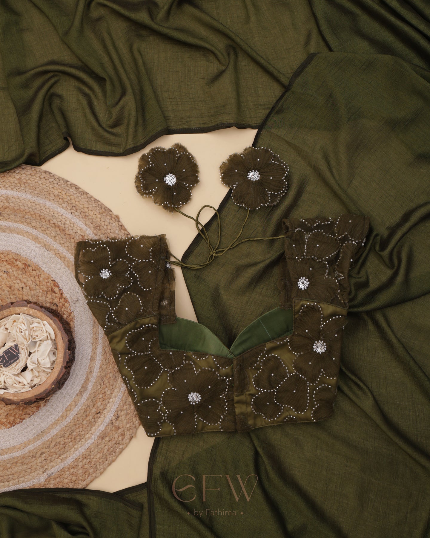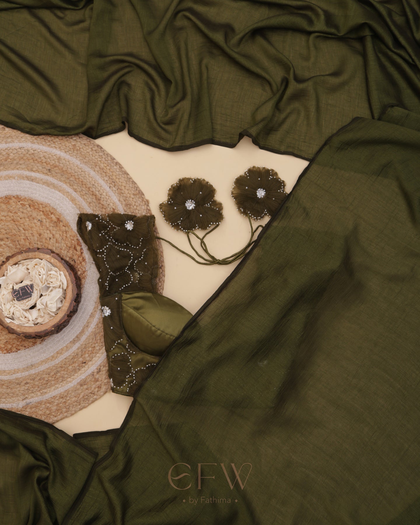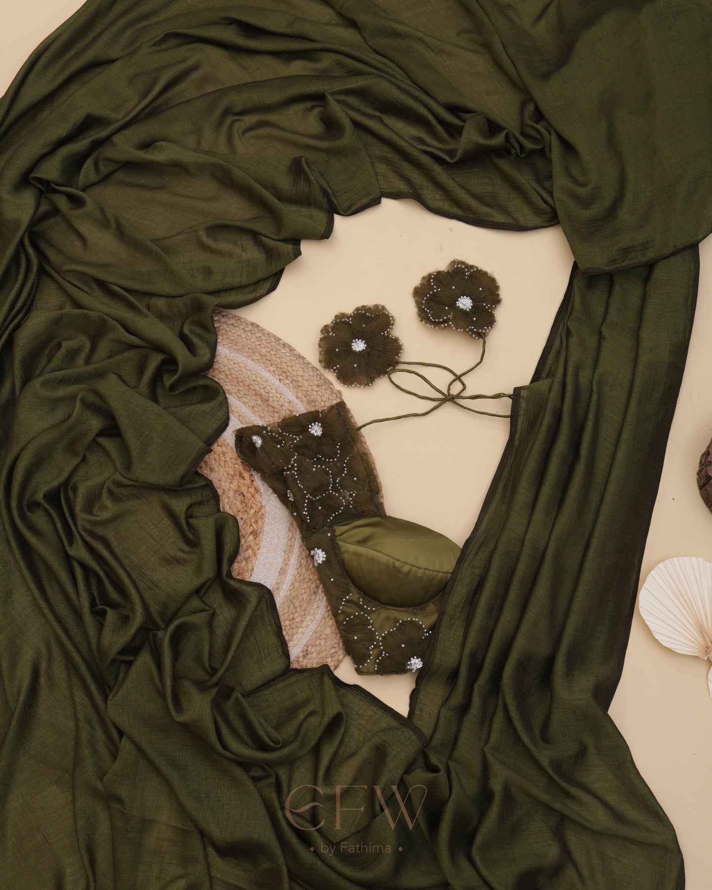 Presenting Shasha an exquisite olive green saree and blouse duo that fuses timeless tradition with contemporary elegance. Drenched in deep earthy hues, this ensemble is tailored for festive grandeur and poised celebrations.