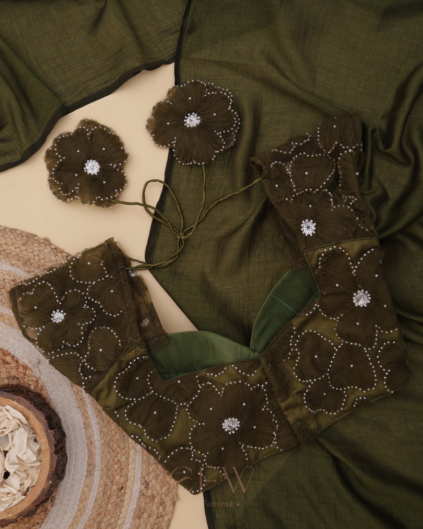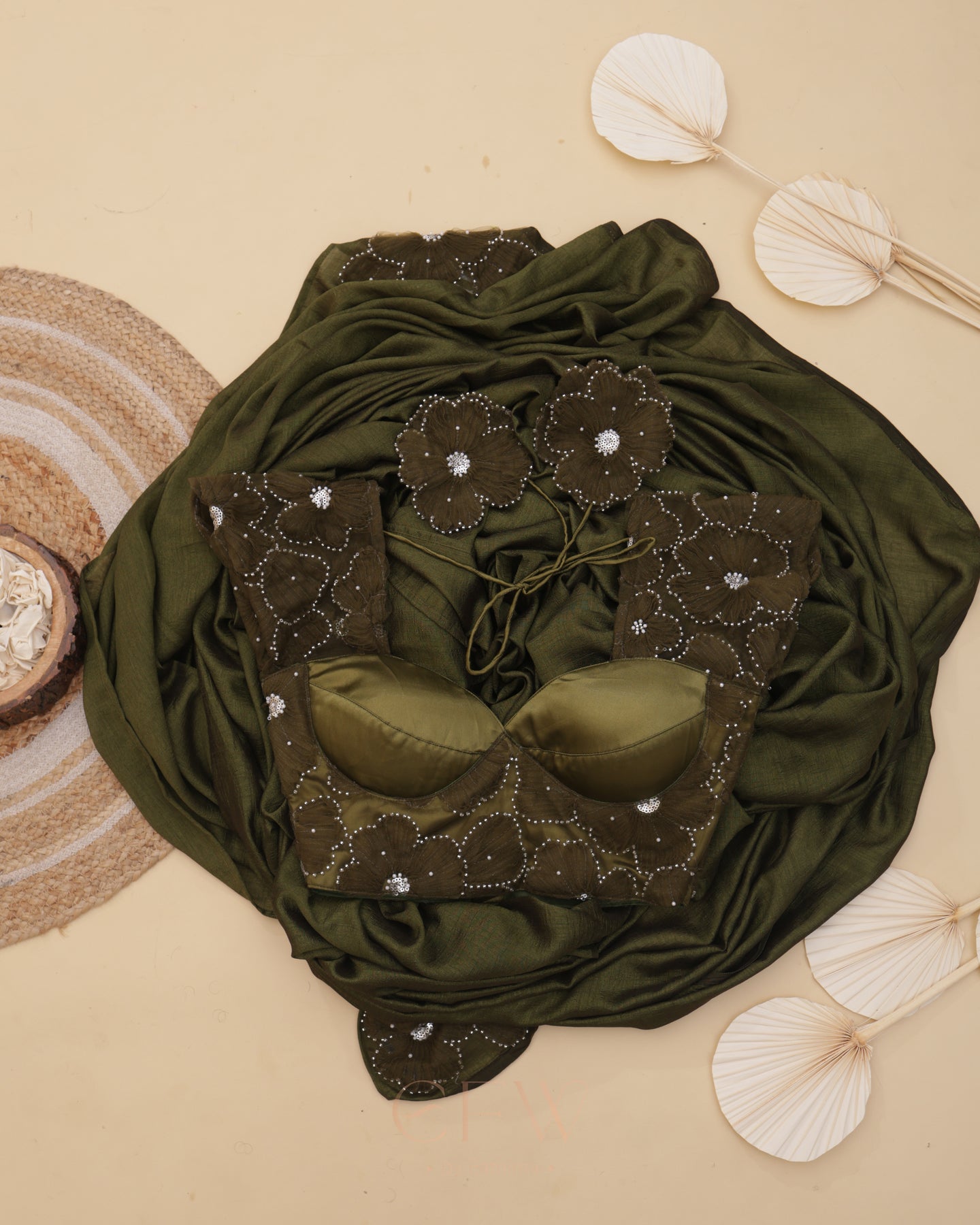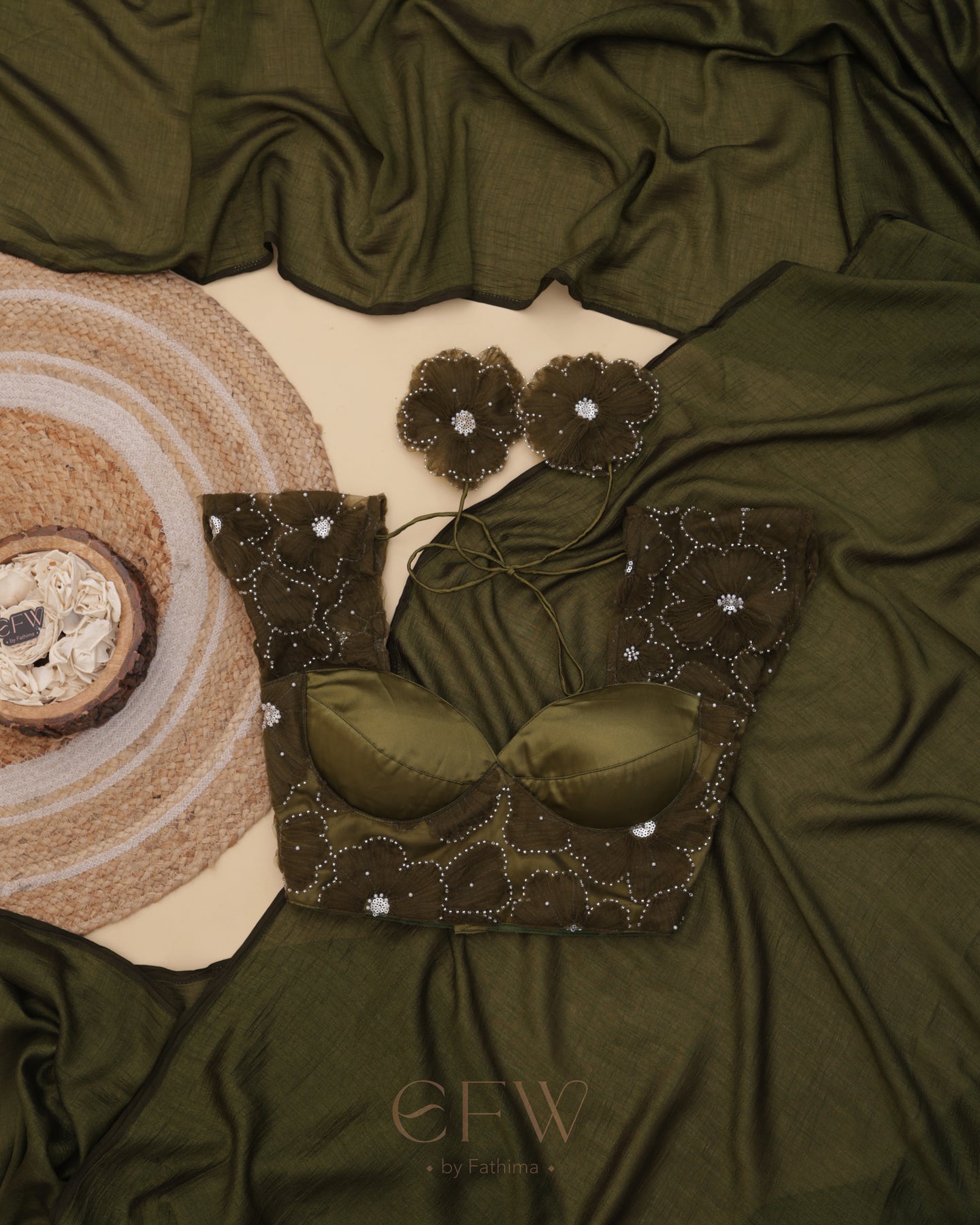 Presenting Shasha an exquisite olive green saree and blouse duo that fuses timeless tradition with contemporary elegance. Drenched in deep earthy hues, this ensemble is tailored for festive grandeur and poised celebrations.