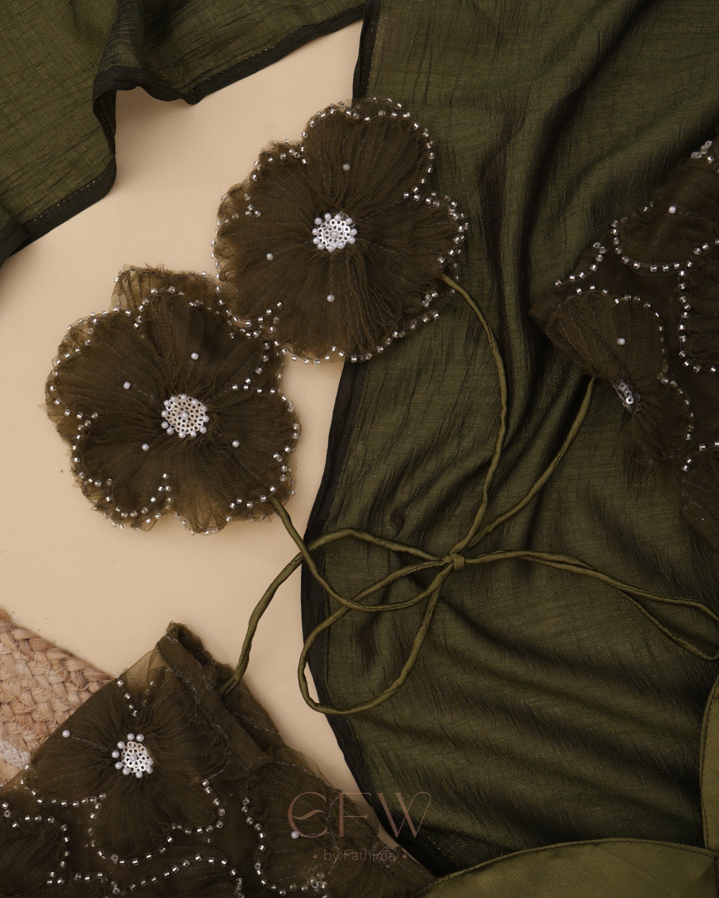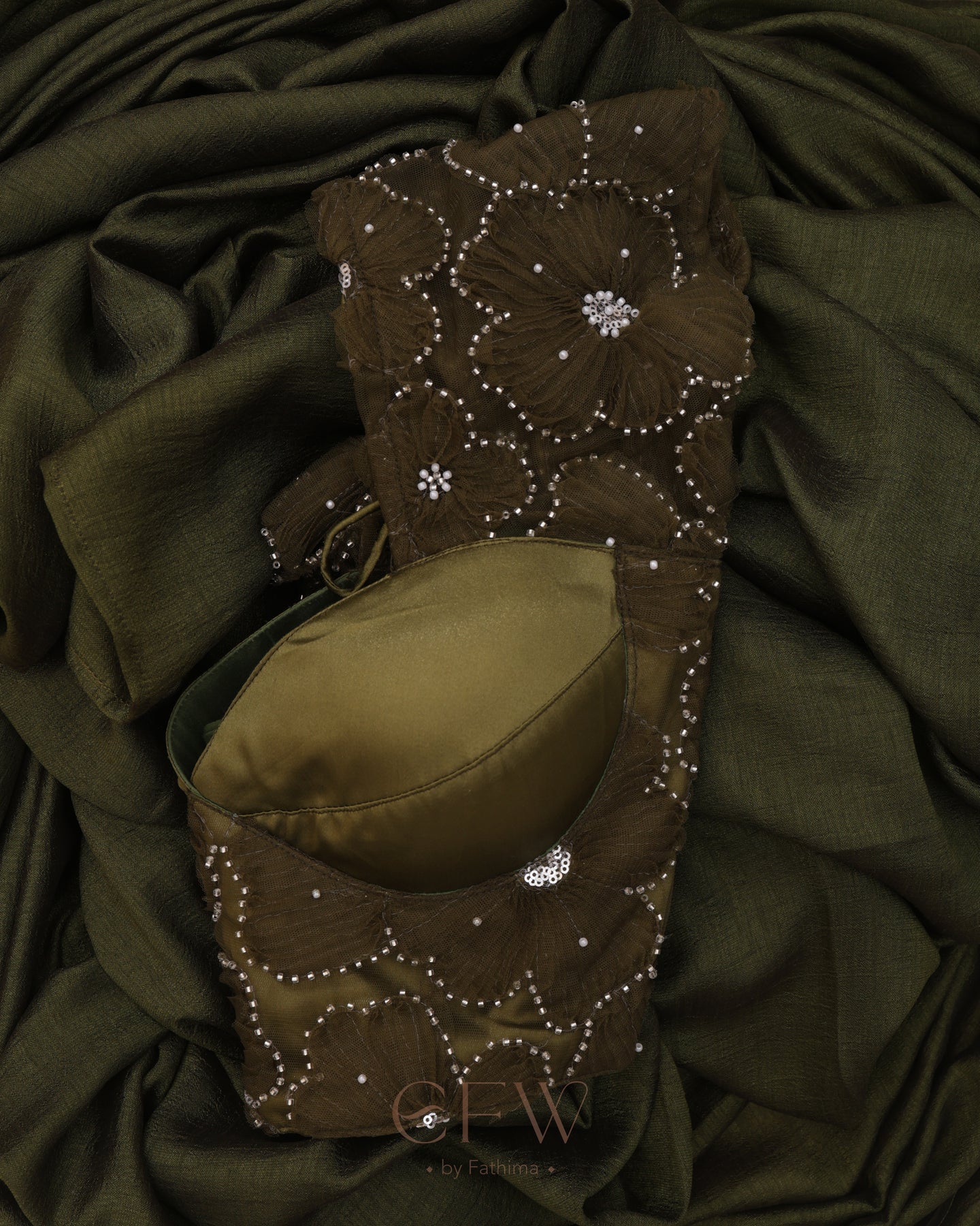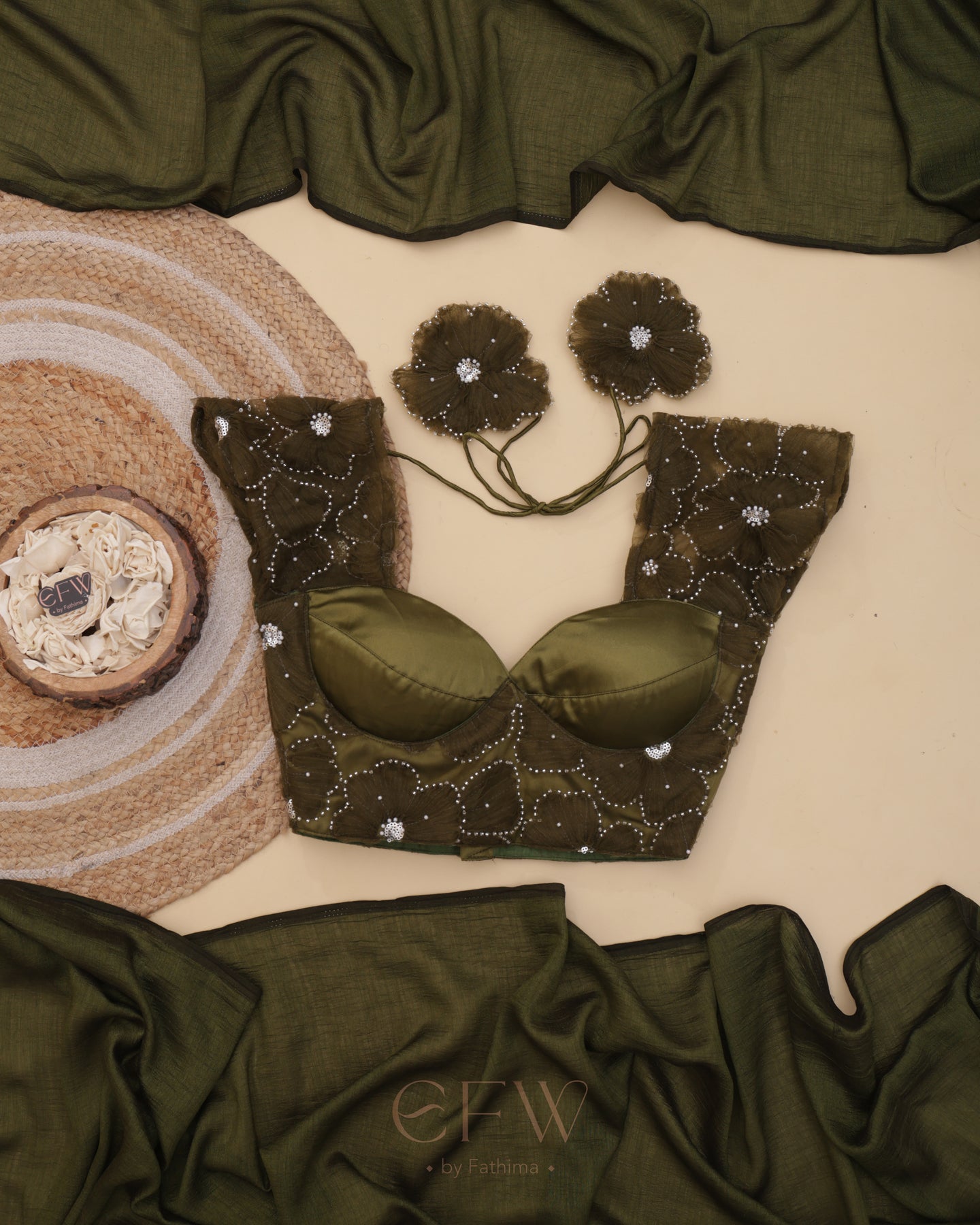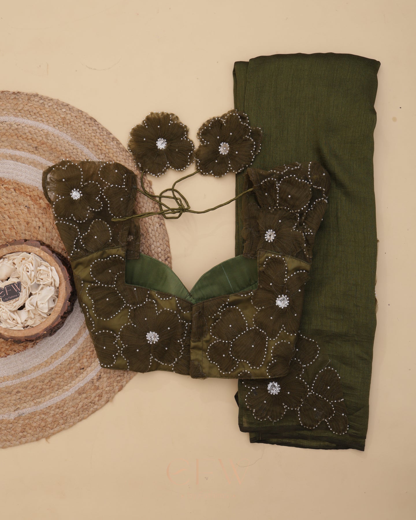 Presenting Shasha an exquisite olive green saree and blouse duo that fuses timeless tradition with contemporary elegance. Drenched in deep earthy hues, this ensemble is tailored for festive grandeur and poised celebrations.