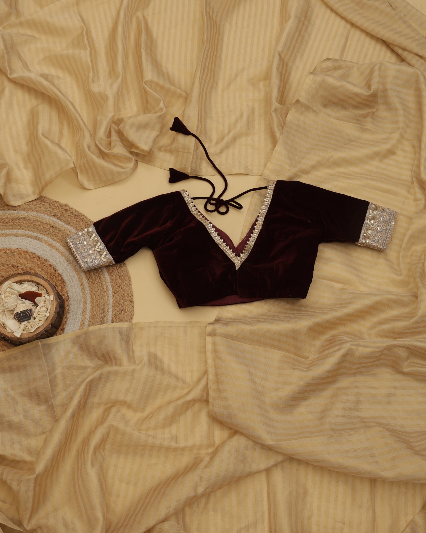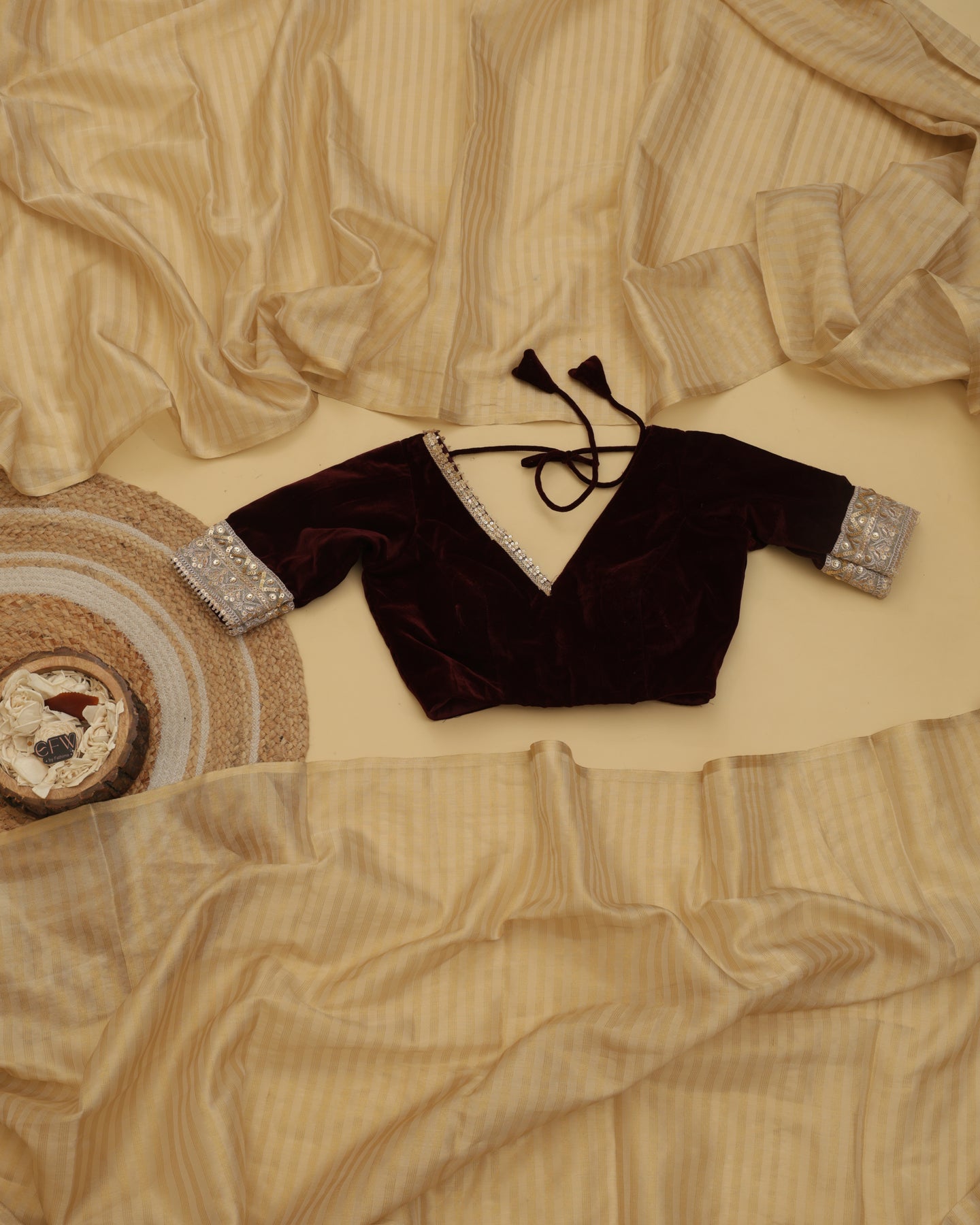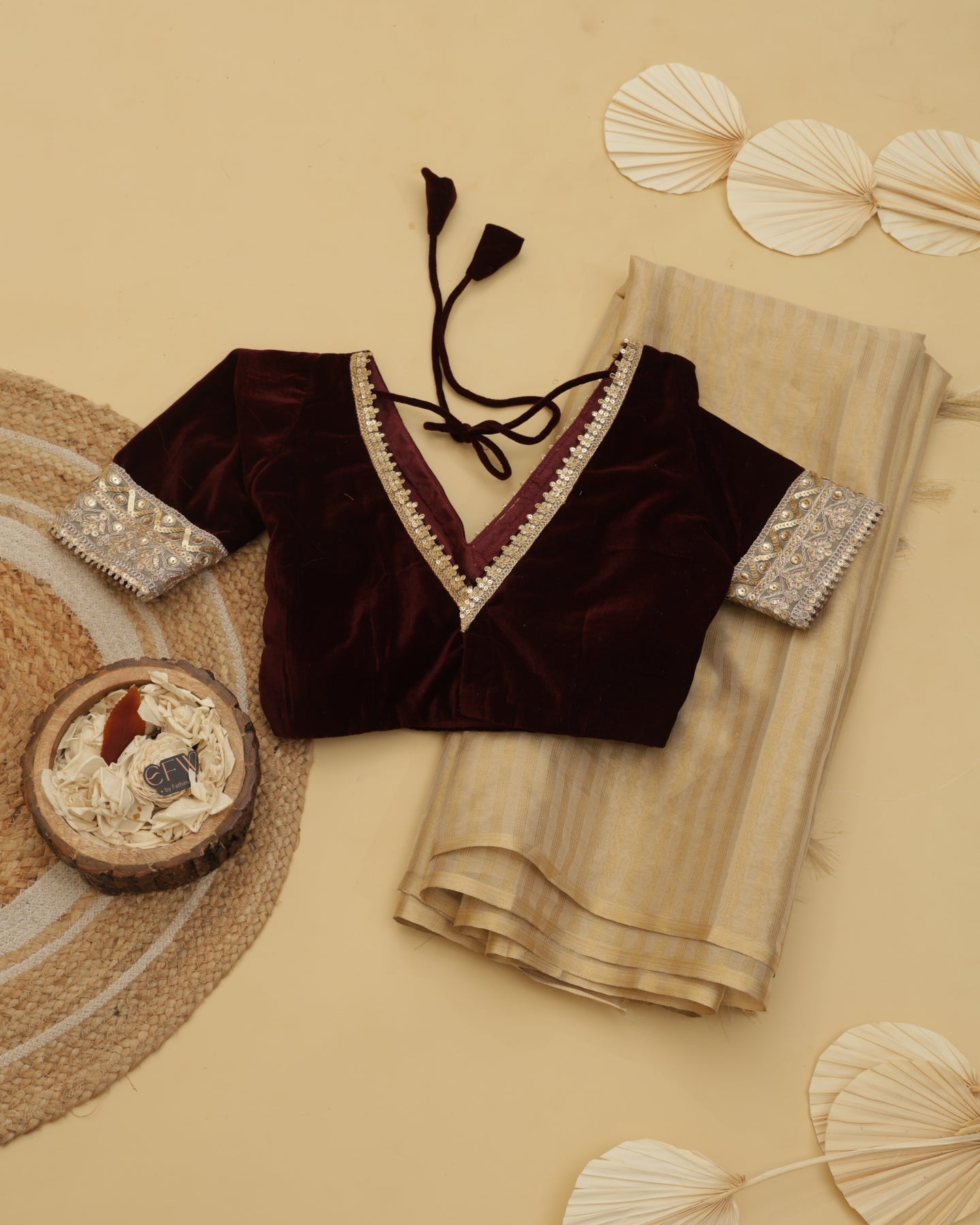 Paired with a rich maroon-hued velvet blouse, the contrast is bold yet regal. The blouse boasts a deep V neckline in the front with mirror embroidery along the border and a tie-back design that flatters the back with minimal elegance. The elbow sleeves are finished with intricately hand-embroidered mirror and embroidery cuff detailing — creating a statement of craftsmanship and class.