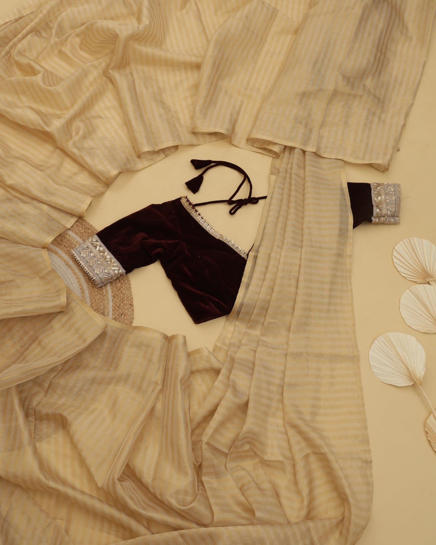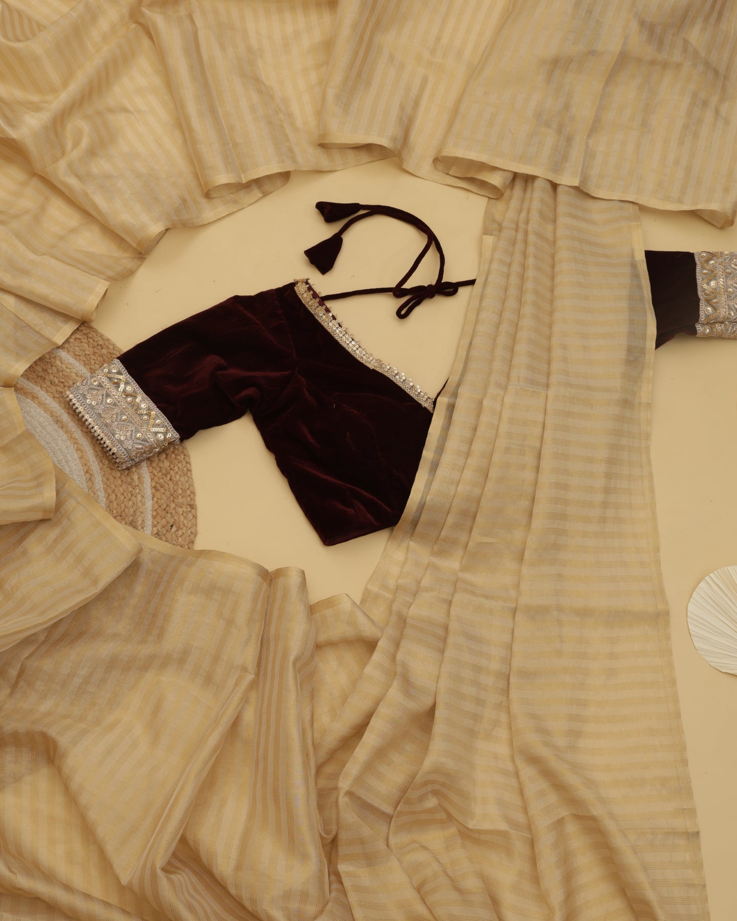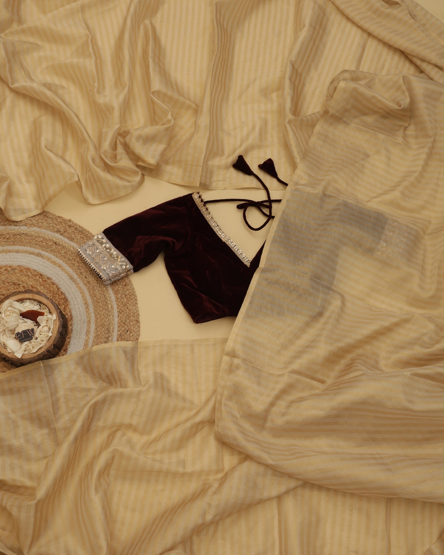 Embrace the luminous grace of the festive season with Thaara Luxe — a striking celebration of Kerala’s traditional essence and contemporary poise. The saree features soft ivory and golden striped weave, reminiscent of the classic kasavu, with a lightweight texture that allows it to drape like liquid gold — perfect for the warmth and joy of Onam.