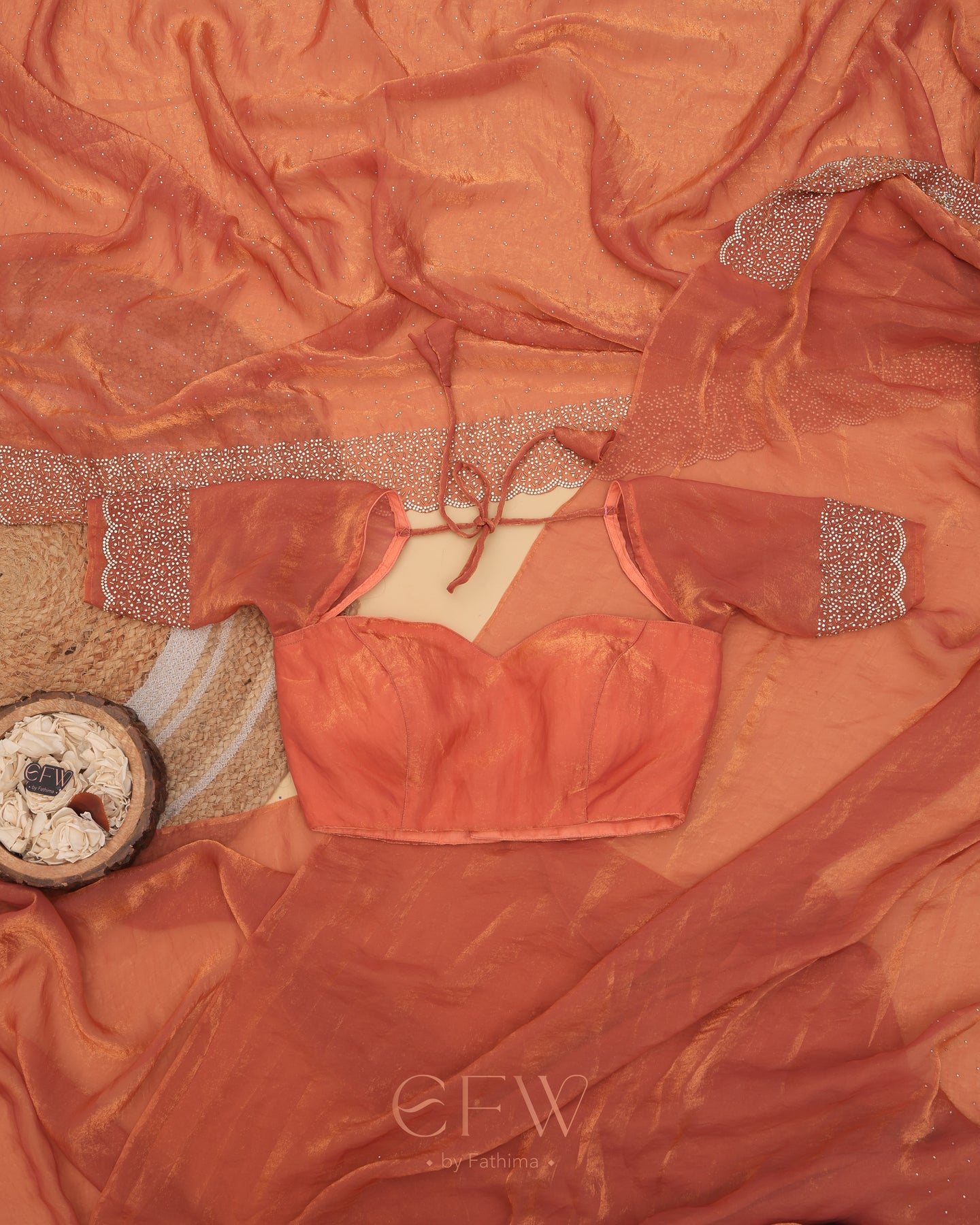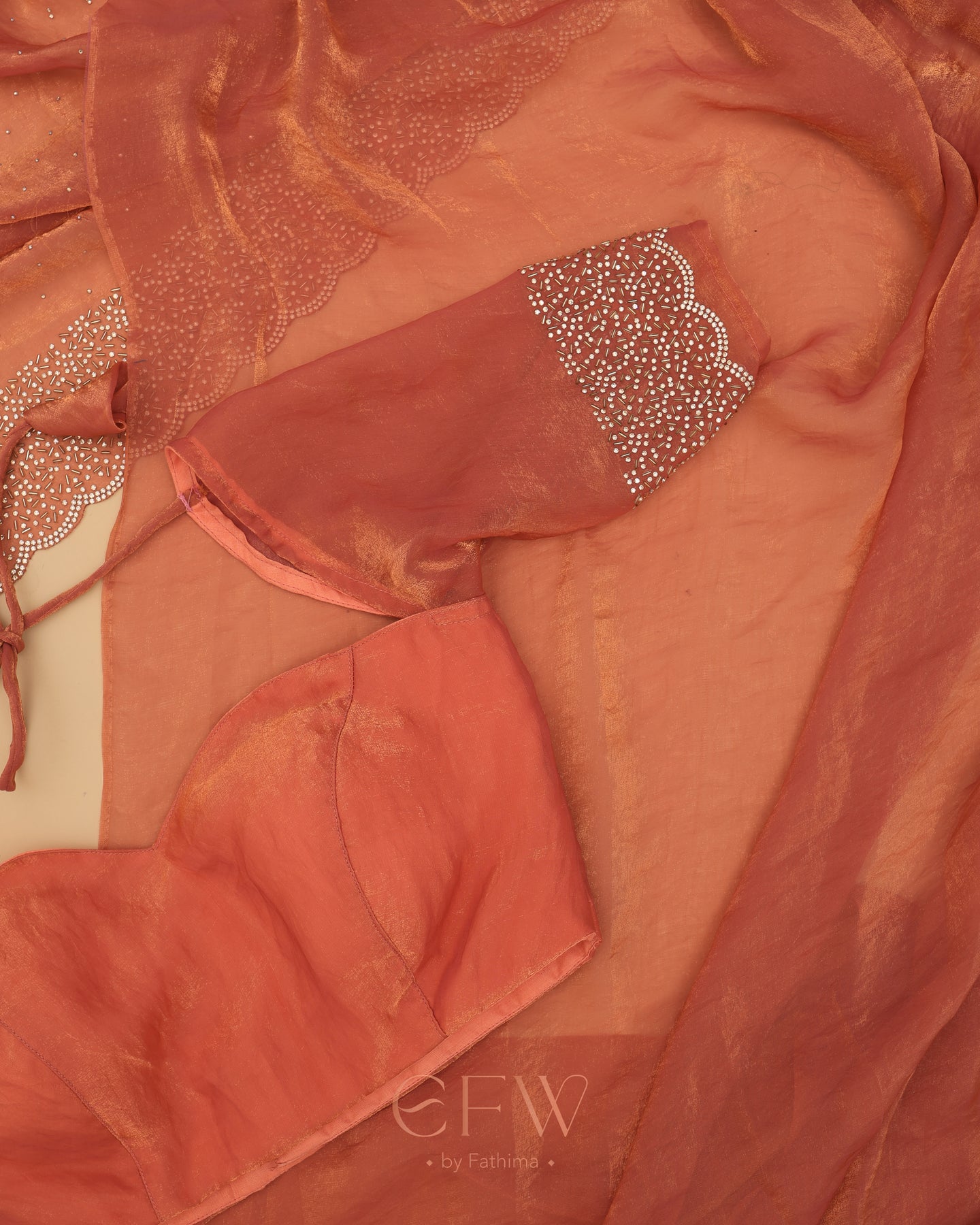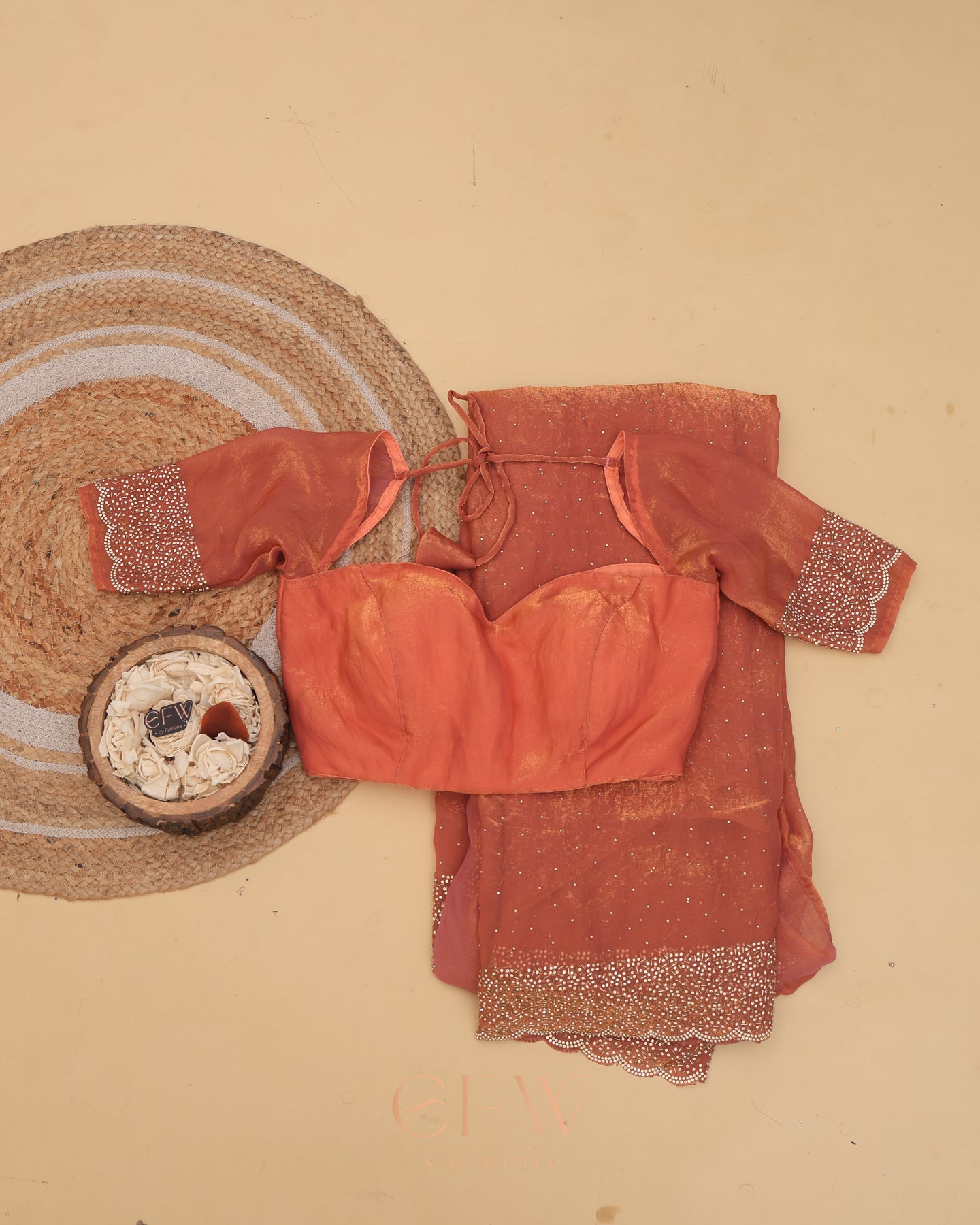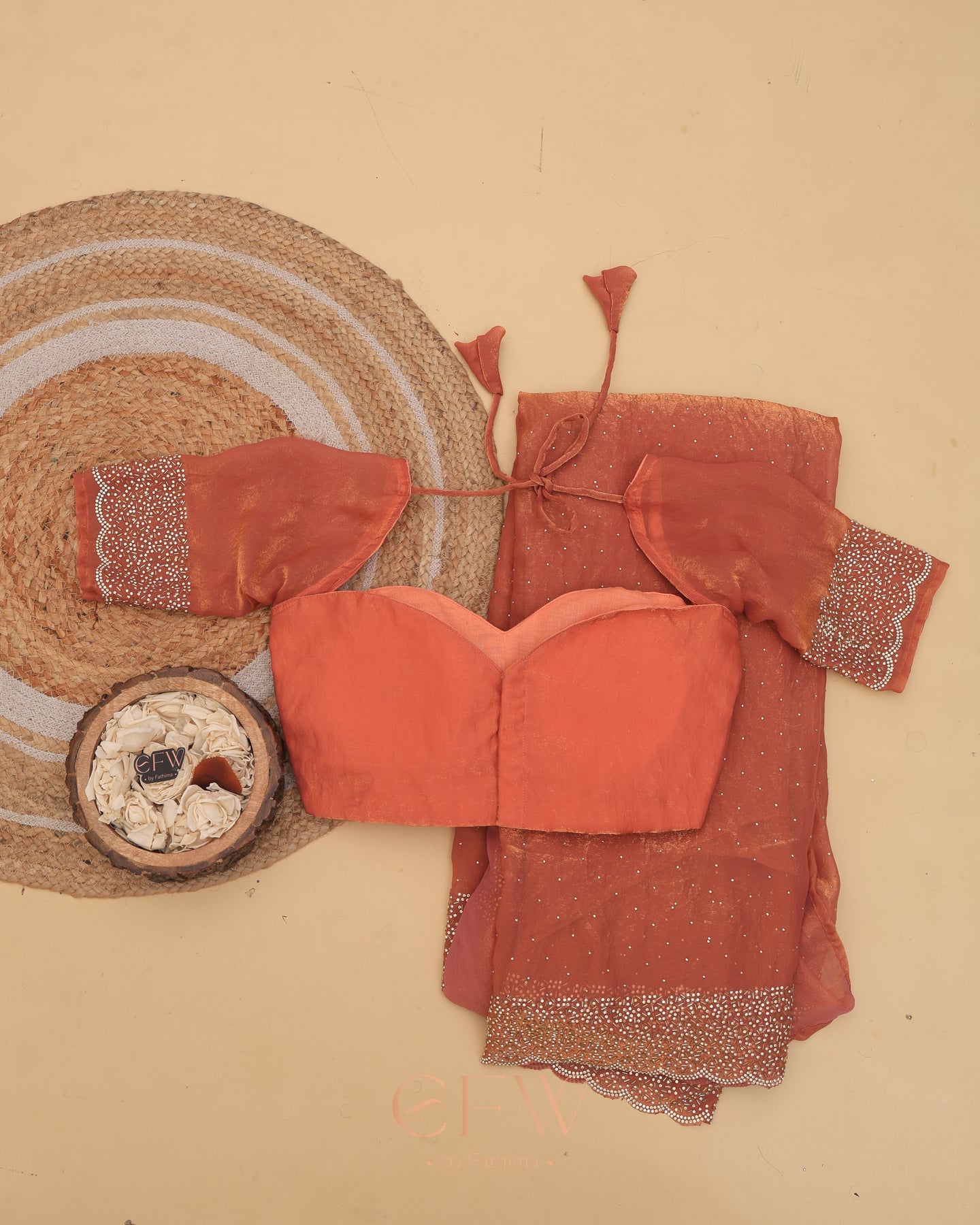 Adorned with intricate stonework throughout, this semi tissue silk saree flows effortlessly and features a beautifully detailed border that adds just the right touch of grace. Available in a range of stunning shades, it’s perfect for parties, weddings, and all your special events.