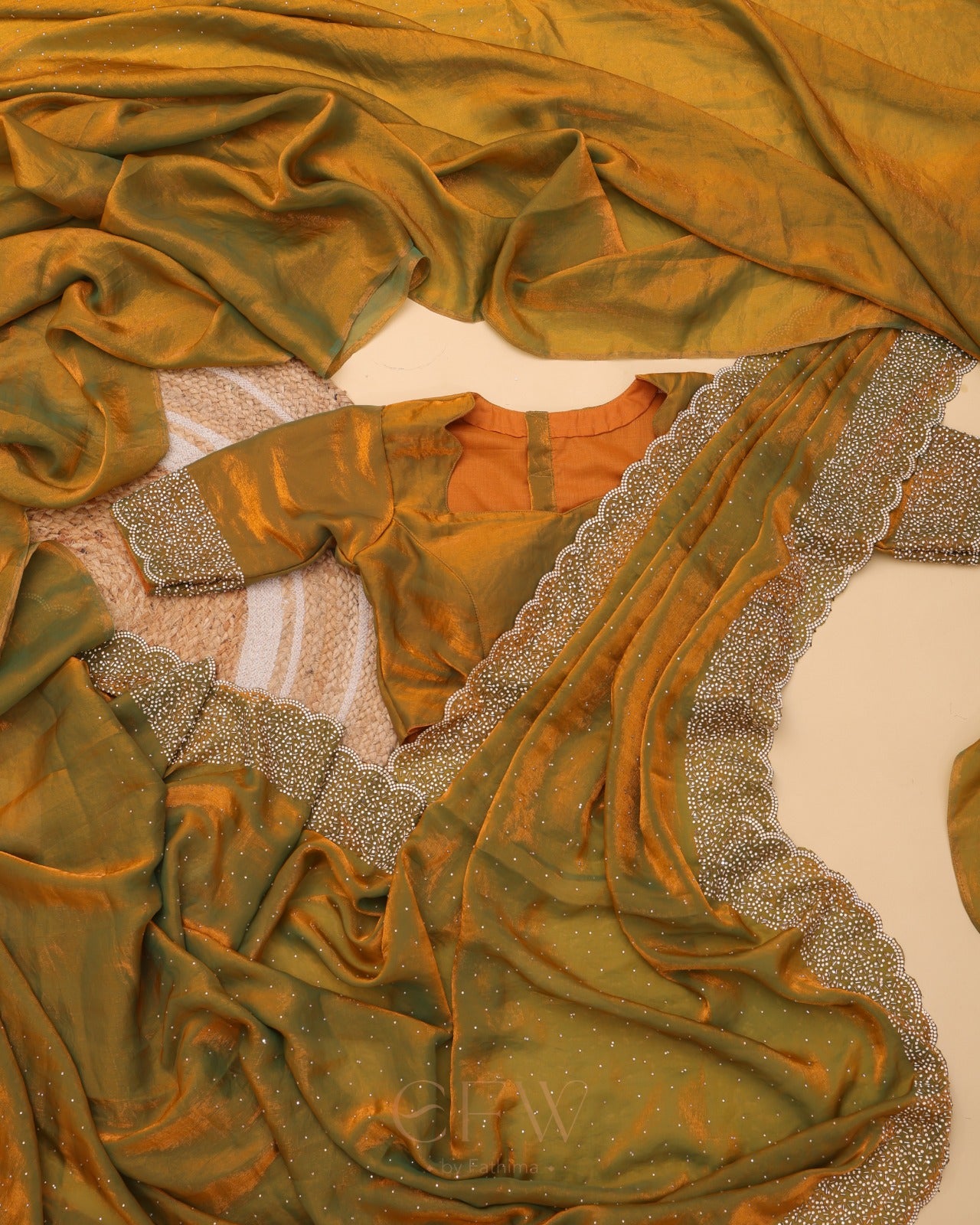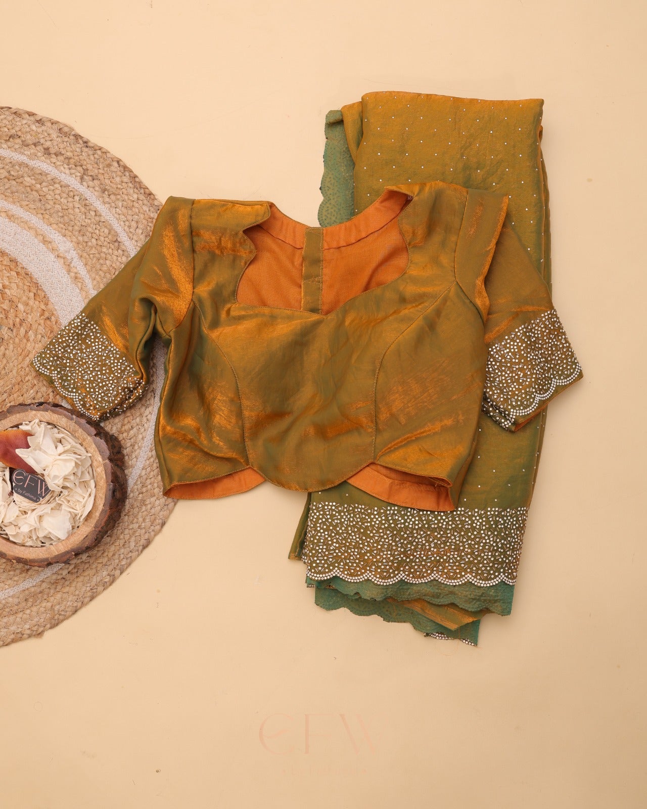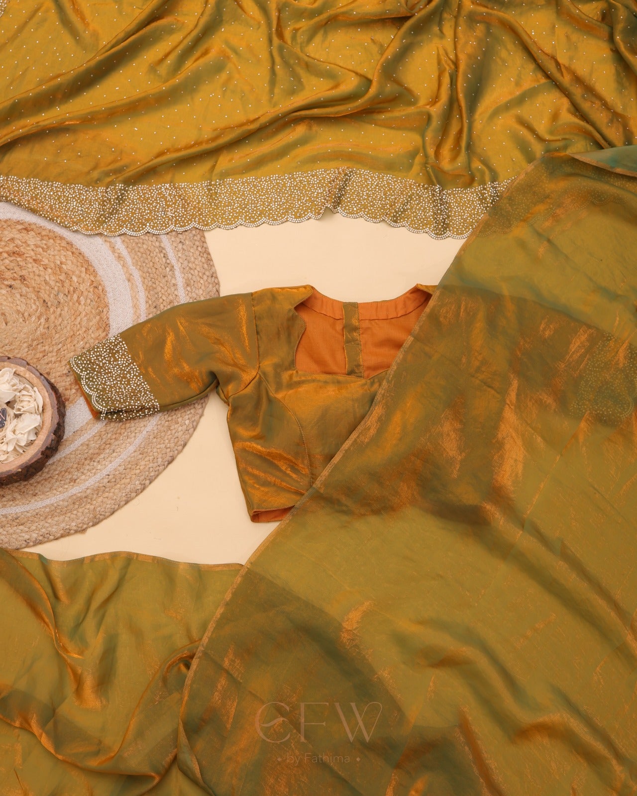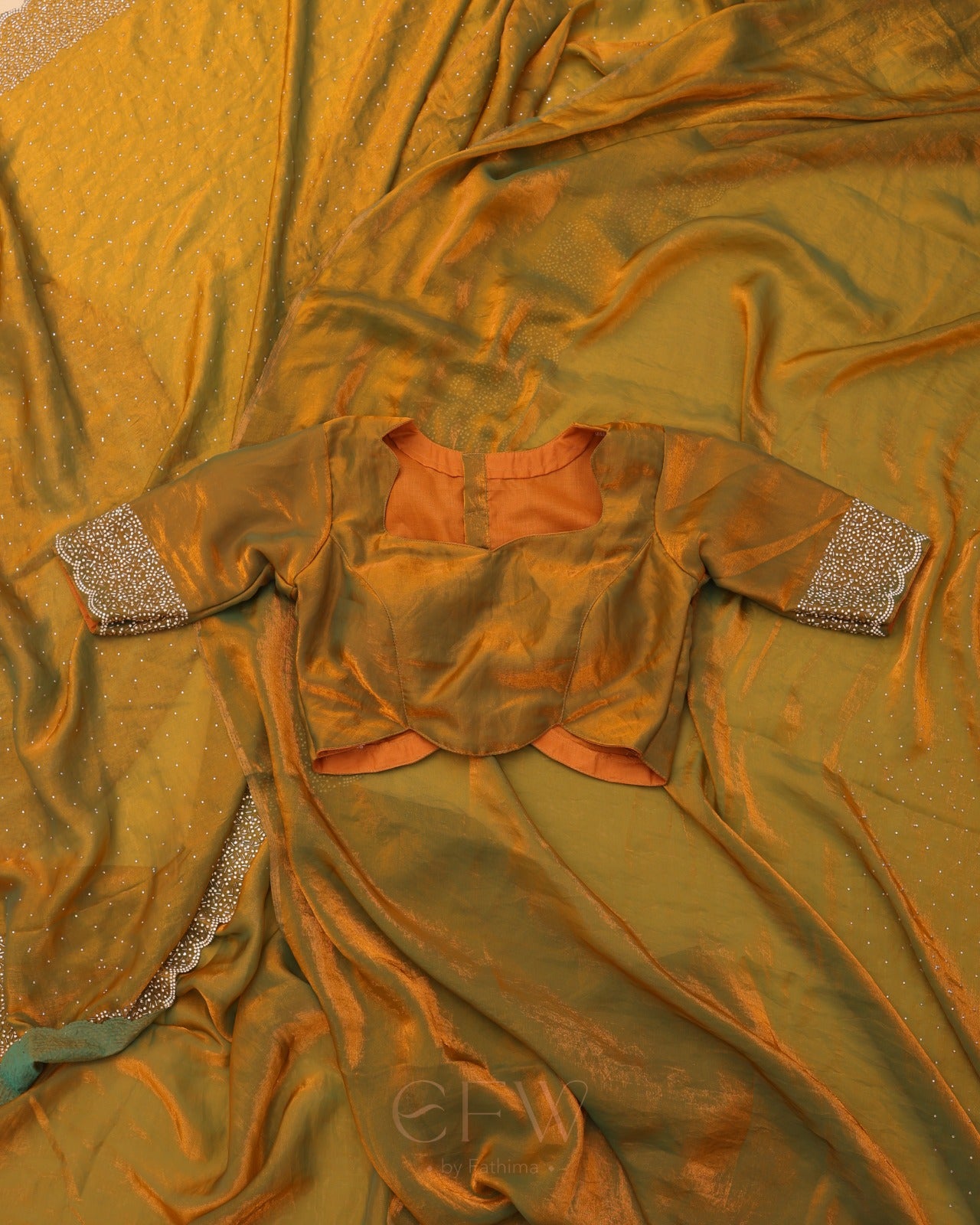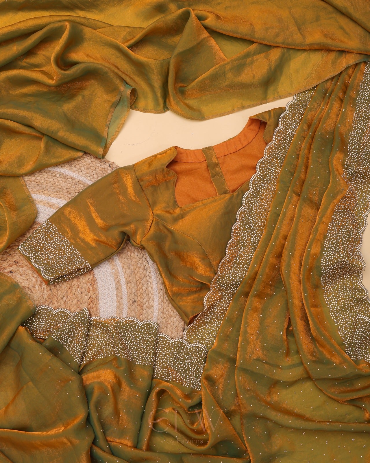 Adorned with intricate stonework throughout, this semi tissue silk saree flows effortlessly and features a beautifully detailed border that adds just the right touch of grace. Available in a range of stunning shades, it’s perfect for parties, weddings, and all your special events.