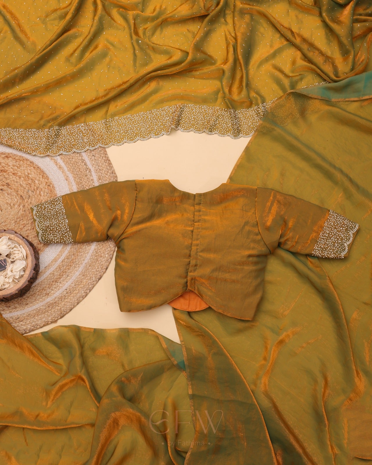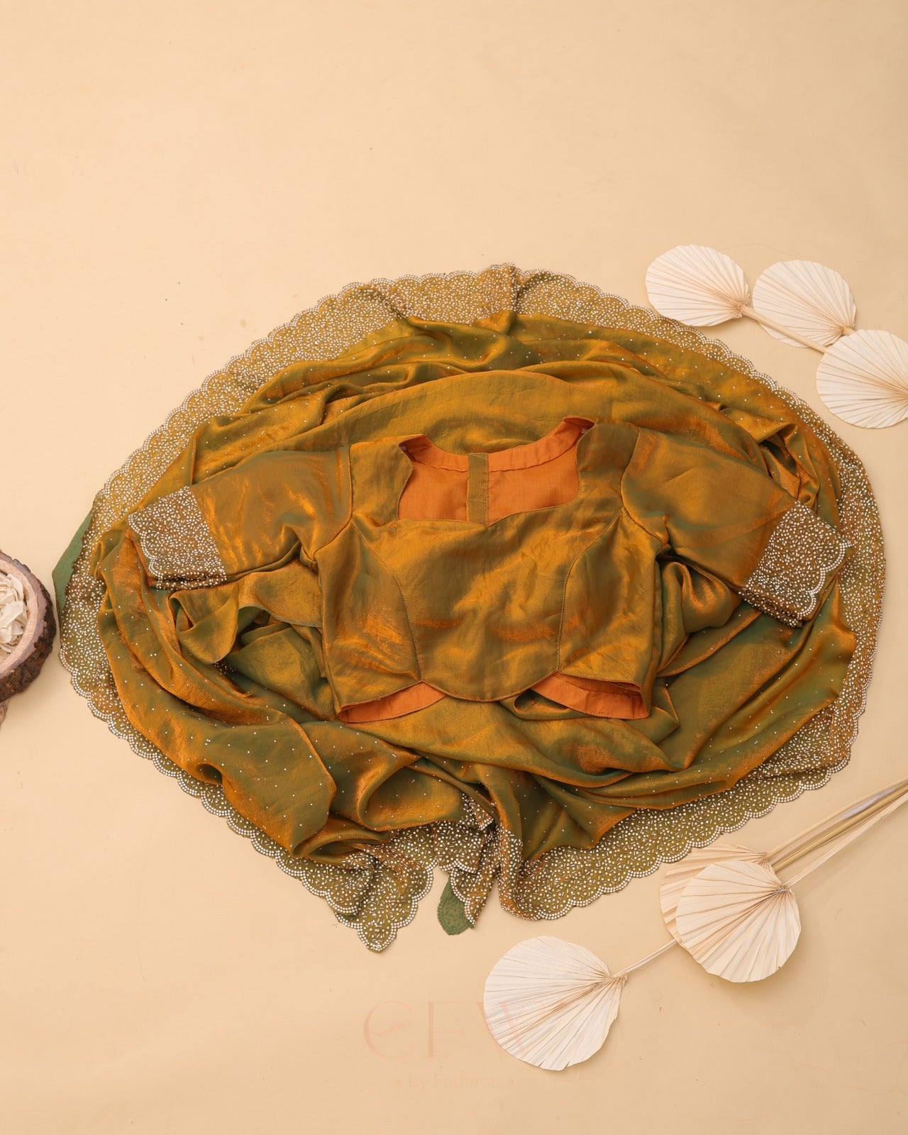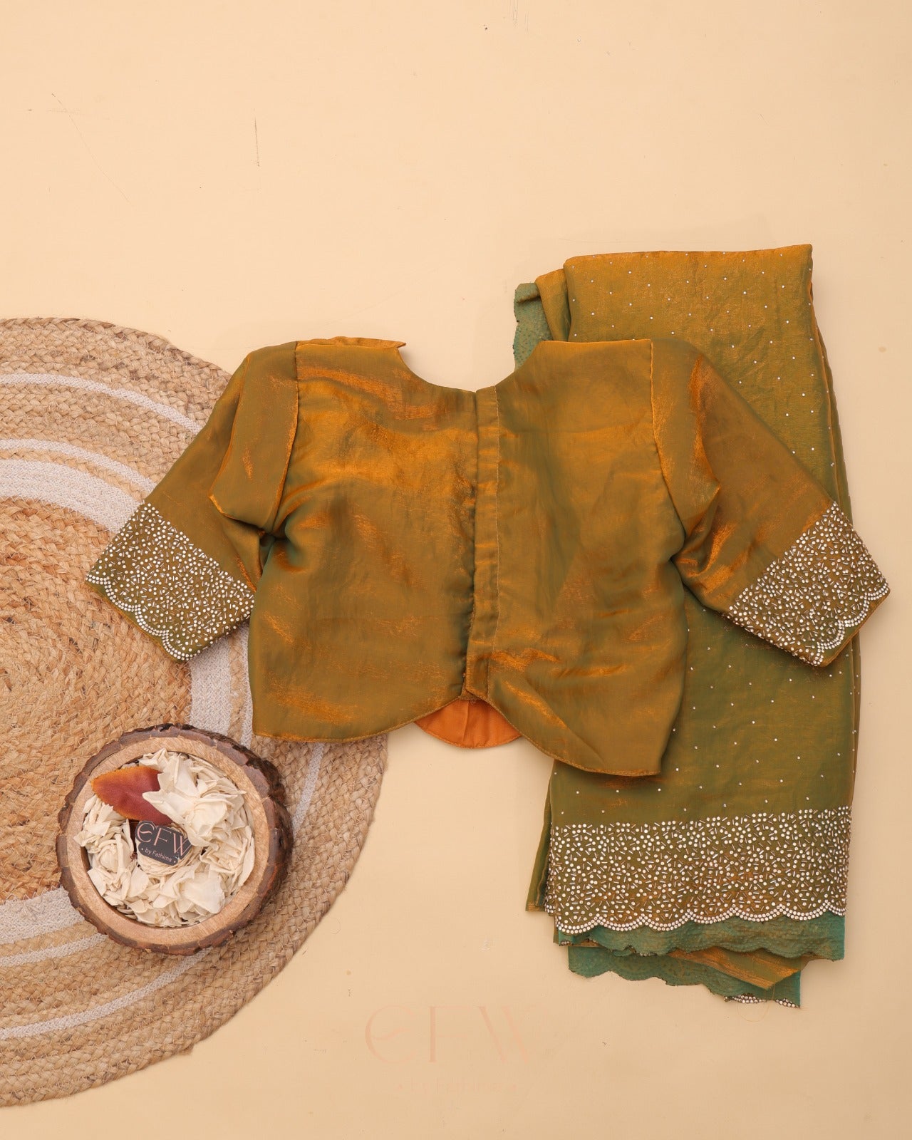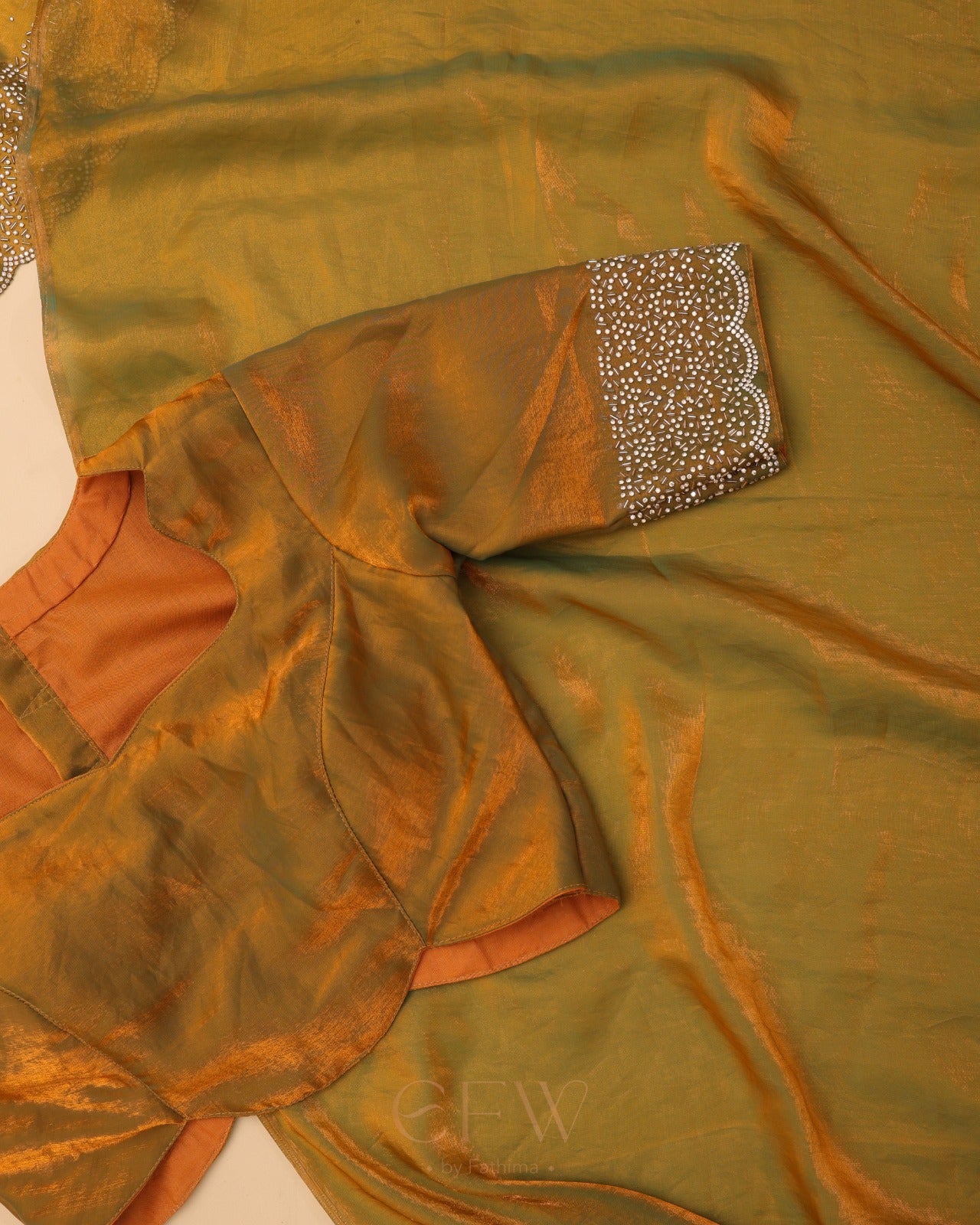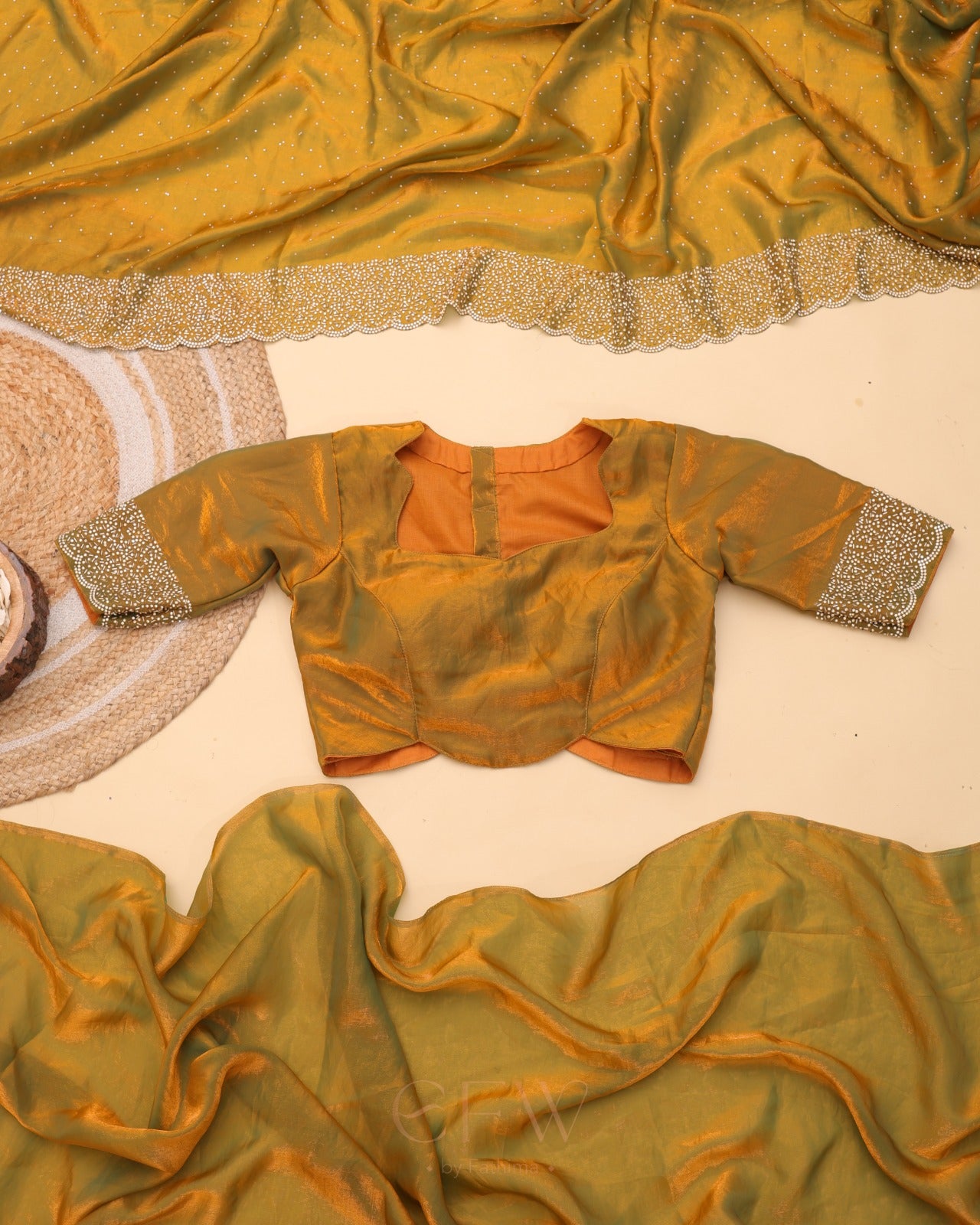 Adorned with intricate stonework throughout, this semi tissue silk saree flows effortlessly and features a beautifully detailed border that adds just the right touch of grace. Available in a range of stunning shades, it’s perfect for parties, weddings, and all your special events.