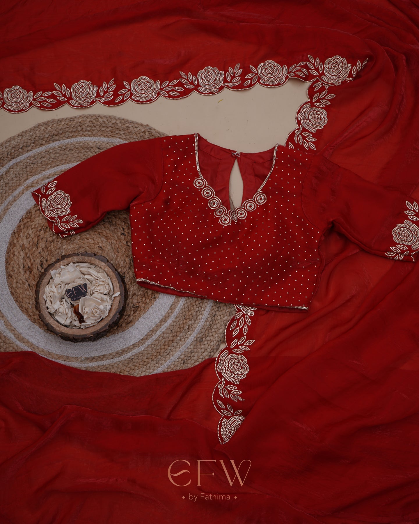 The blouse steals the show with intricate rose and diamond-inspired embroidery.