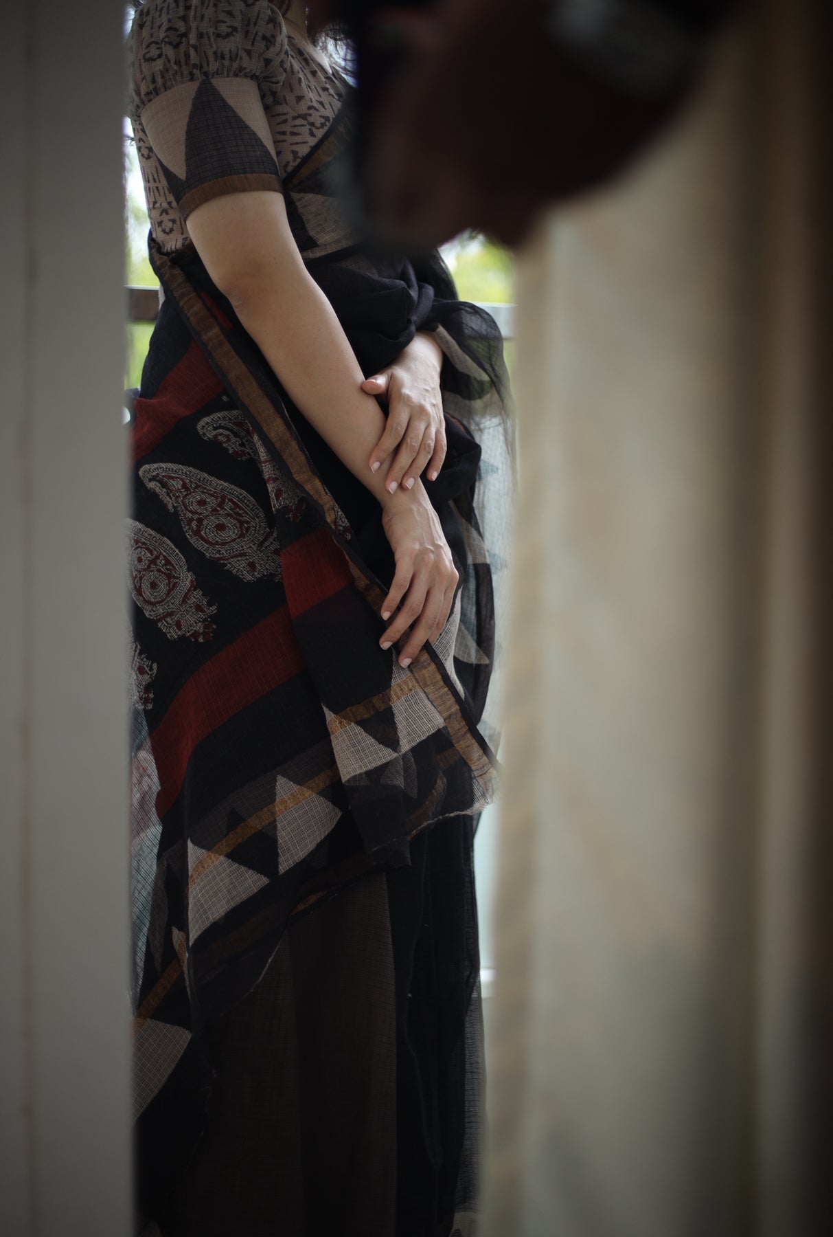 This handblock-printed Kota saree is elegance in motion — featherlight, softly structured, and detailed with earthy motifs that speak of quiet sophistication.
