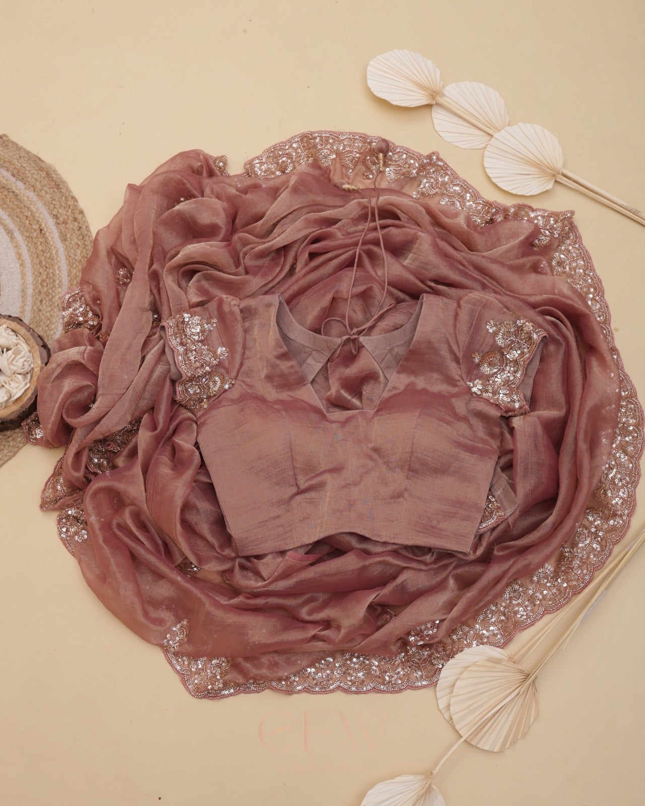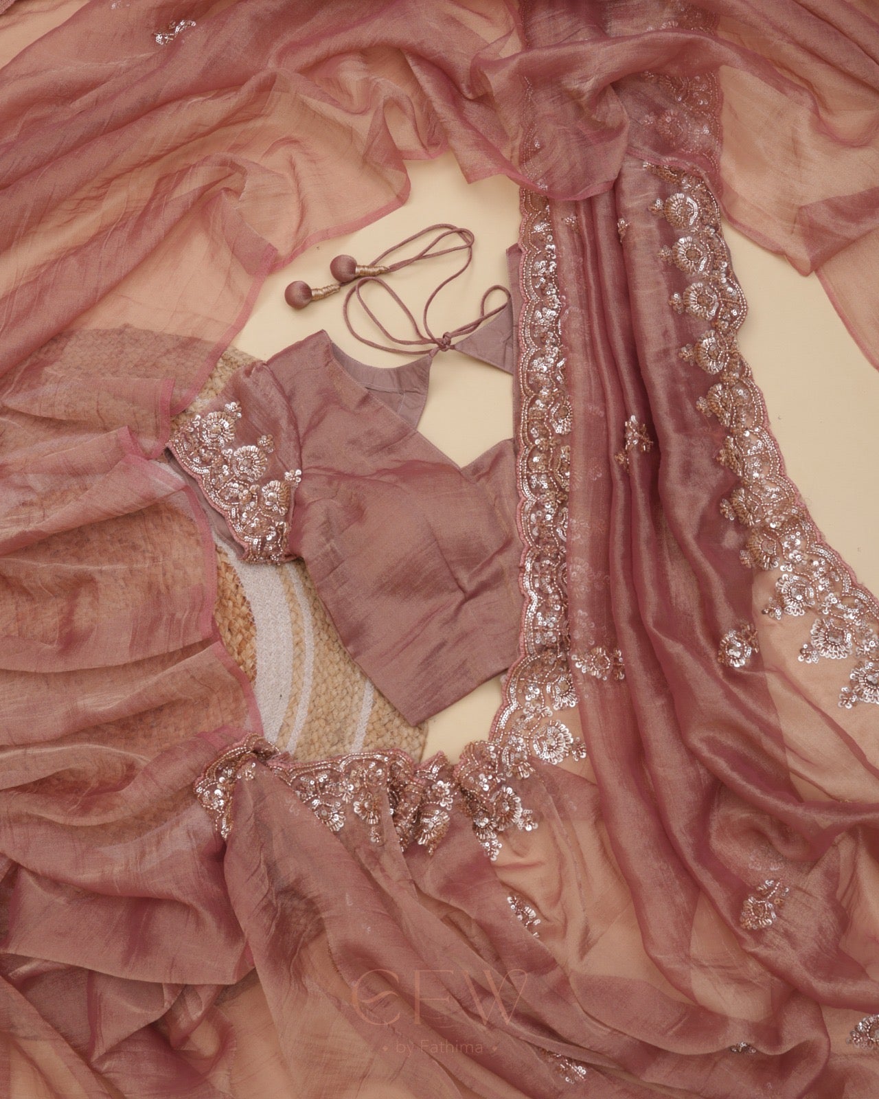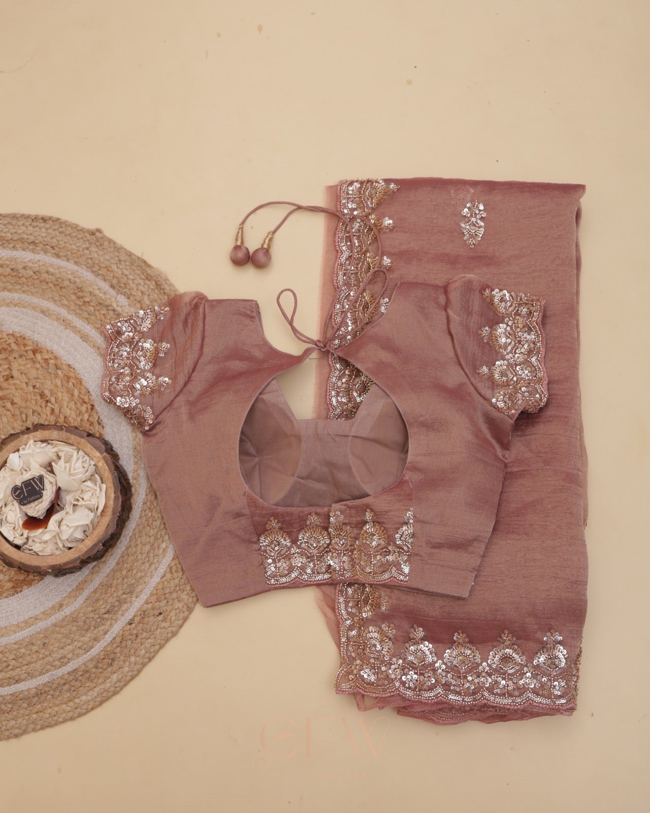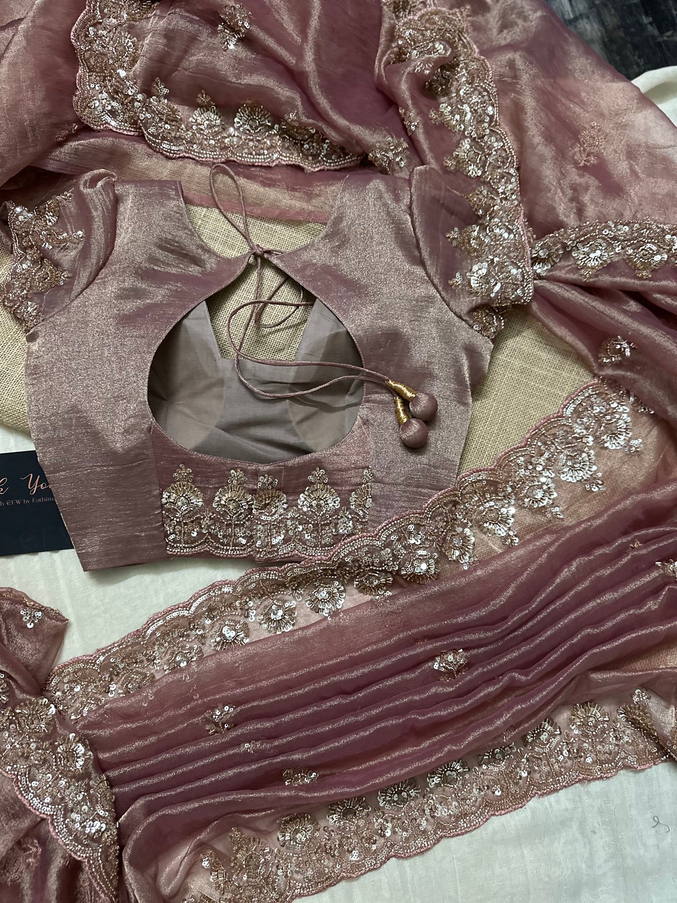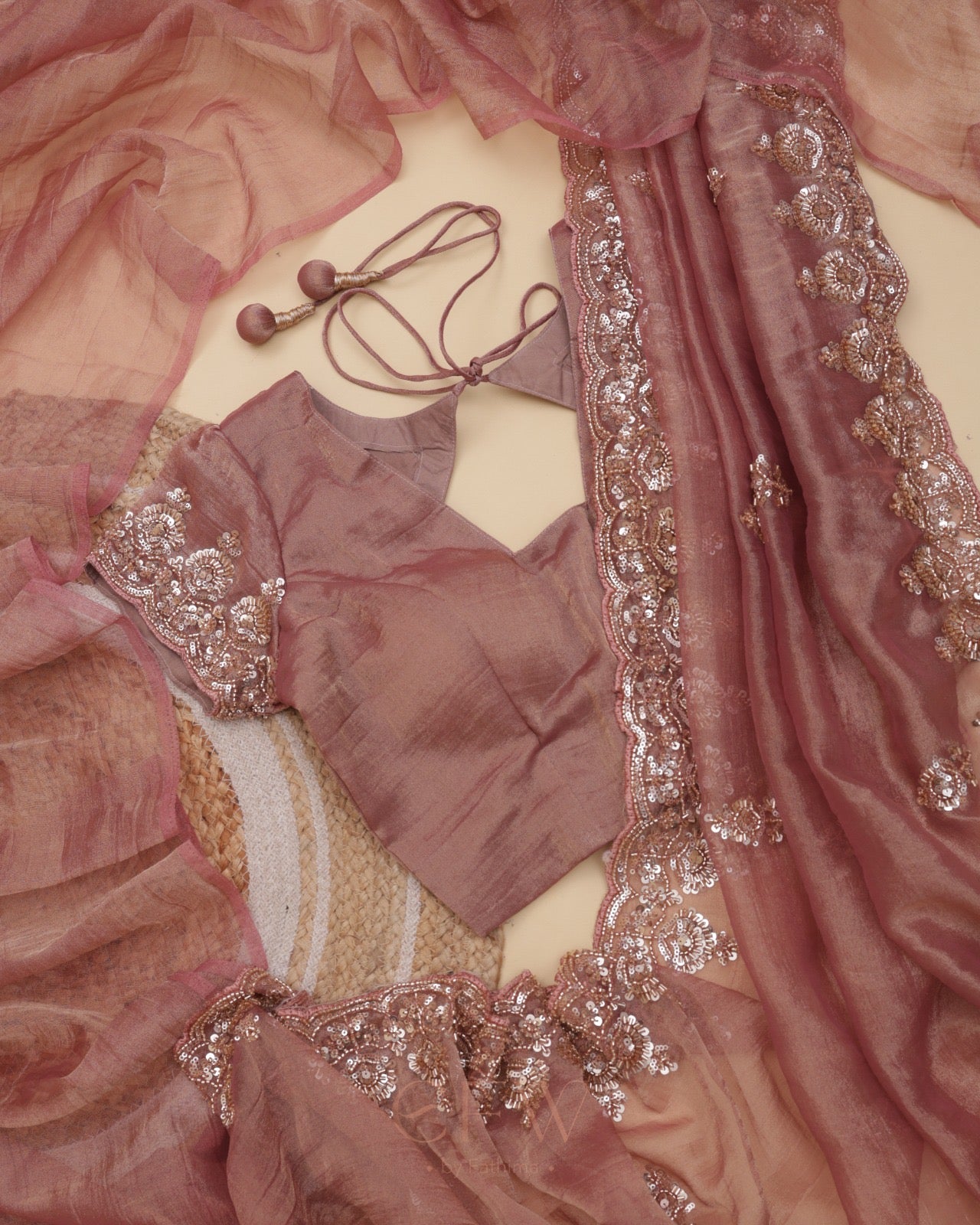 Ready to steal the spotlight? This gorgeous rose gold pure tissue dual tone silk saree in a fabulous golden pink shade is the ultimate showstopper! it’s got all the drama you need to slay the day. Paired with a same tissue silk with the sequins and embroidered work with the running blouse because why not go extra, righ?