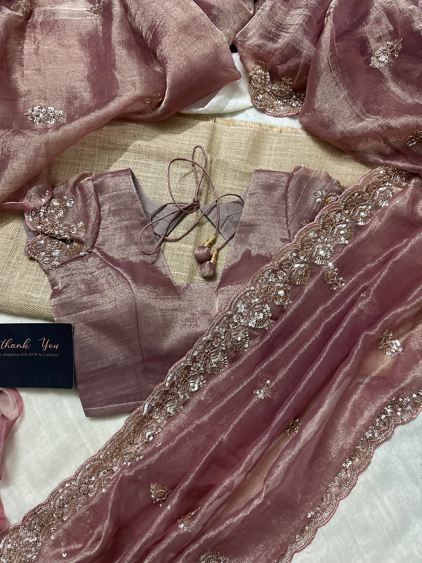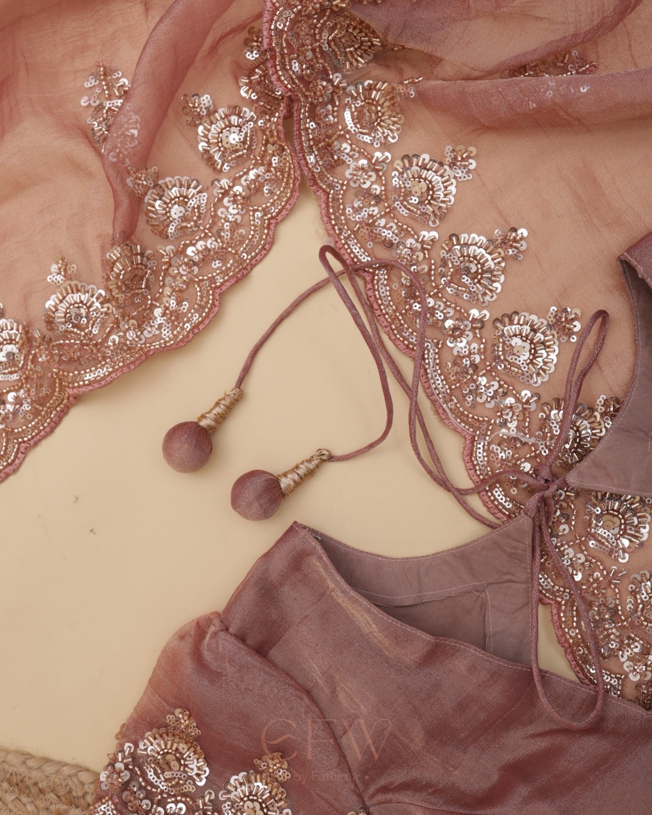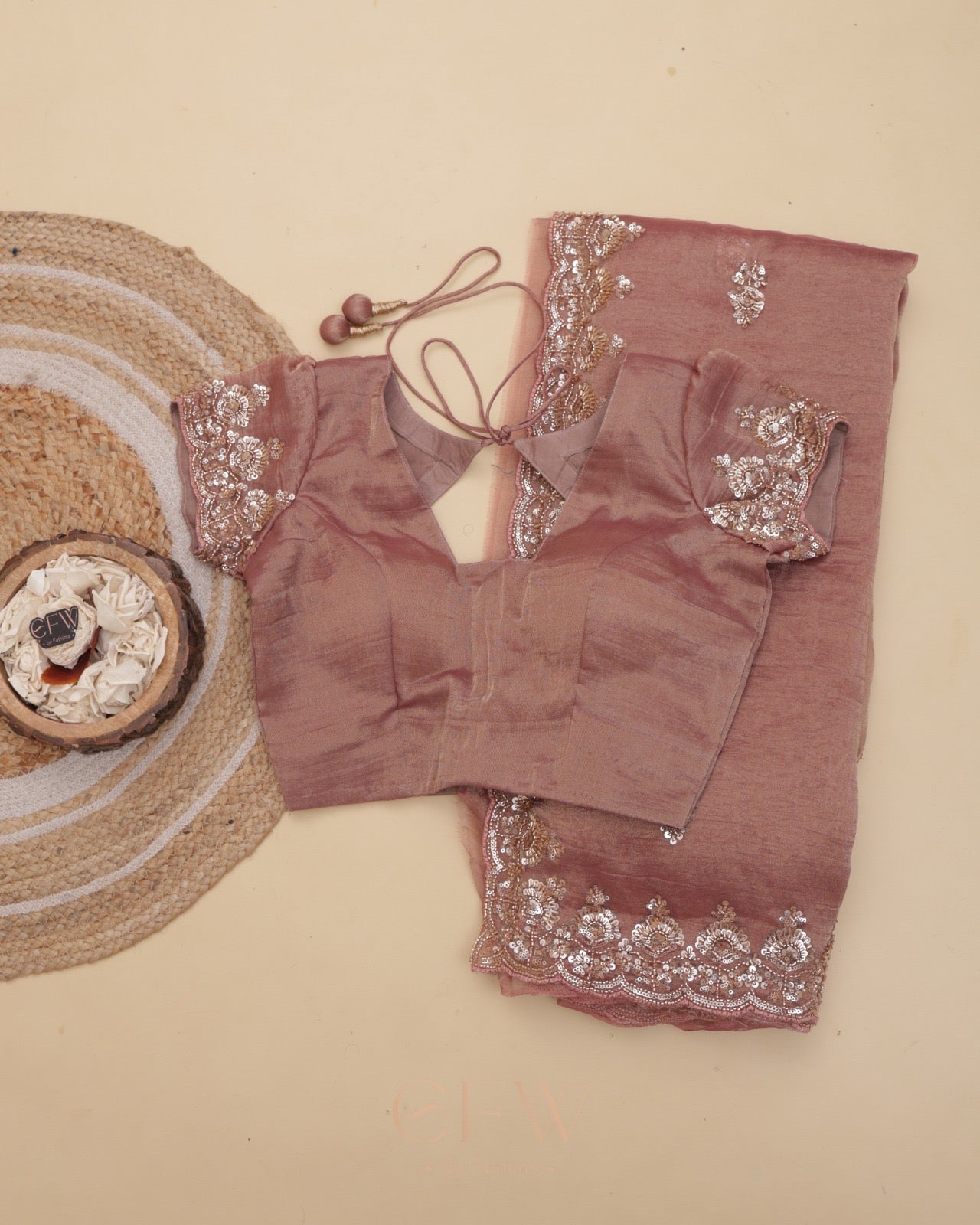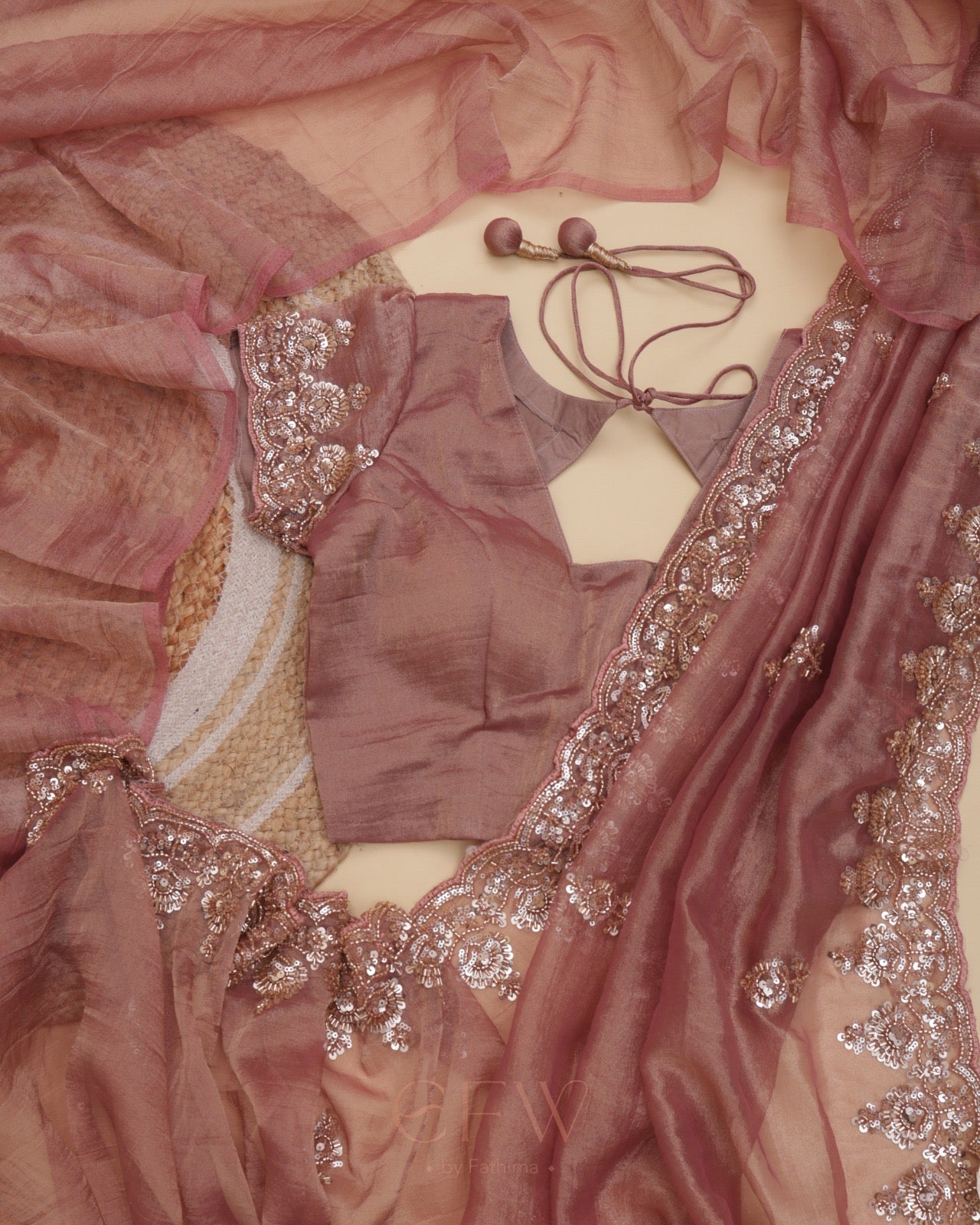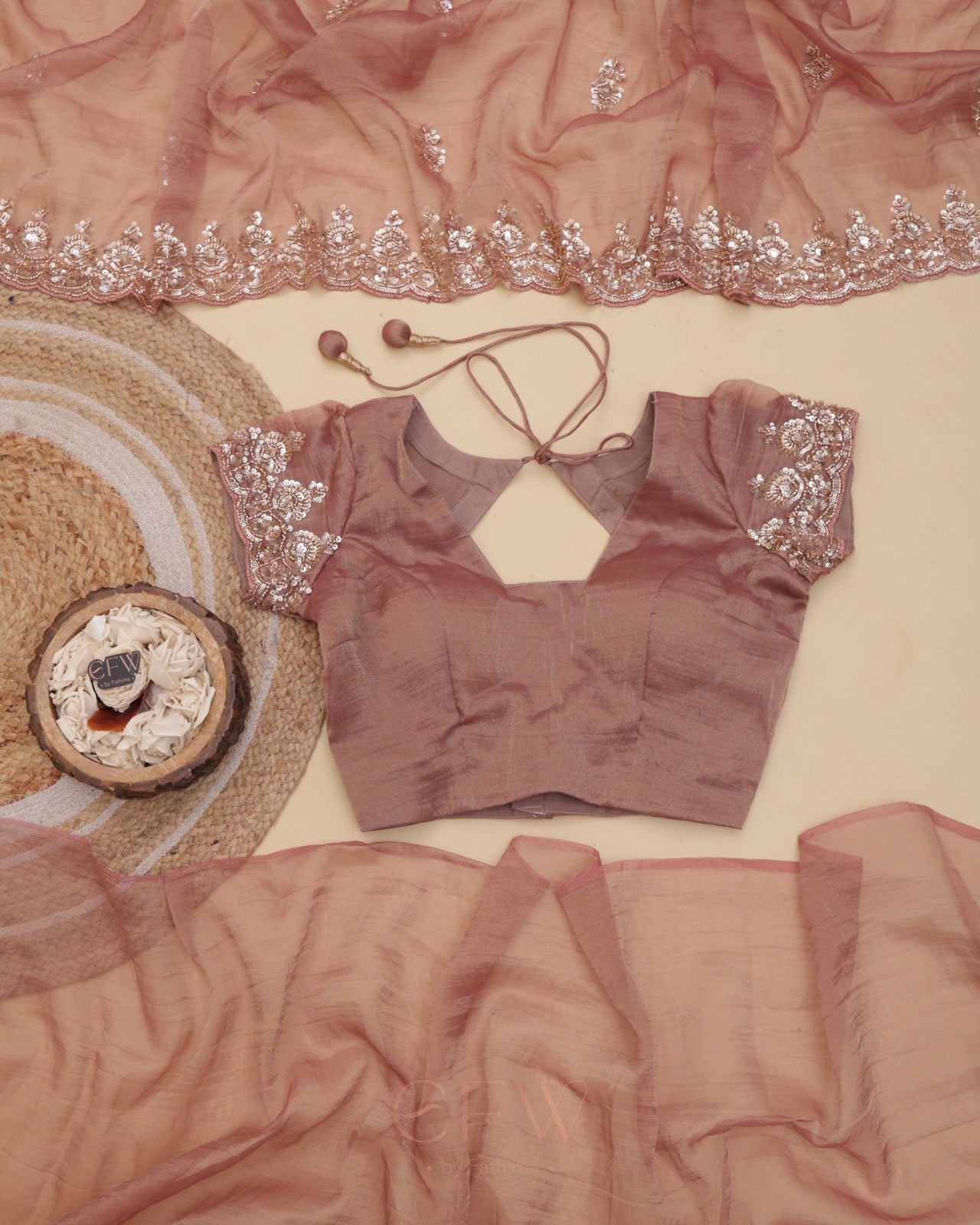 Ready to steal the spotlight? This gorgeous rose gold pure tissue dual tone silk saree in a fabulous golden pink shade is the ultimate showstopper! it’s got all the drama you need to slay the day. Paired with a same tissue silk with the sequins and embroidered work with the running blouse because why not go extra, righ?