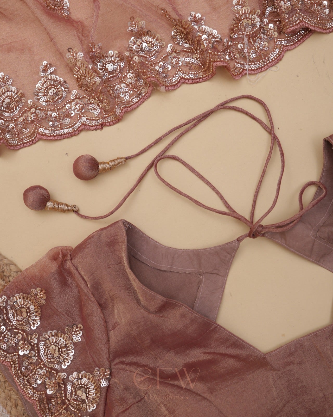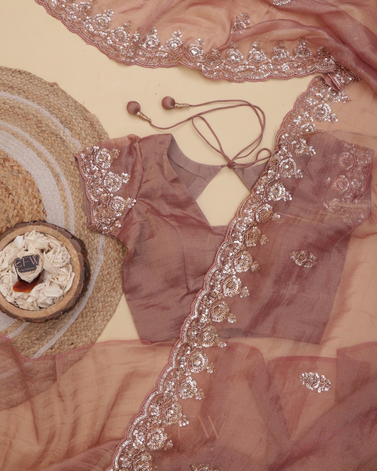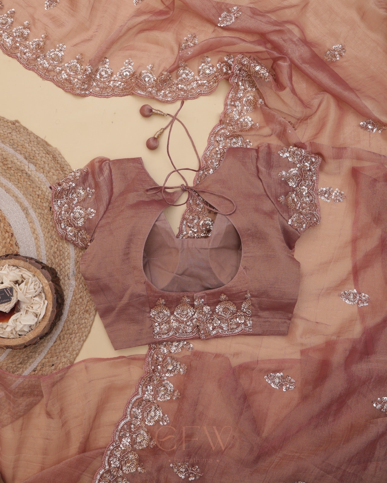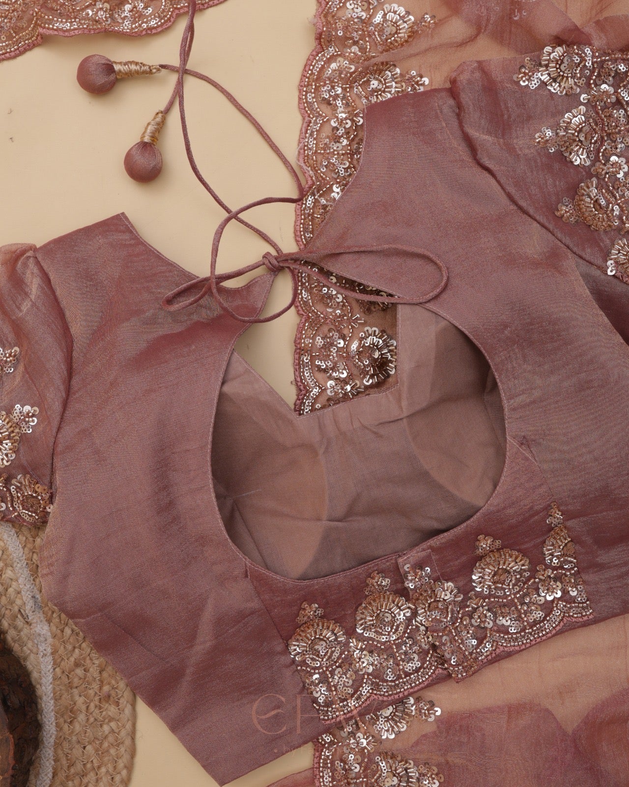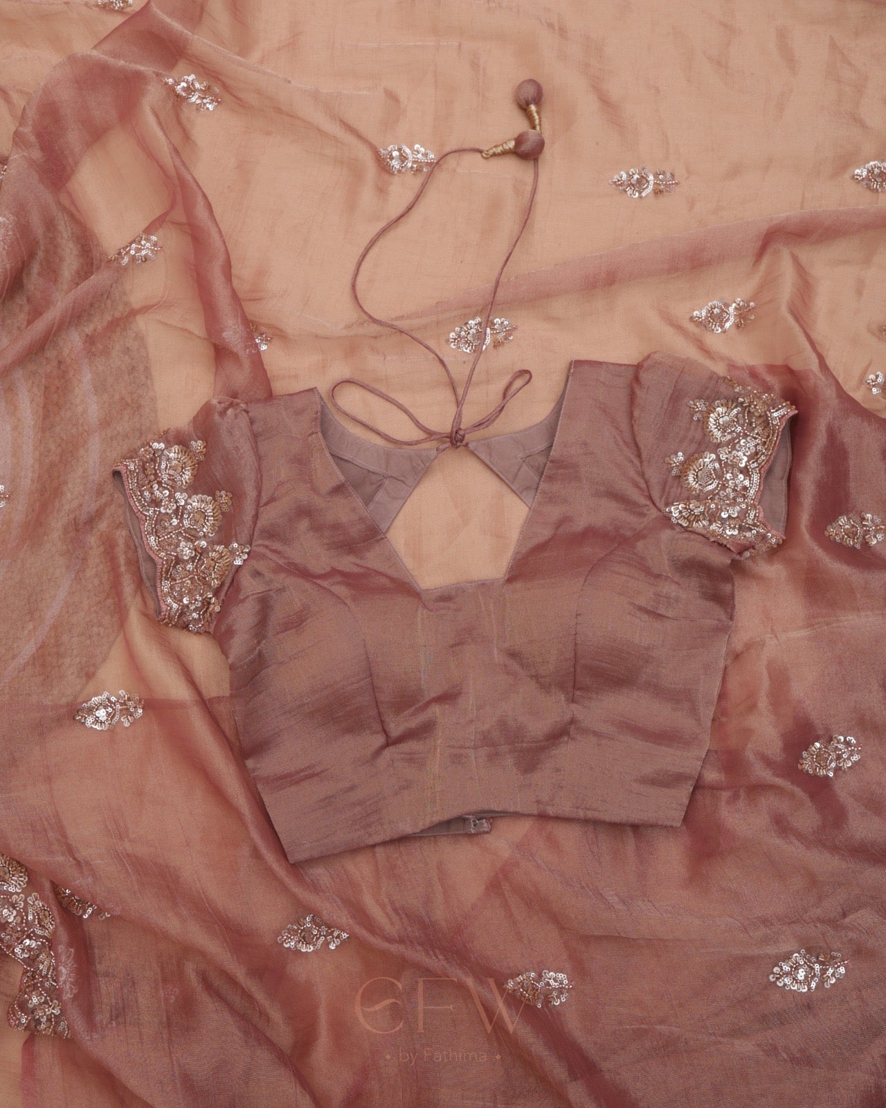 Ready to steal the spotlight? This gorgeous rose gold pure tissue dual tone silk saree in a fabulous golden pink shade is the ultimate showstopper! it’s got all the drama you need to slay the day. Paired with a same tissue silk with the sequins and embroidered work with the running blouse because why not go extra, righ?