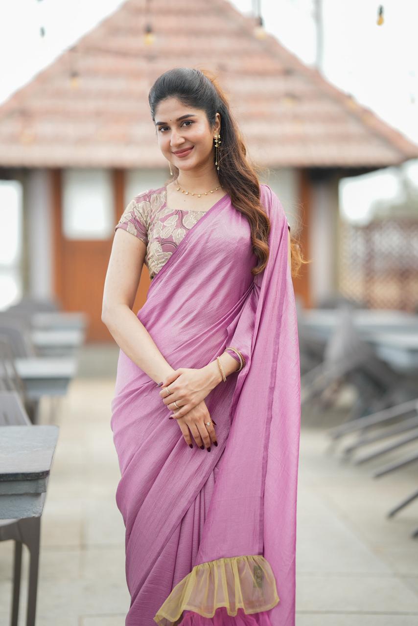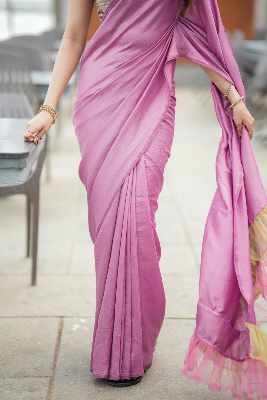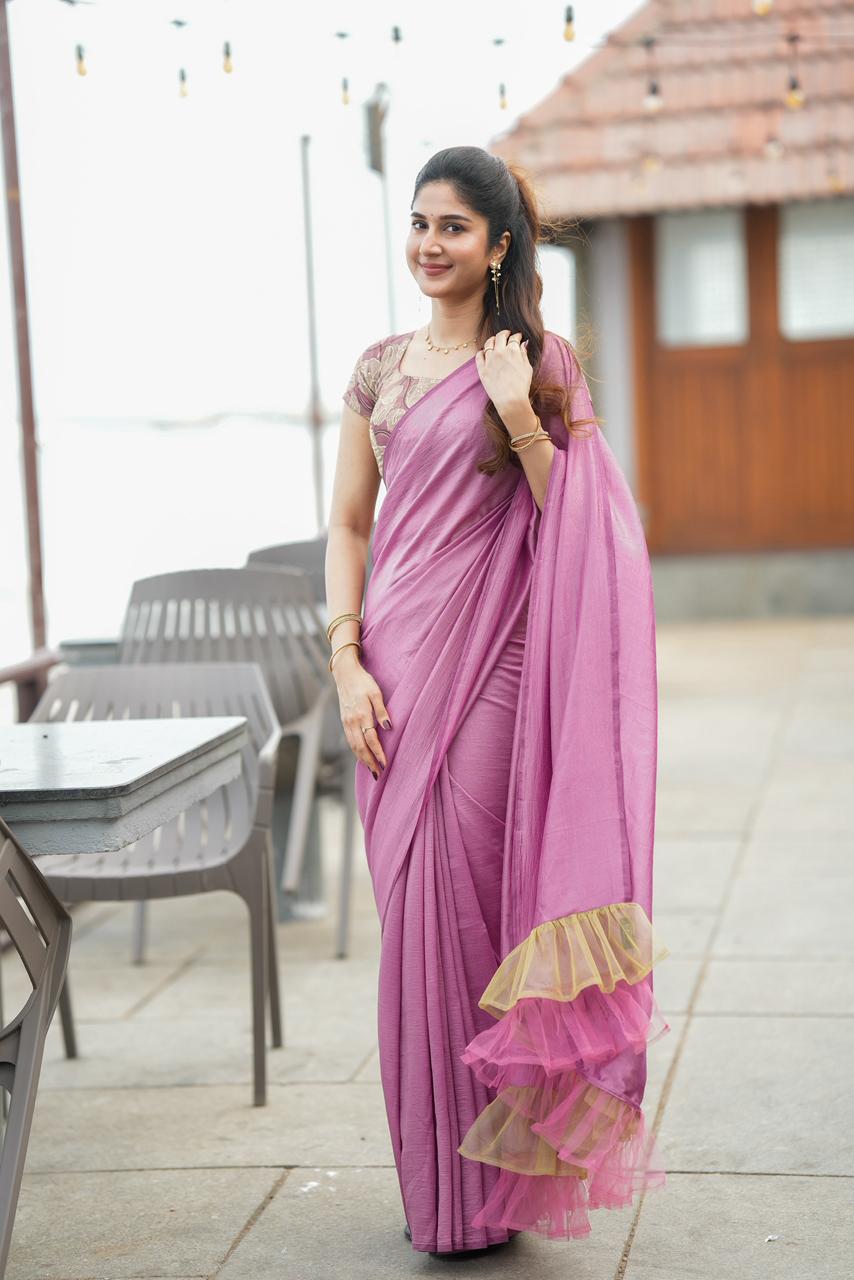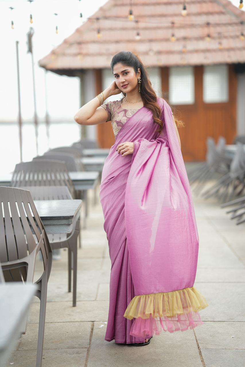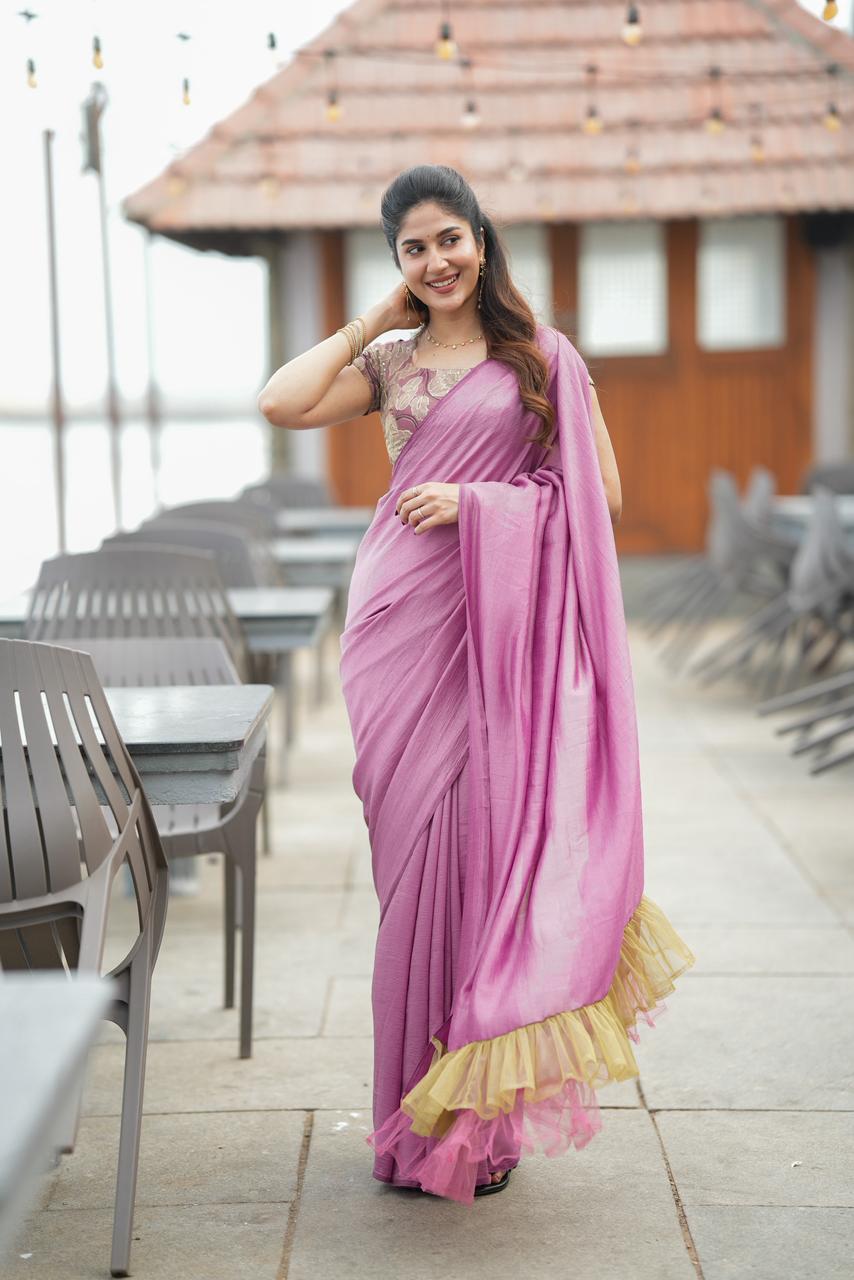 Enhancing the elegance, layered tulle ruffles in gold and blush cascade along the saree, adding movement and a dreamy statement finish. The combination of soft pinks and warm golden tones creates a look that feels both regal and modern.