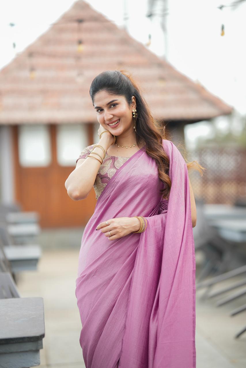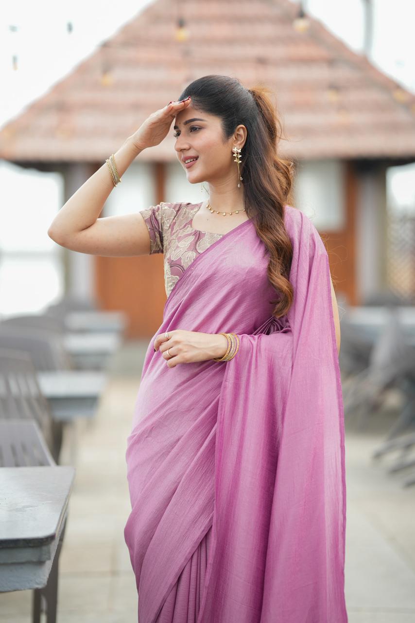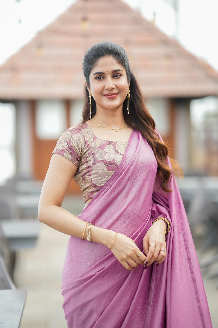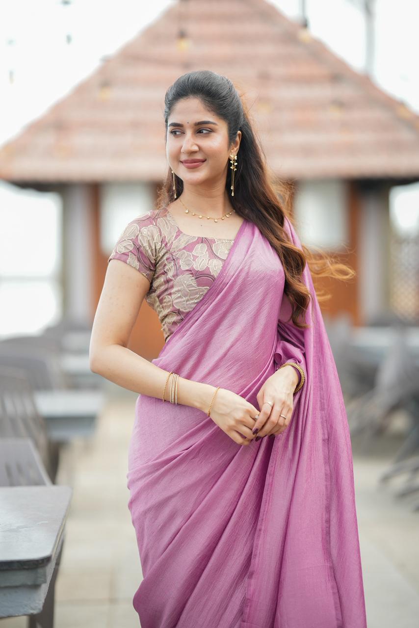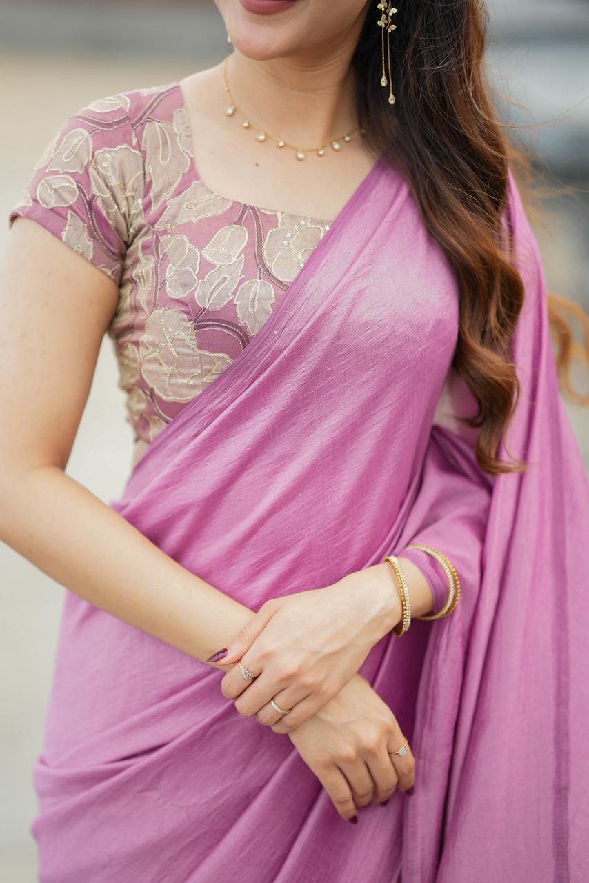 Graceful and enchanting, this saree embodies soft luxury with a romantic designer appeal. The saree features a delicate blush-pink drape with a gentle sheen that flows elegantly, creating a refined and feminine silhouette.