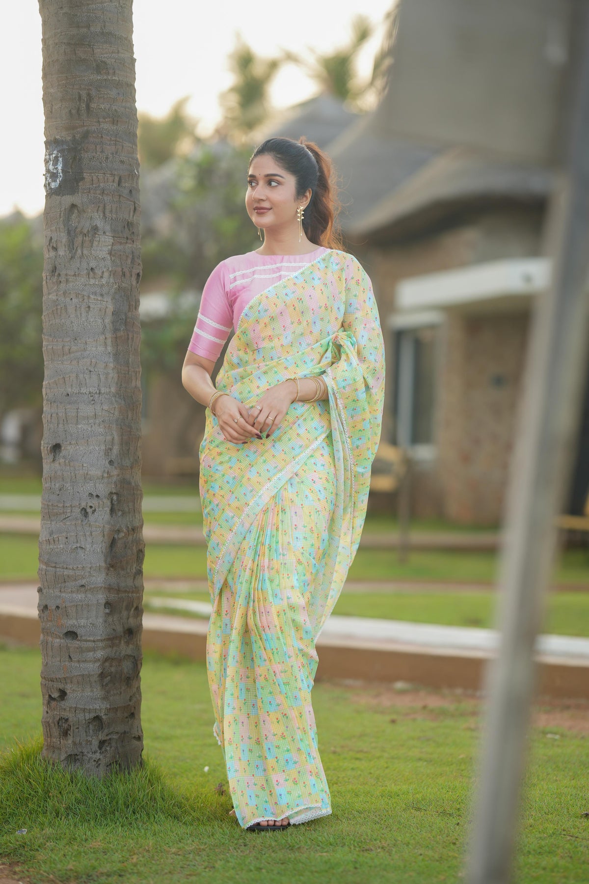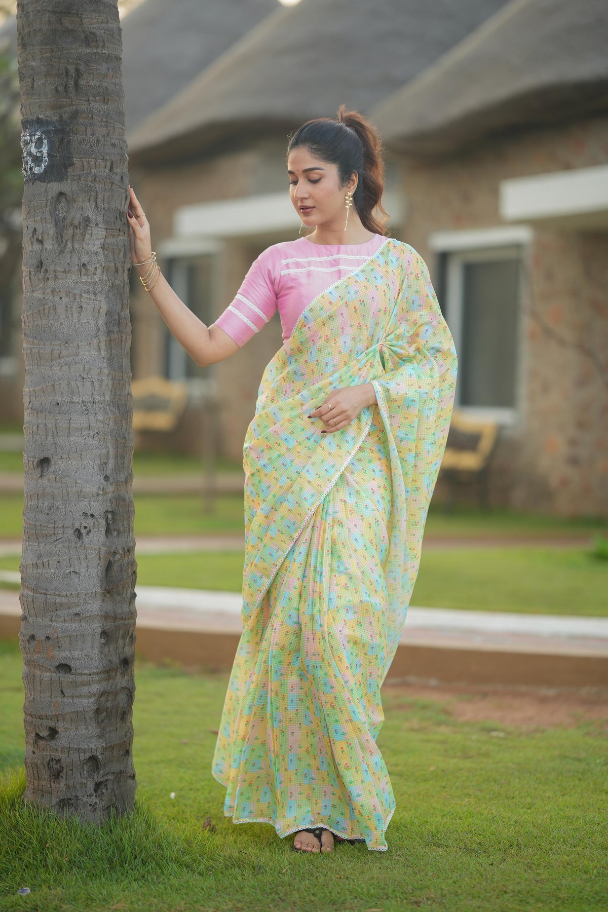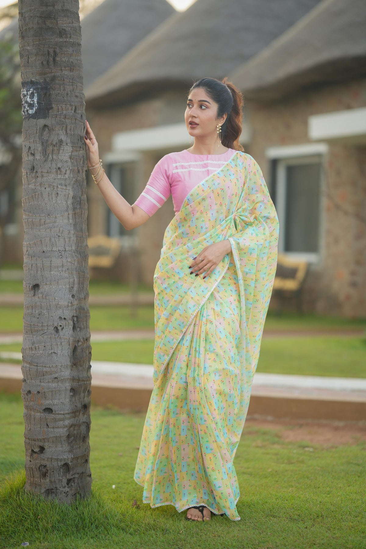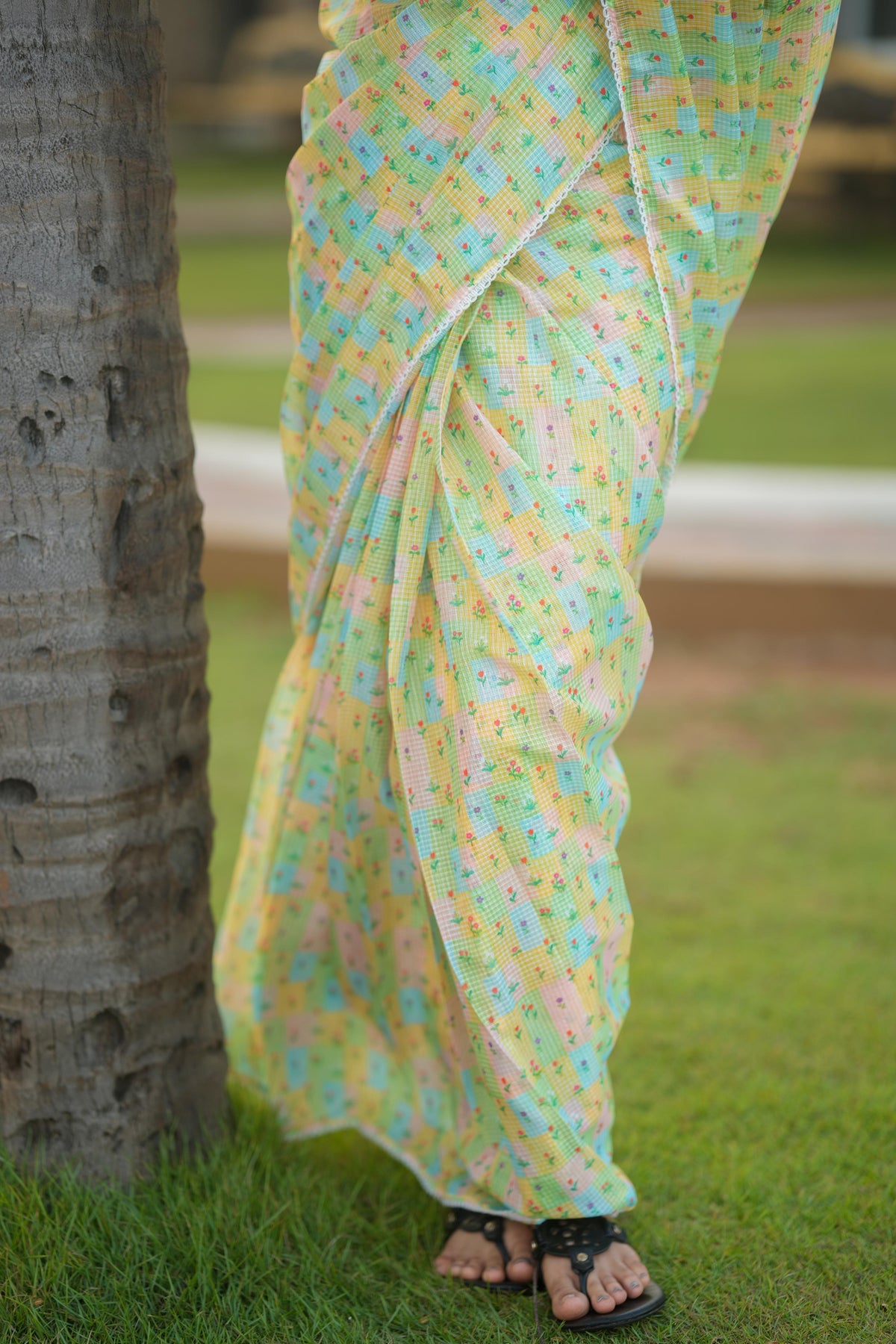 Cute, fresh, and straight out of a summer Pinterest board, Blythe is your perfect day look. The saree features a playful pastel check pattern in soft greens, yellows, and blush tones, sprinkled with tiny floral motifs that give it a breezy, cottagecore vibe.