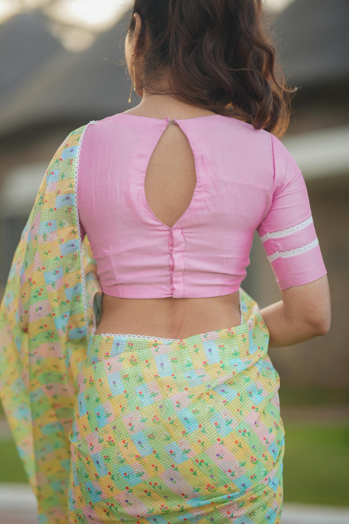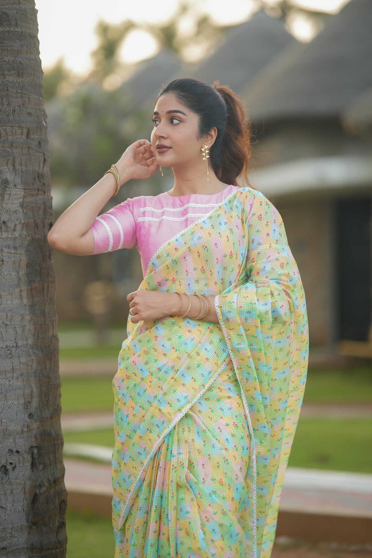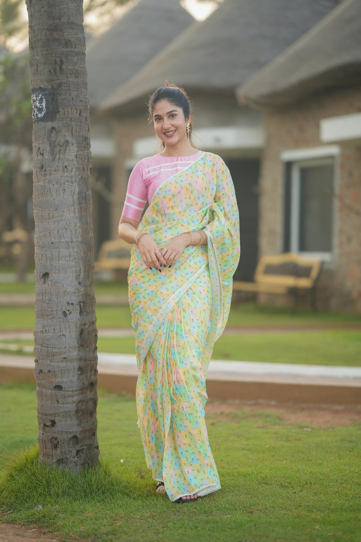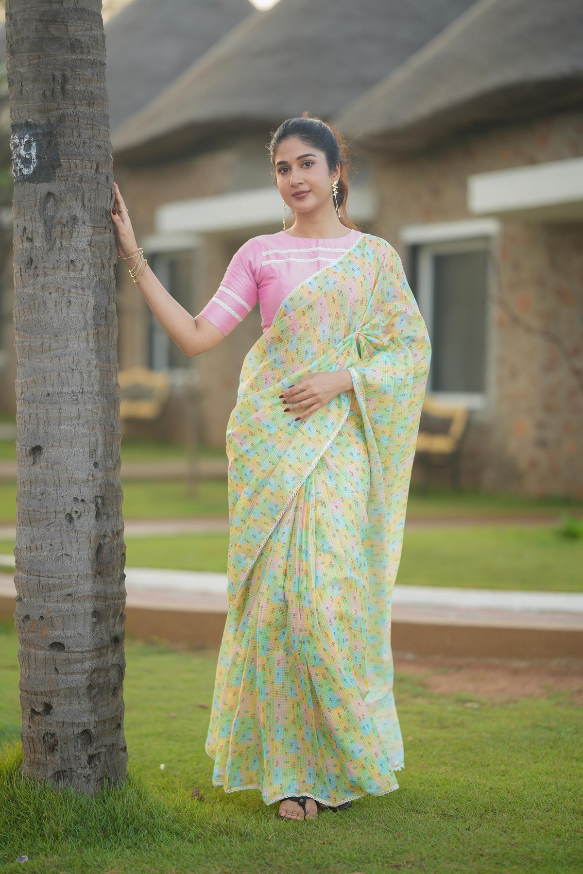 Cute, fresh, and straight out of a summer Pinterest board, Blythe is your perfect day look. The saree features a playful pastel check pattern in soft greens, yellows, and blush tones, sprinkled with tiny floral motifs that give it a breezy, cottagecore vibe.