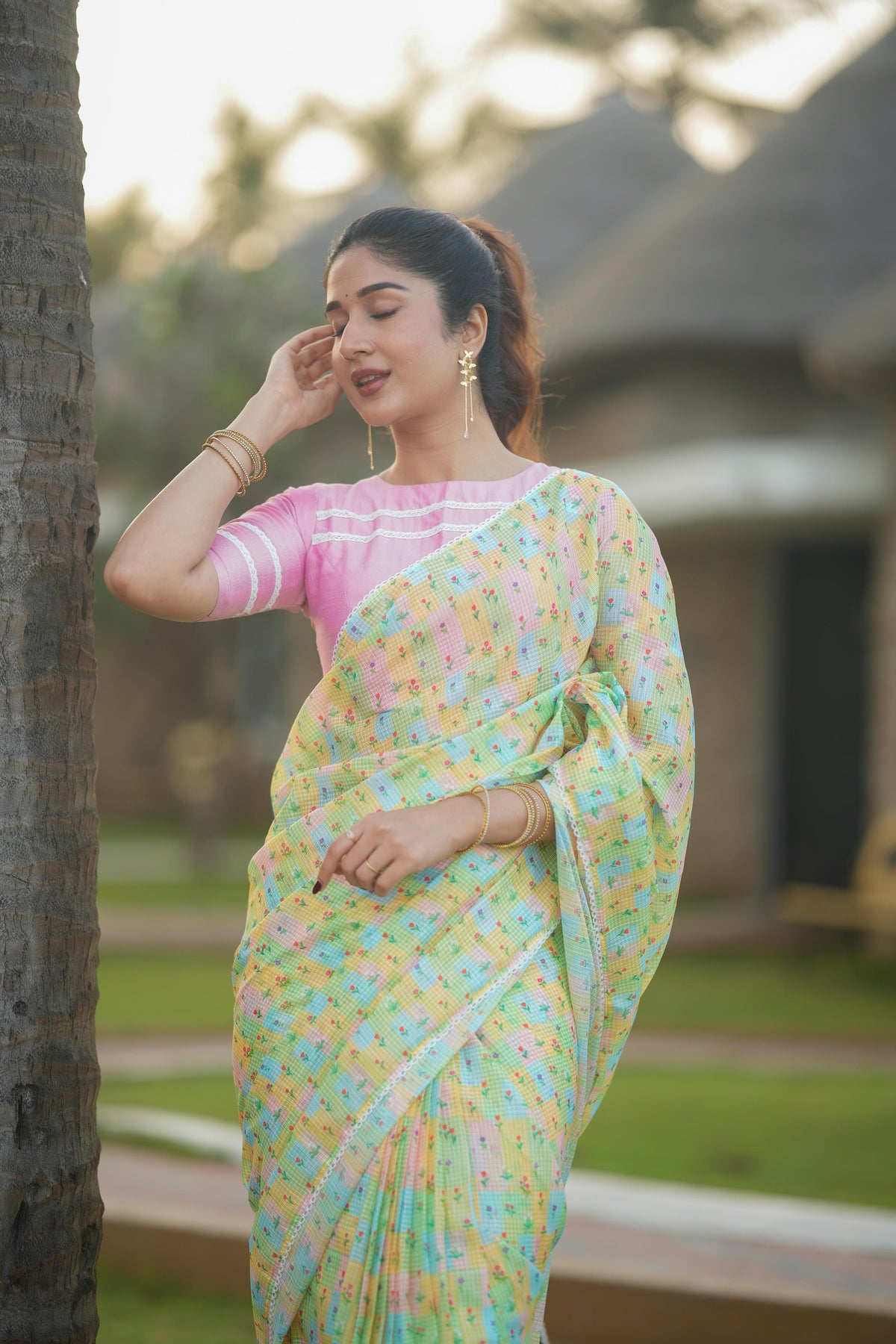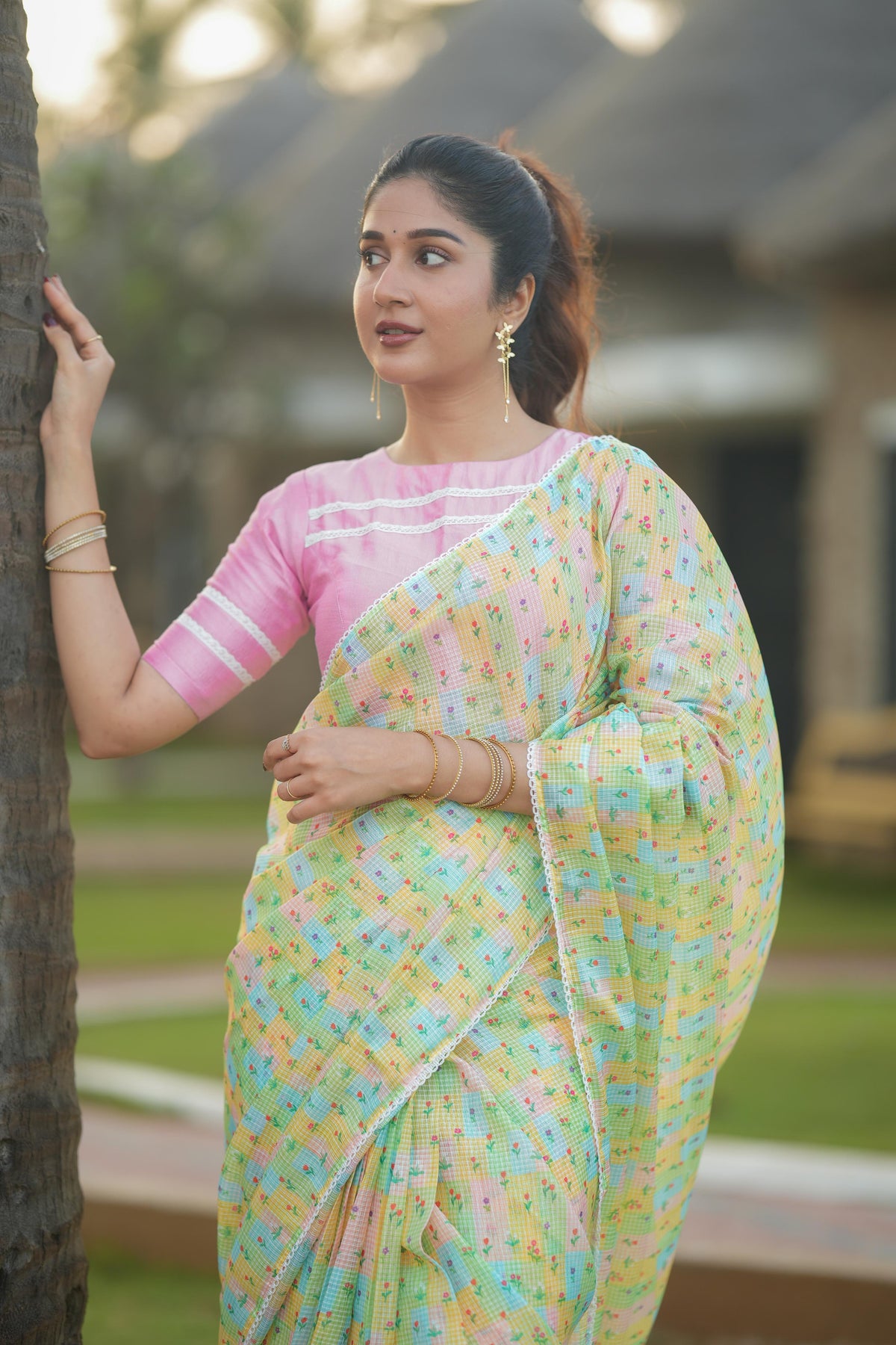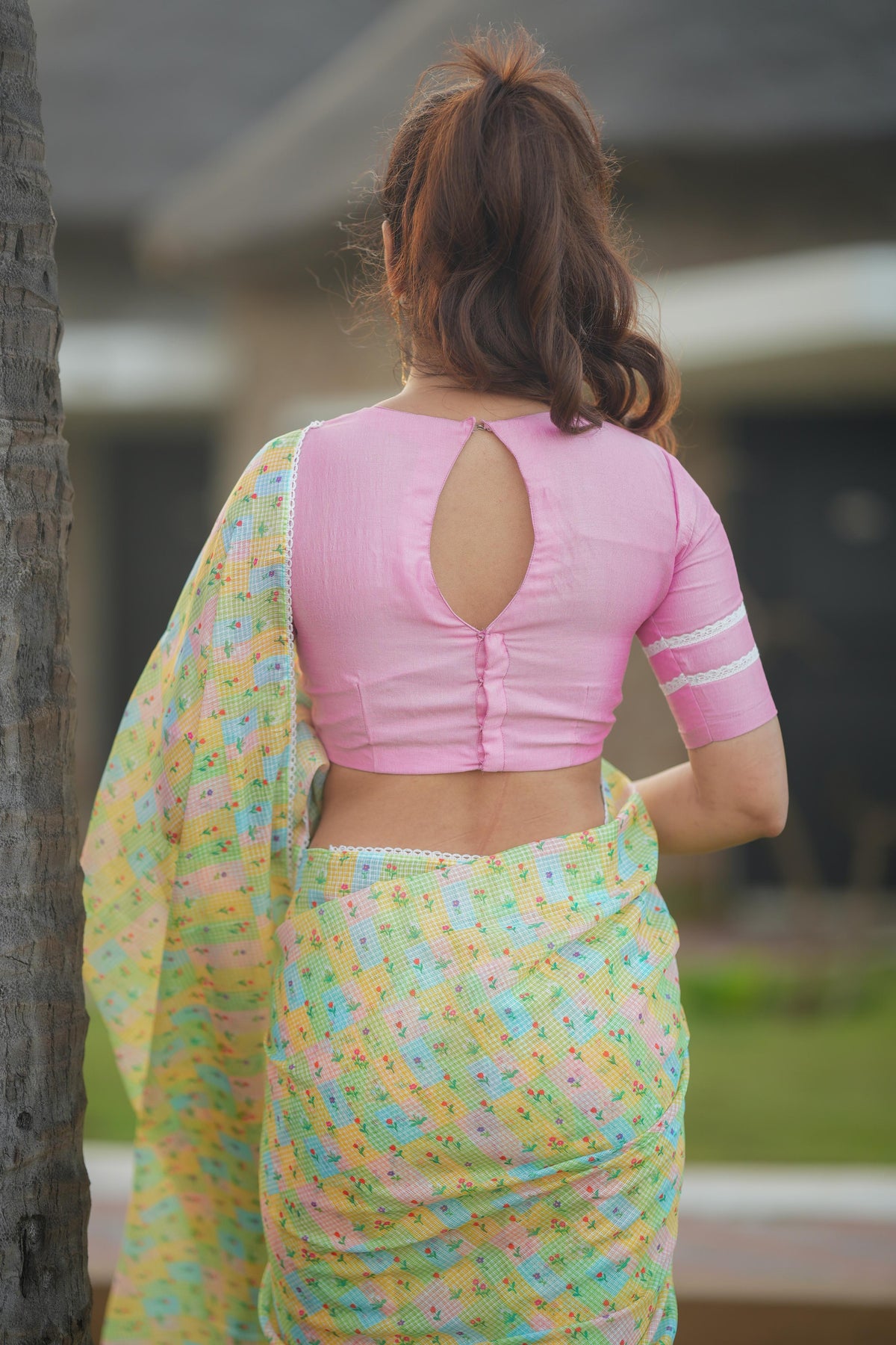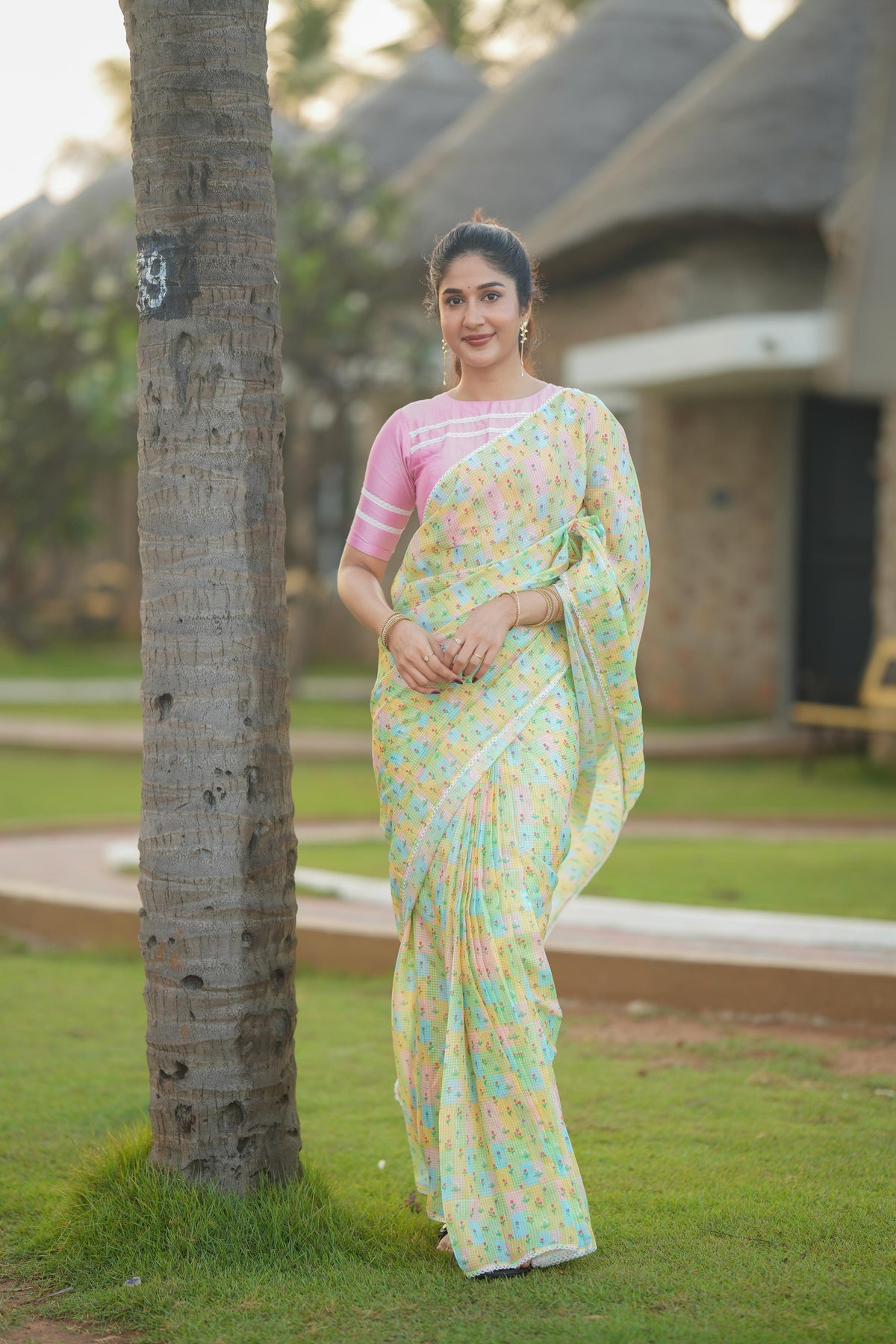 Cute, fresh, and straight out of a summer Pinterest board, Blythe is your perfect day look. The saree features a playful pastel check pattern in soft greens, yellows, and blush tones, sprinkled with tiny floral motifs that give it a breezy, cottagecore vibe.