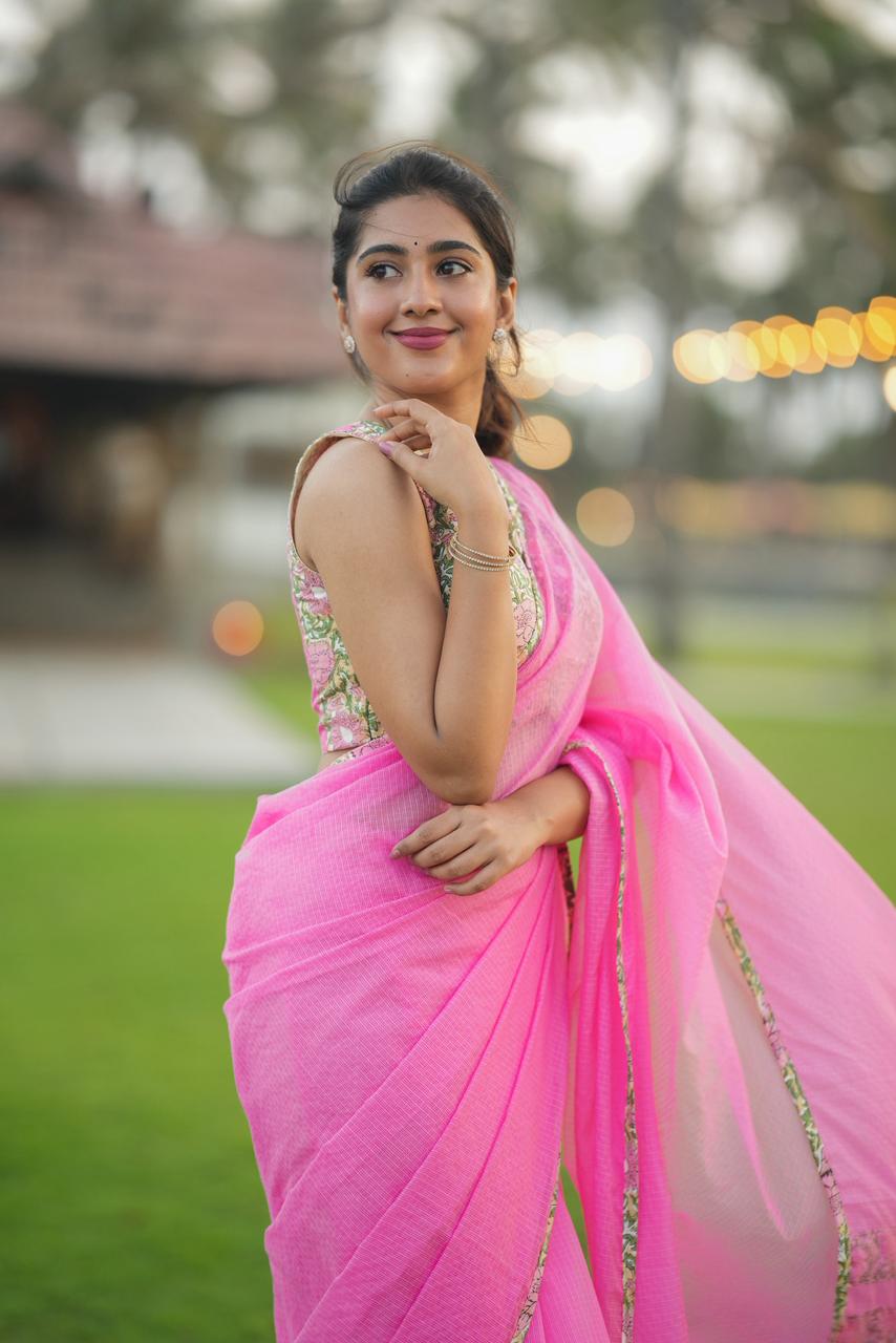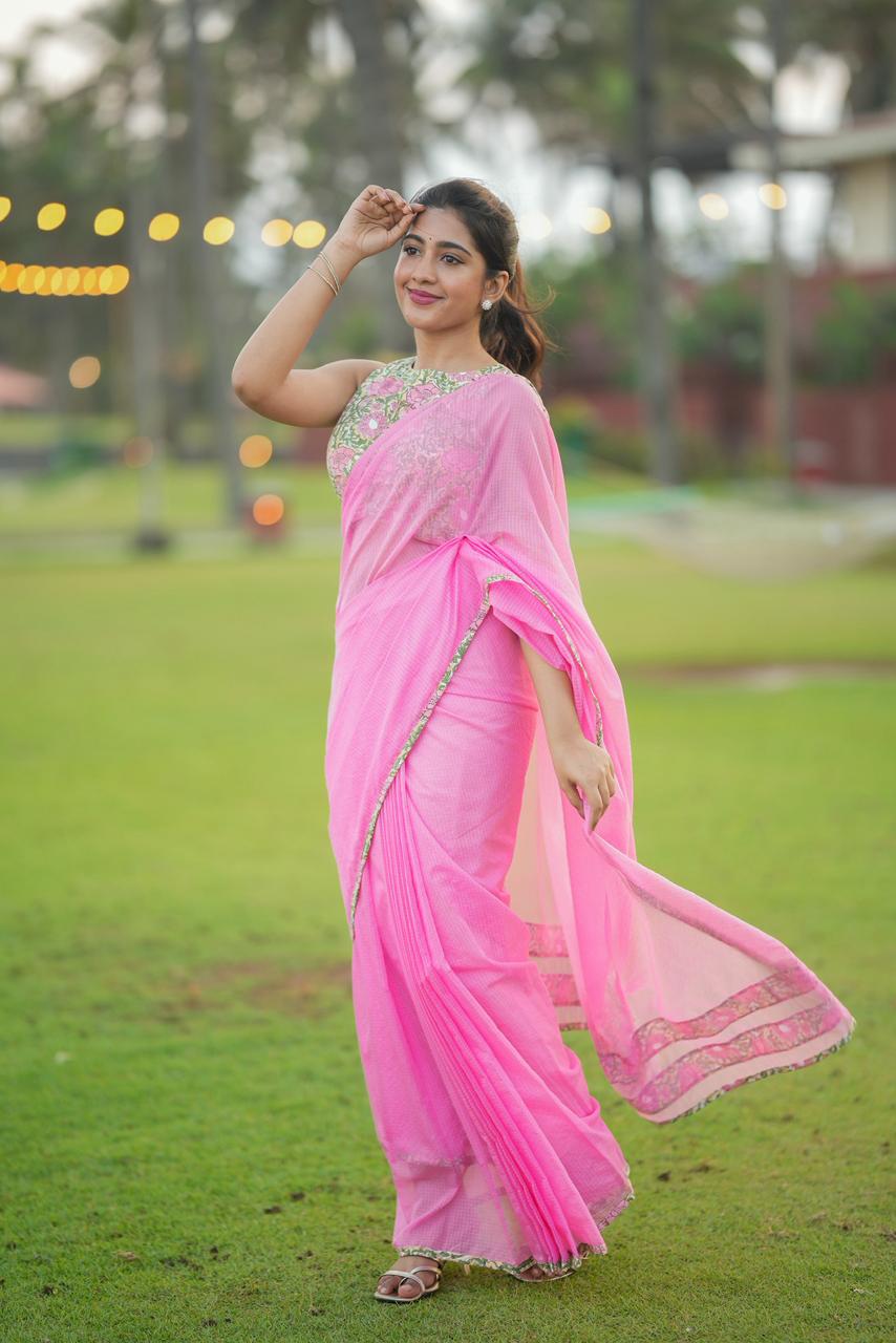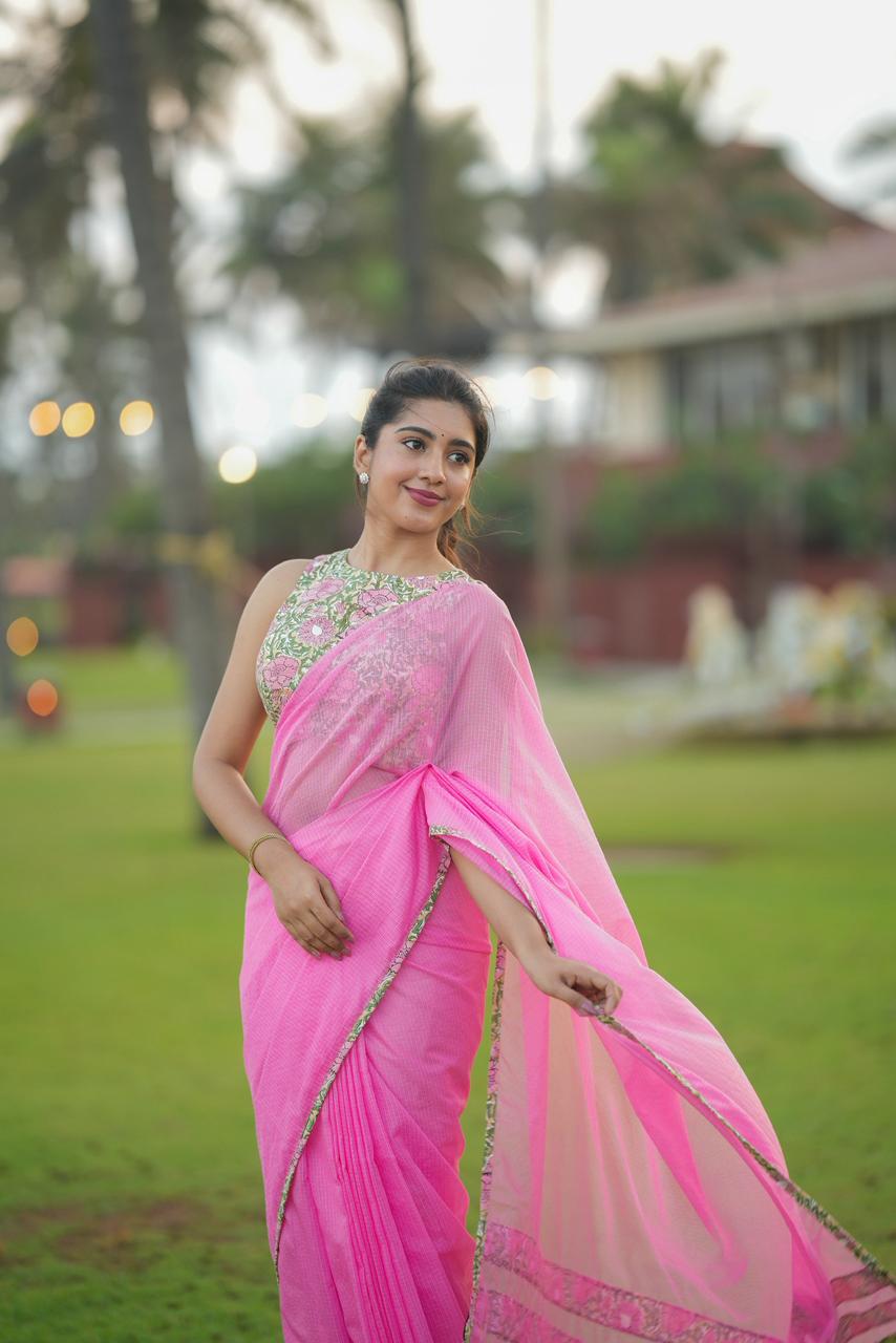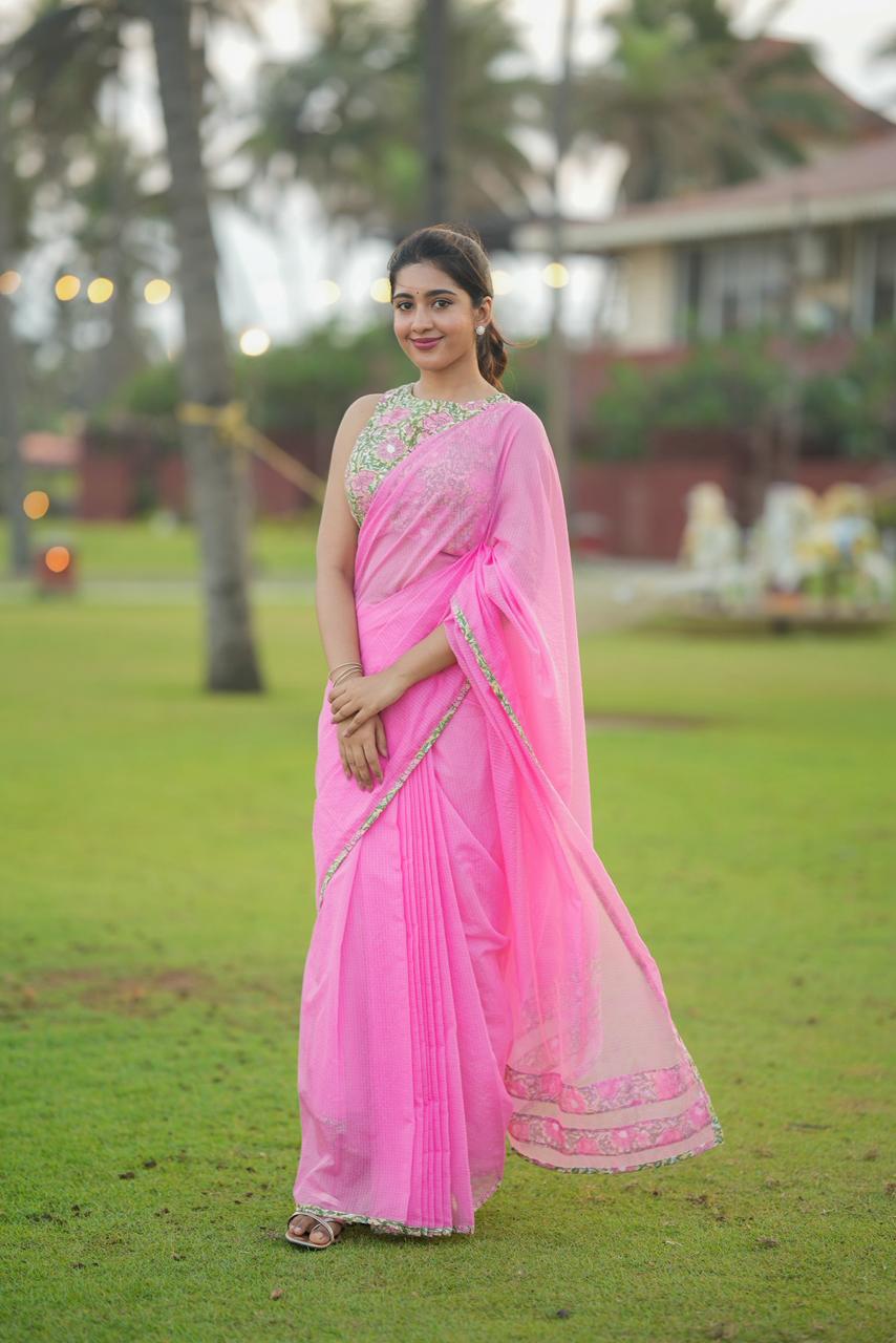 Delicate, dreamy, and effortlessly elegant, Haniya KOTA Luxe is a celebration of soft florals and timeless femininity. The saree features a soothing blush pink base, elevated with vintage-inspired floral borders that bring a gentle, romantic charm to the drape.