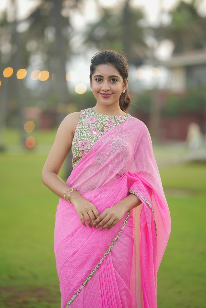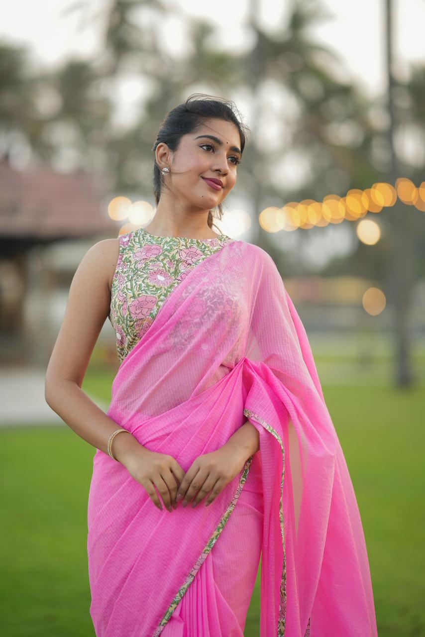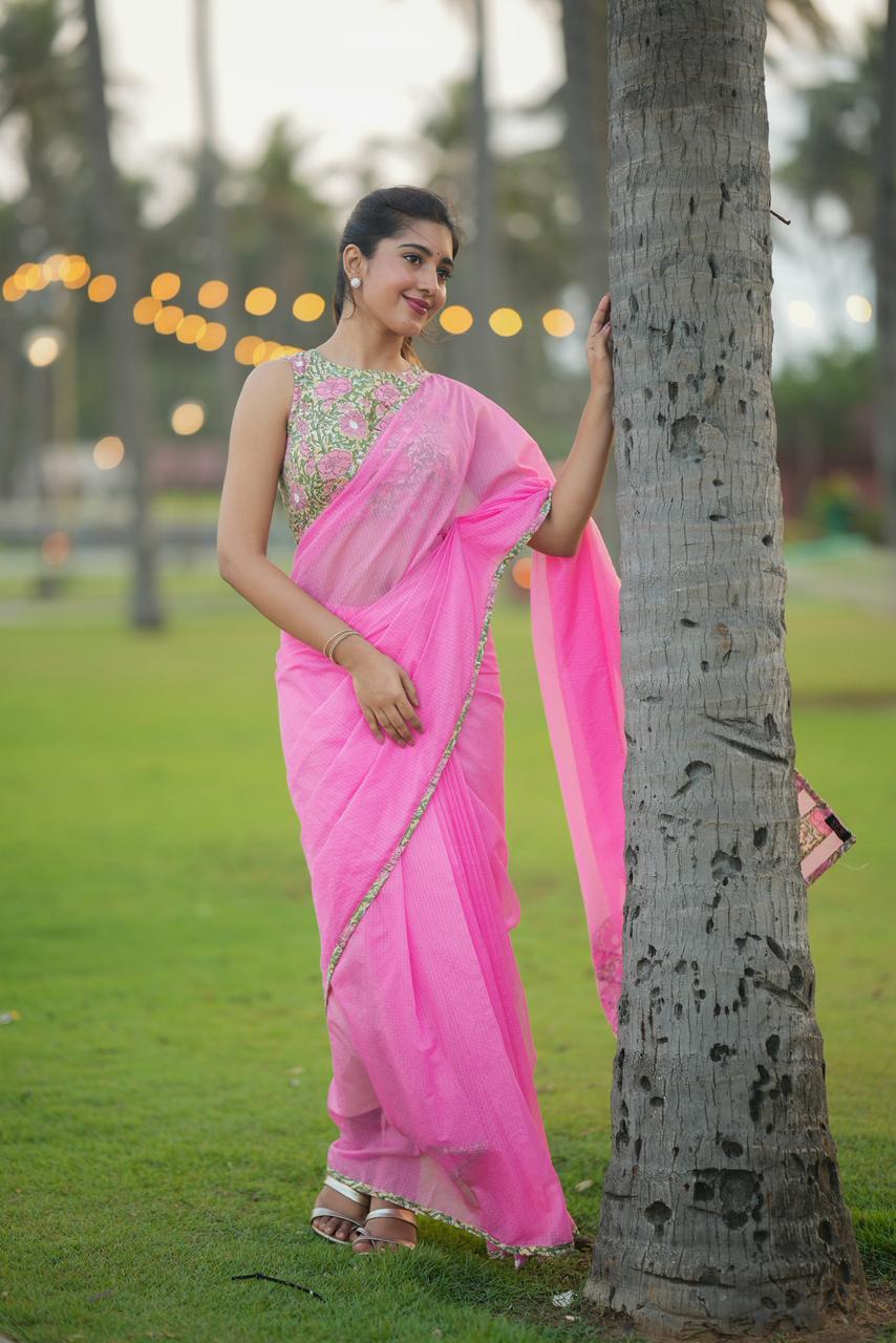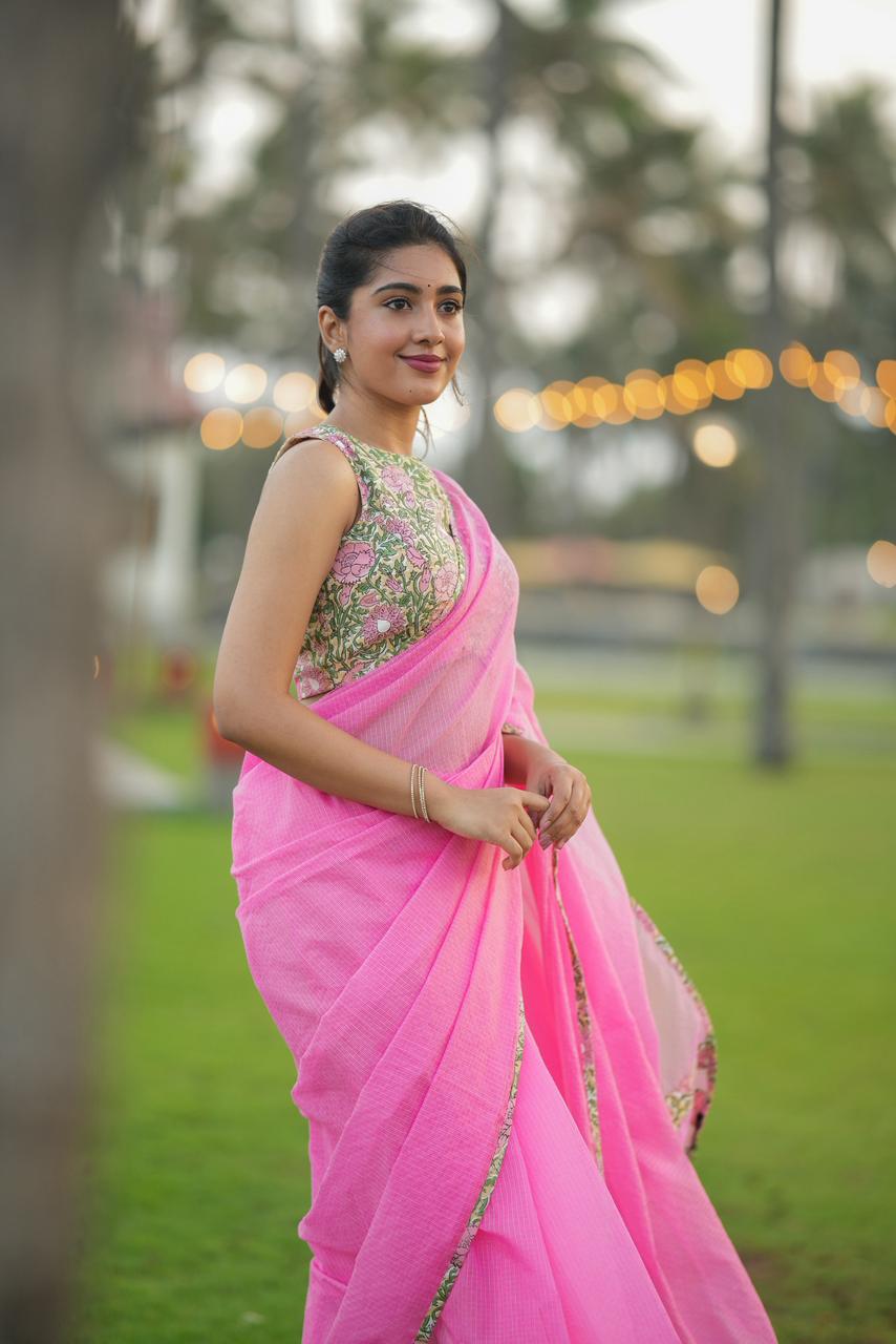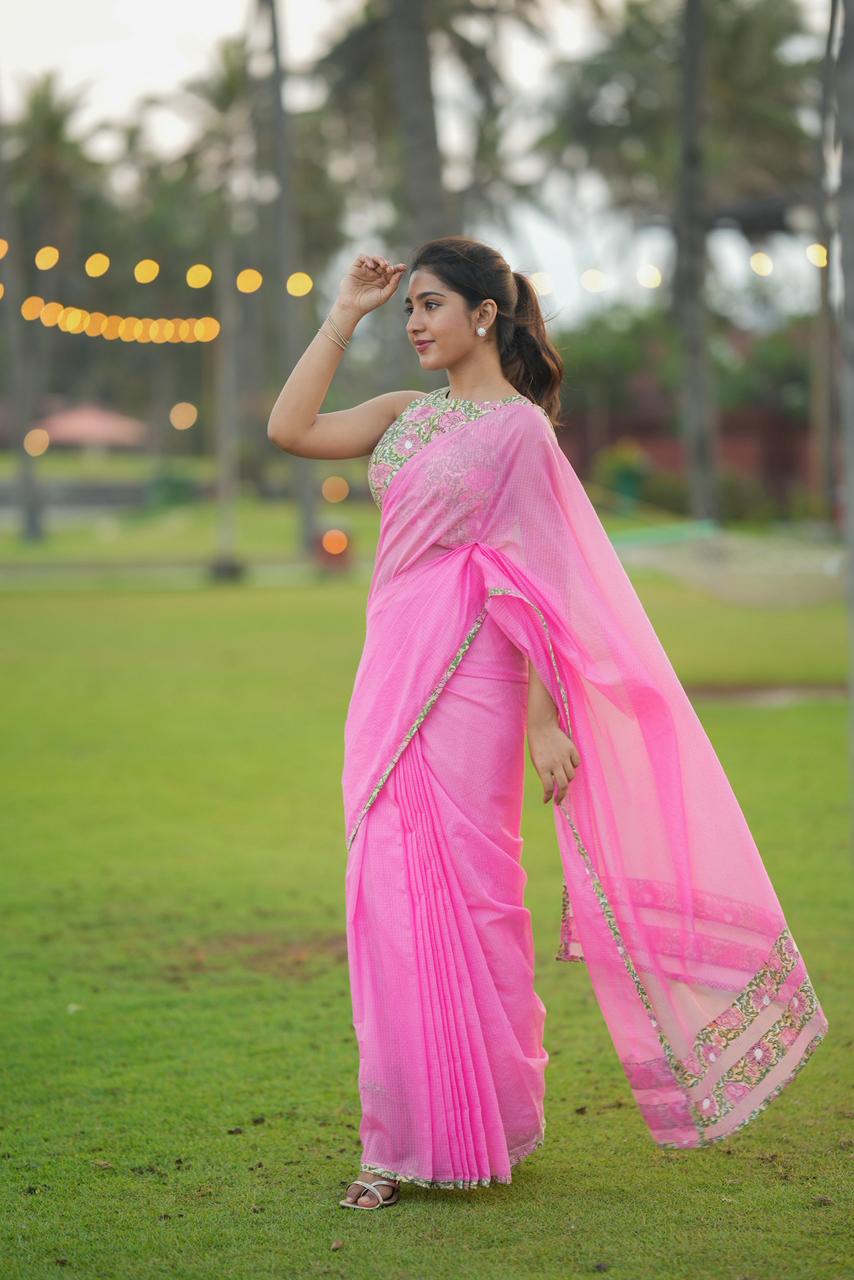 Delicate, dreamy, and effortlessly elegant, Haniya KOTA Luxe is a celebration of soft florals and timeless femininity. The saree features a soothing blush pink base, elevated with vintage-inspired floral borders that bring a gentle, romantic charm to the drape.