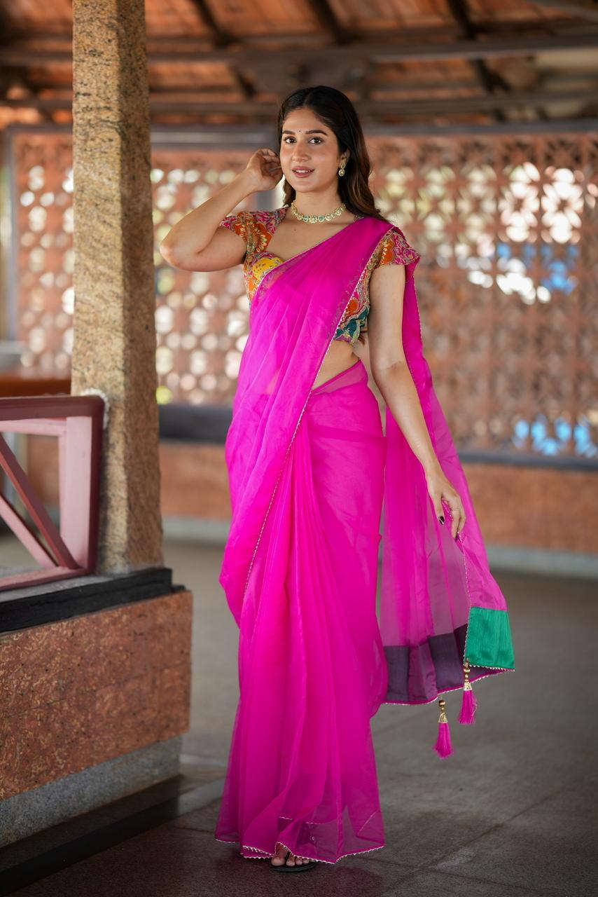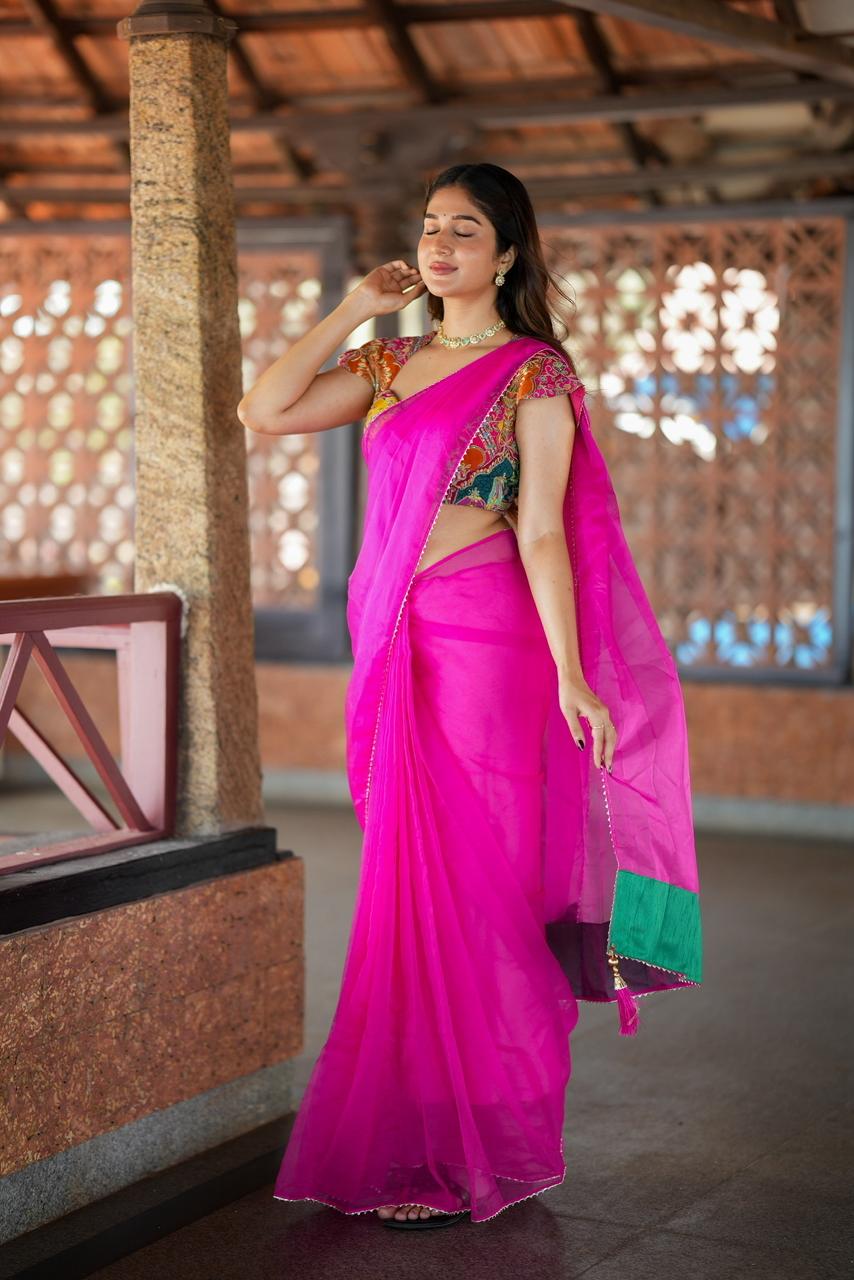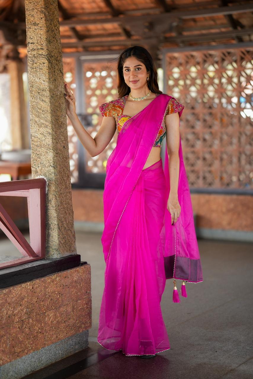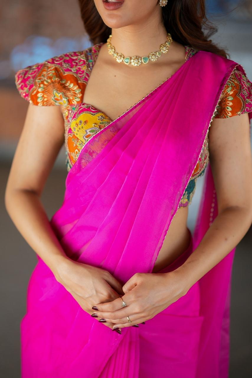Grand, vibrant, and exquisitely detailed, Hazeera Royal Luxe is designed for moments that call for pure celebration. The saree features a striking drape in rich pink creating a bold yet elegant contrast that instantly elevates your presence.