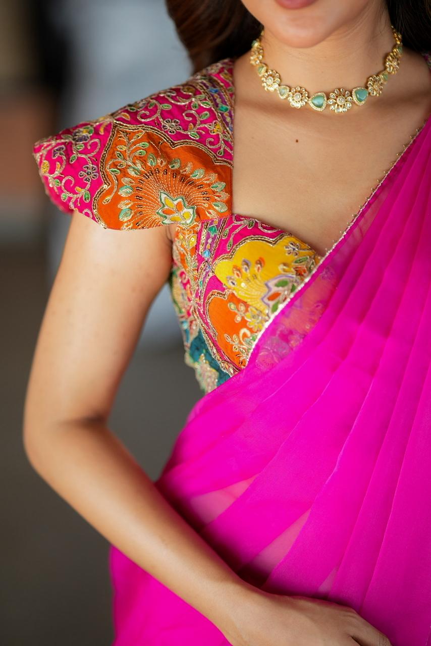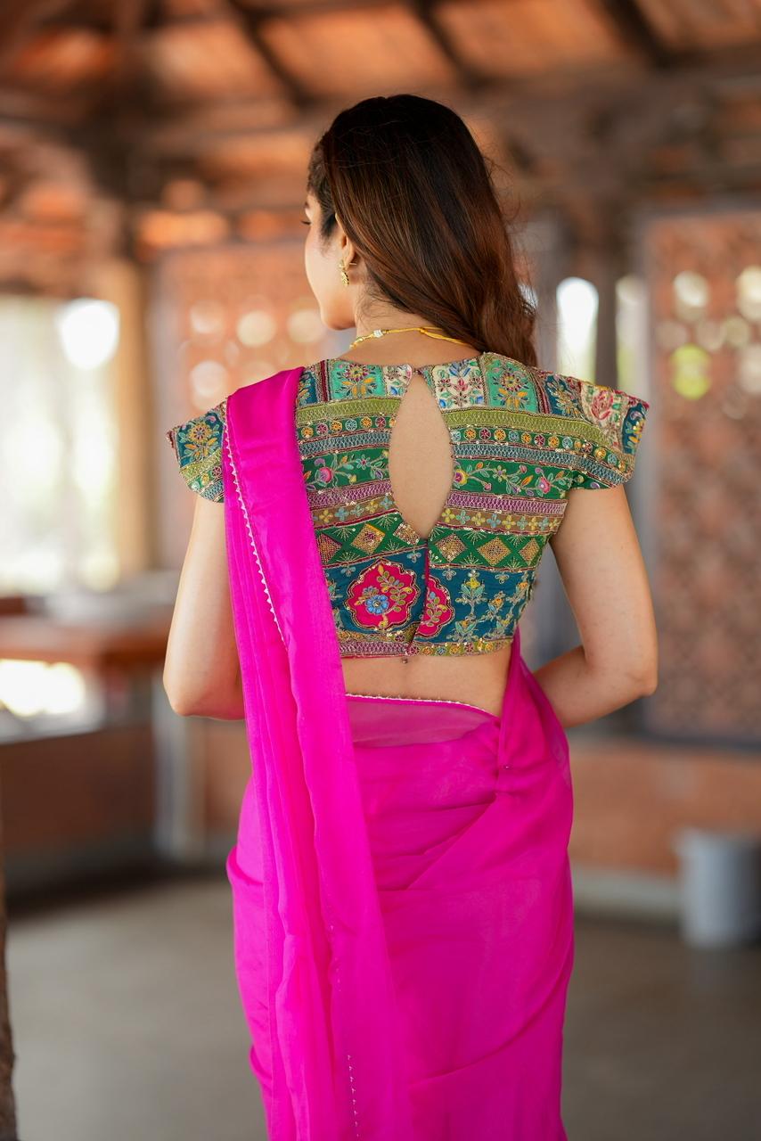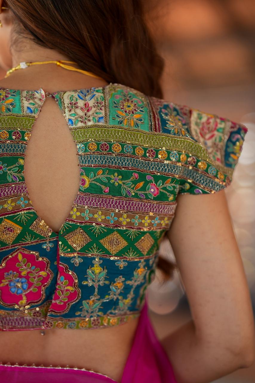 The blouse is a masterpiece of craftsmanship, adorned with intricate multicolor embroidery inspired by regal motifs. With its structured silhouette and ornate detailing, it brings together traditional artistry and modern statement styling in the most captivating way.