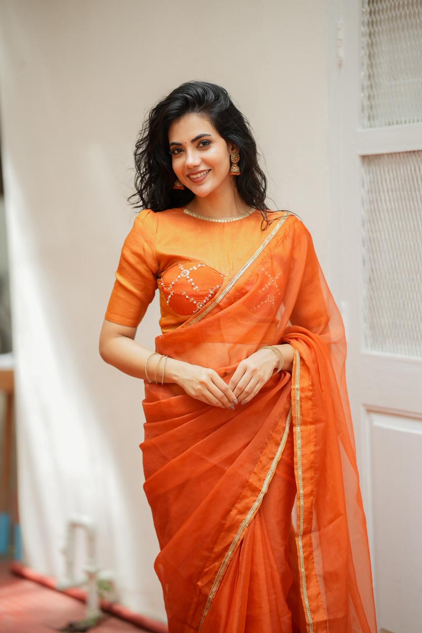 Saffron-orange organza drape with diya-sparkle blouse detailing.