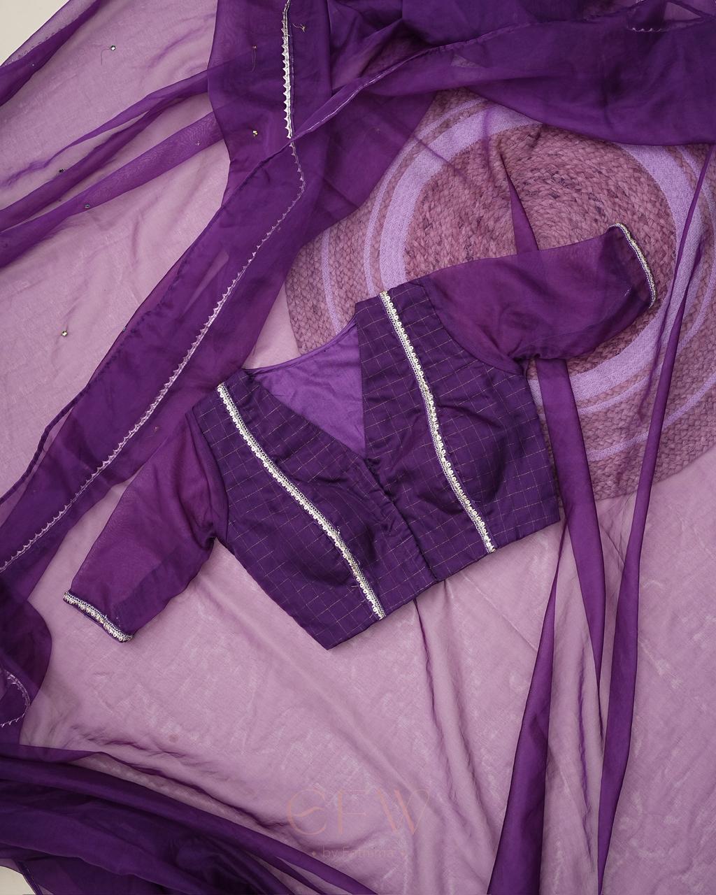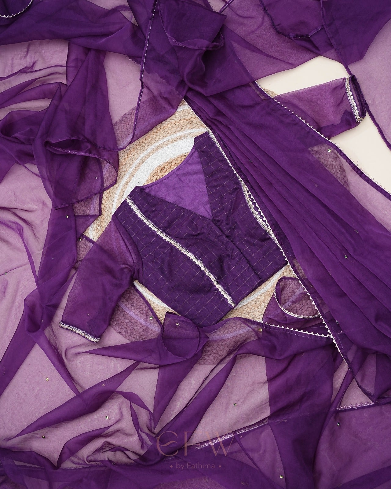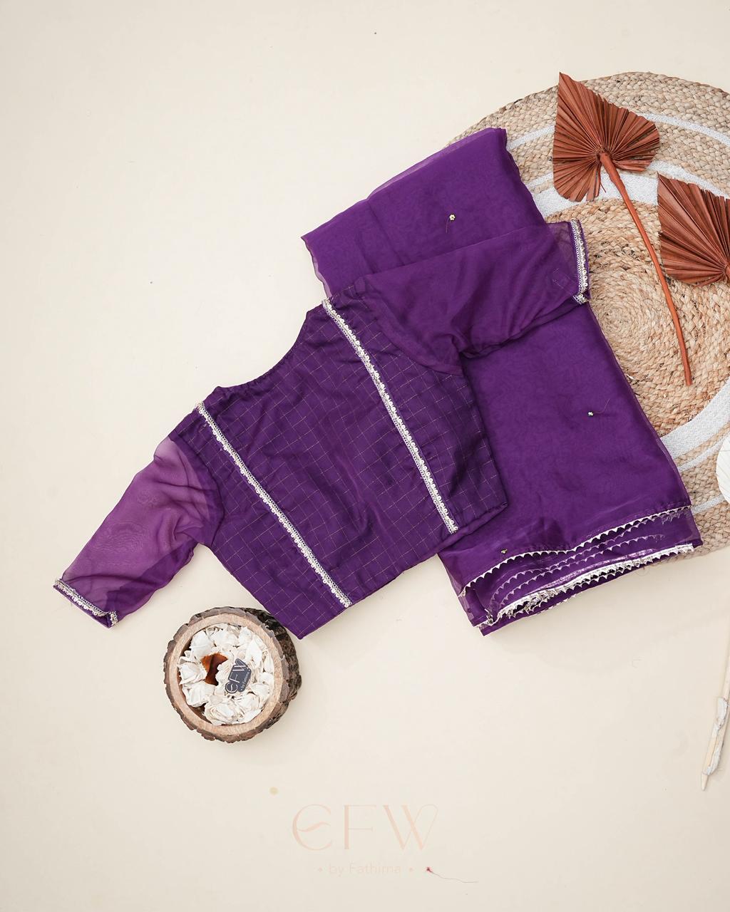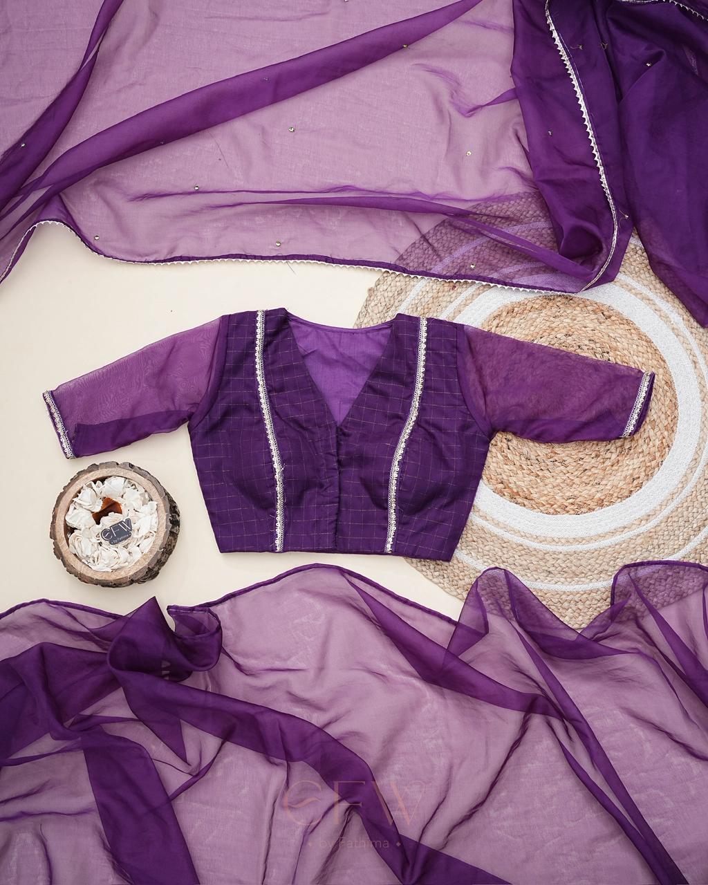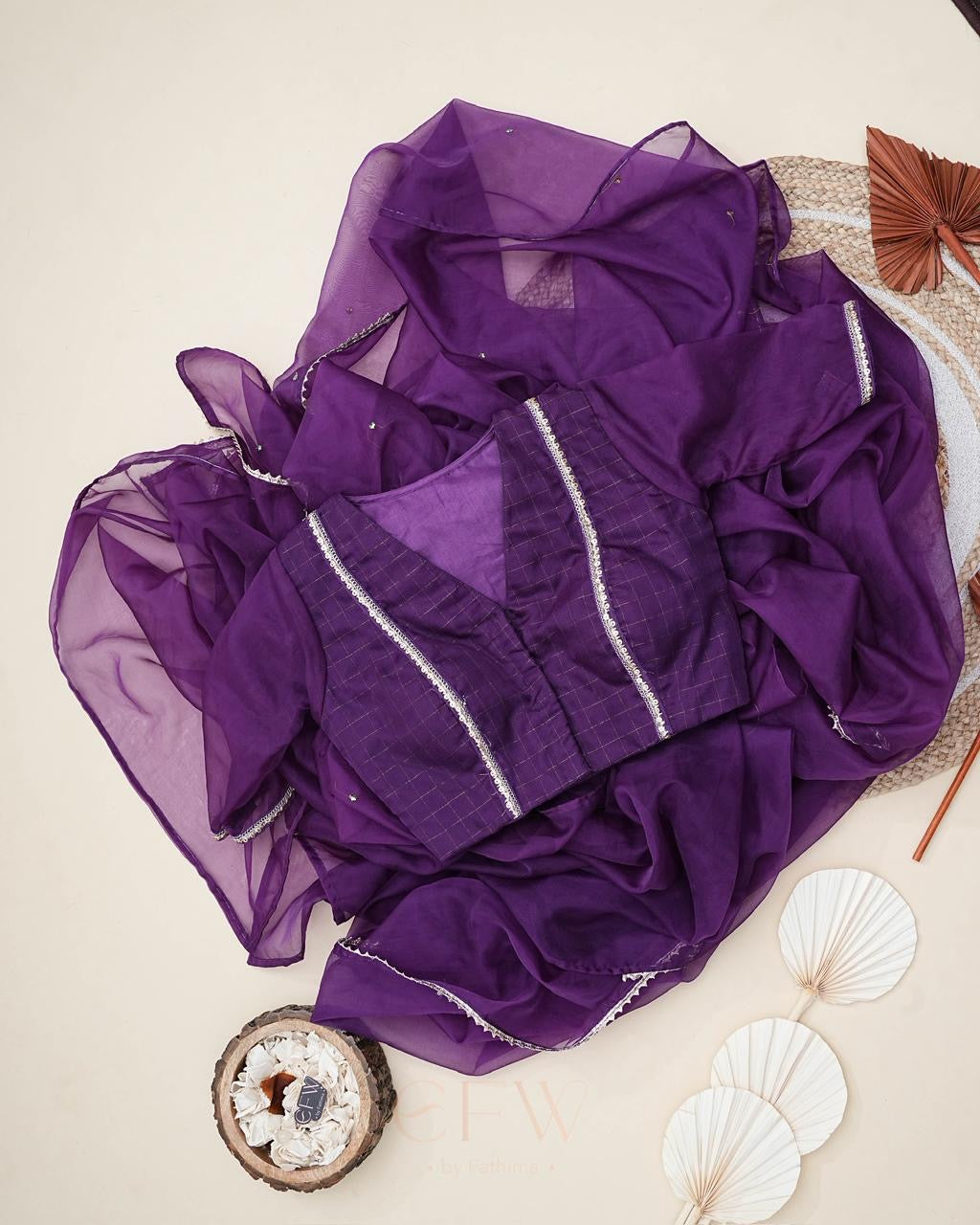 A rich royal-purple organza saree set crafted for effortless elegance and soft drama. The smooth, flowy drape catches light beautifully, while the blouse features chic statement lace detailing on both sides for a polished, premium finish.