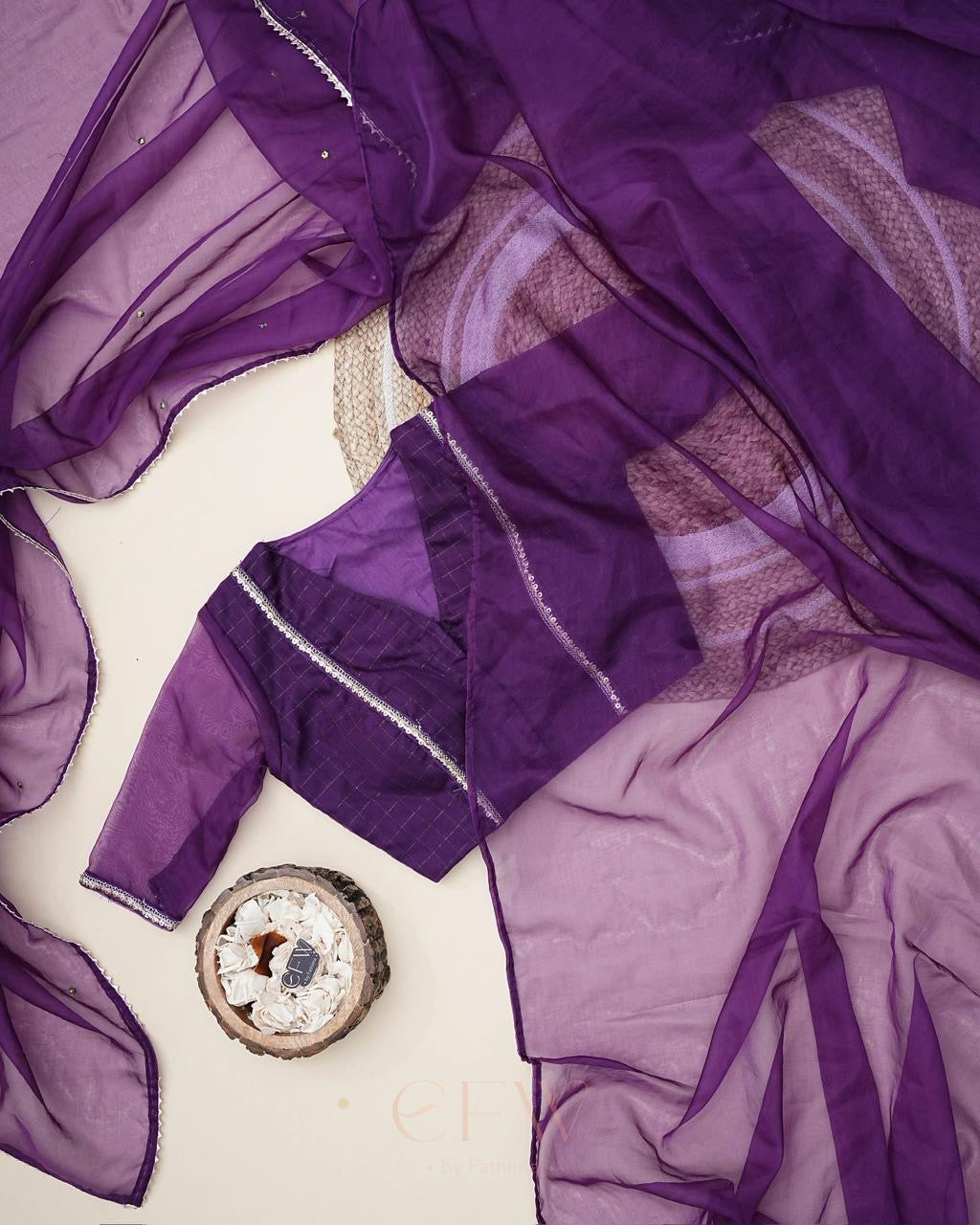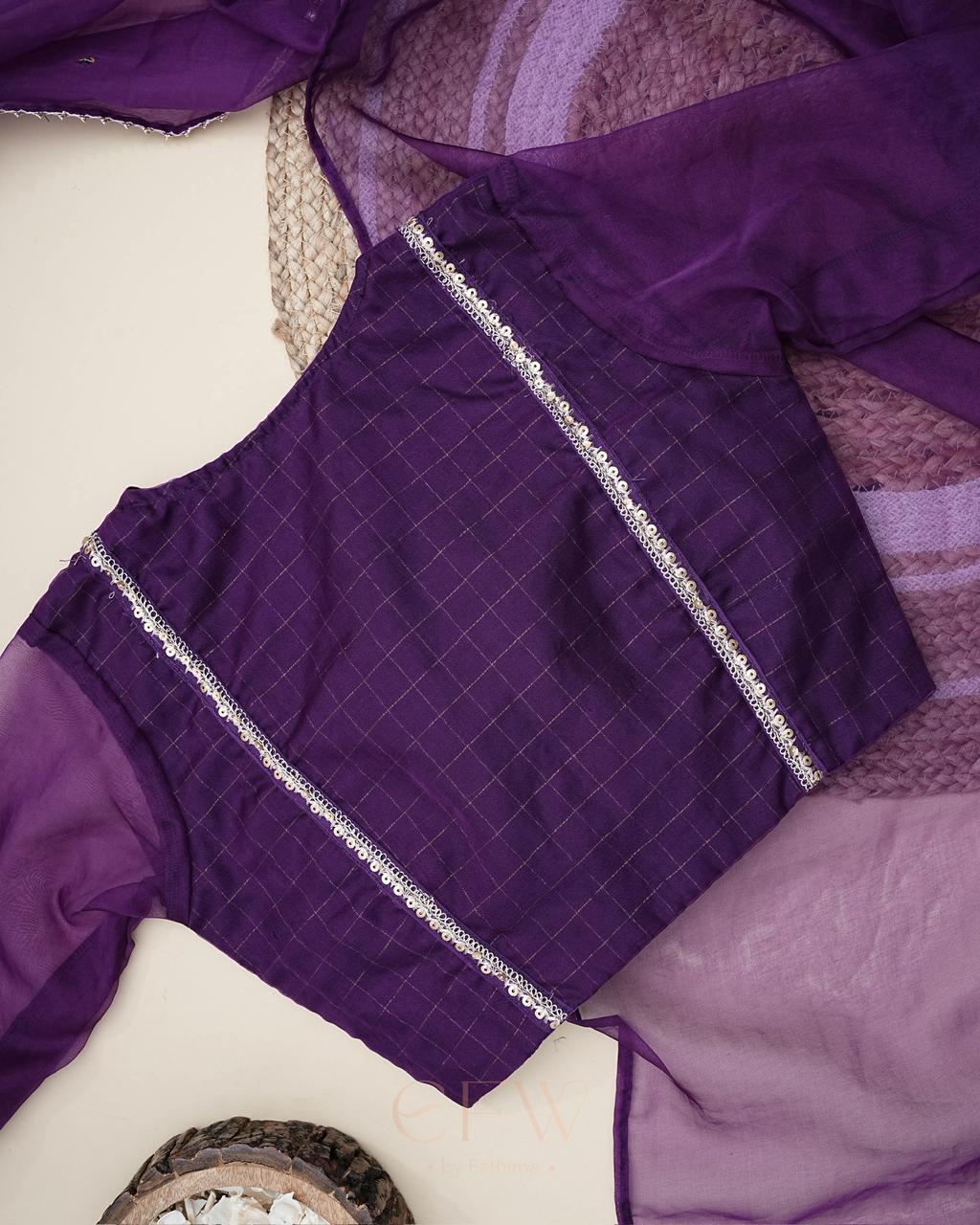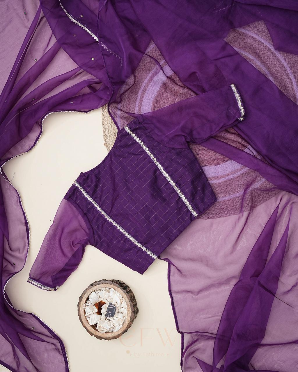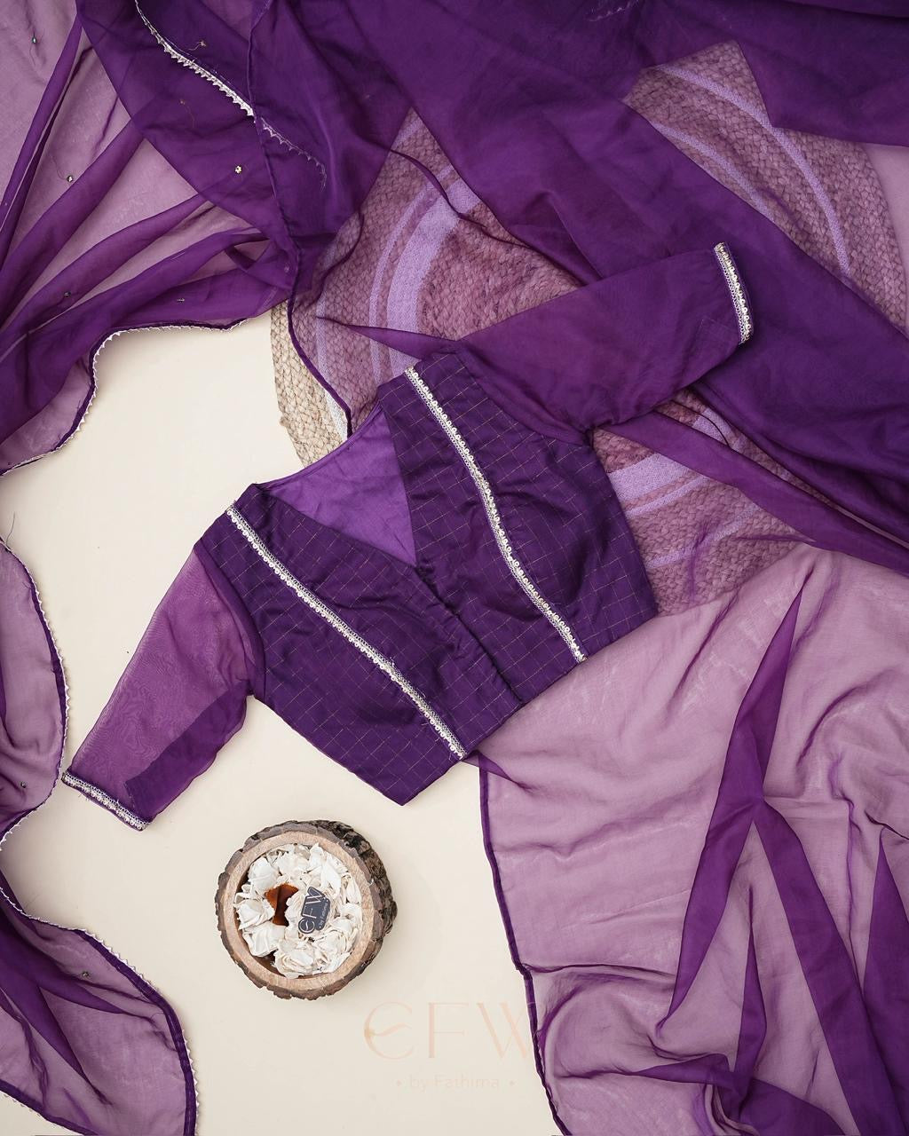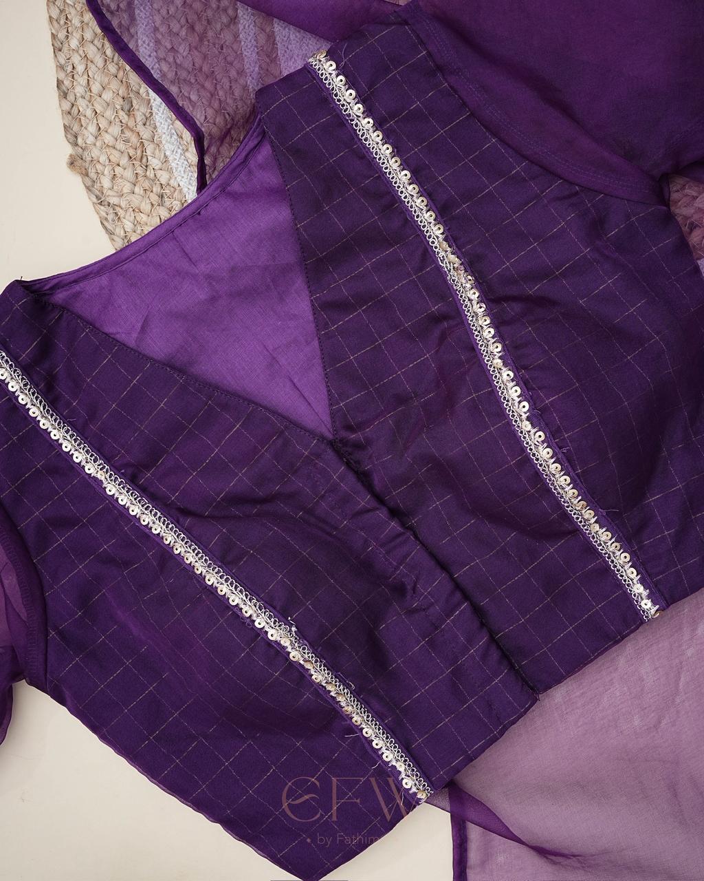 A rich royal-purple organza saree set crafted for effortless elegance and soft drama. The smooth, flowy drape catches light beautifully, while the blouse features chic statement lace detailing on both sides for a polished, premium finish.