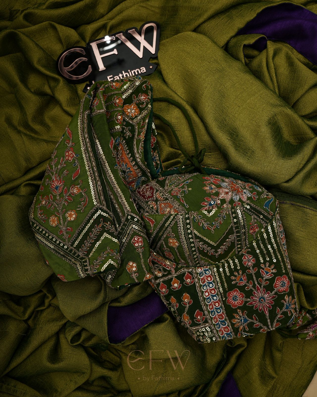 The blouse, in rich plum-purple, is a statement of intricate opulence. Embellished with multi-thread embroidery, zari, sequins, and bead detailing, it tells a story of regal peacocks, florals, and ornate motifs that shimmer with every movement. The back-cut detailing adds a contemporary flair, making it a versatile piece that stands beautifully on its own or paired traditionally.