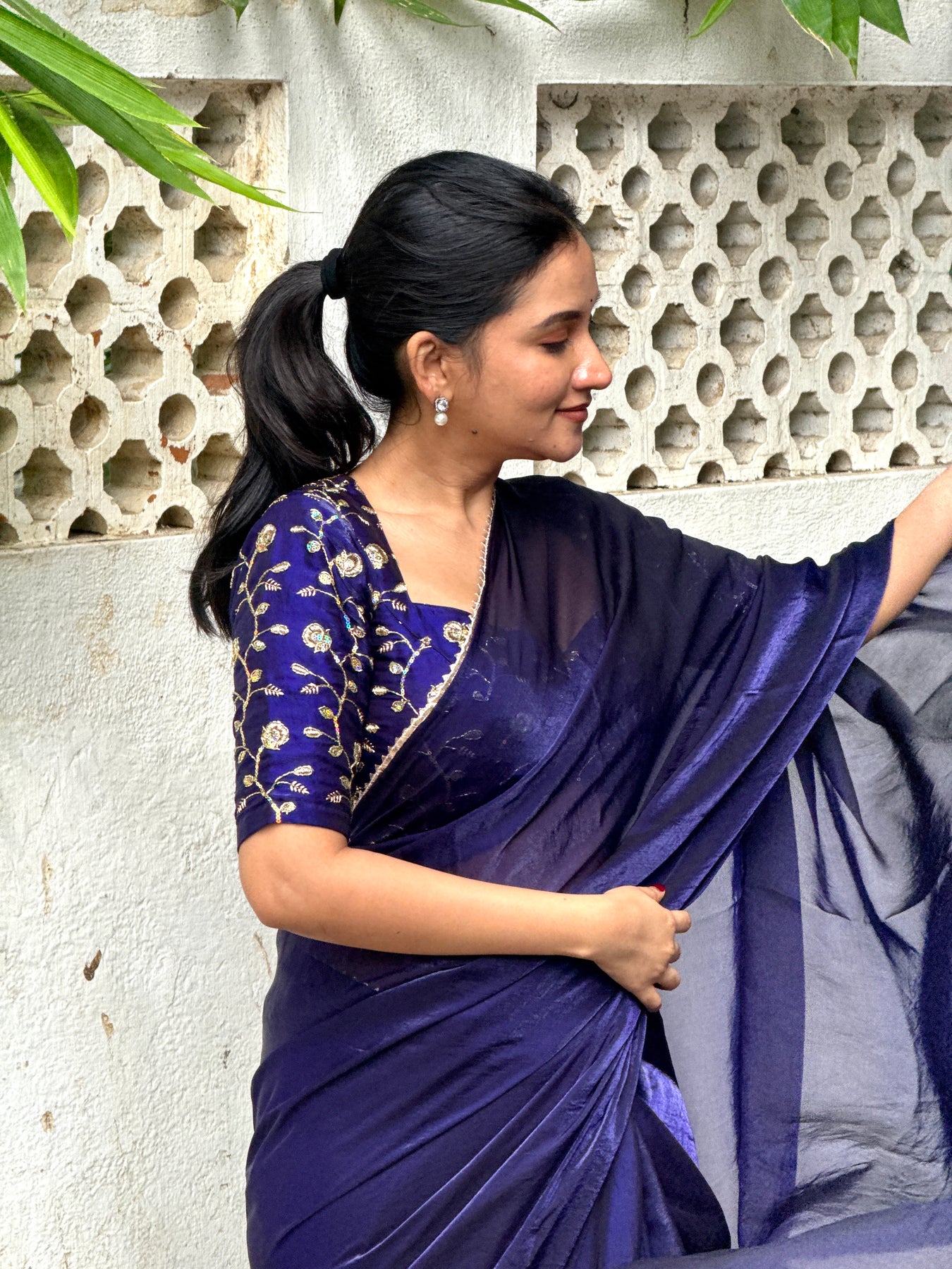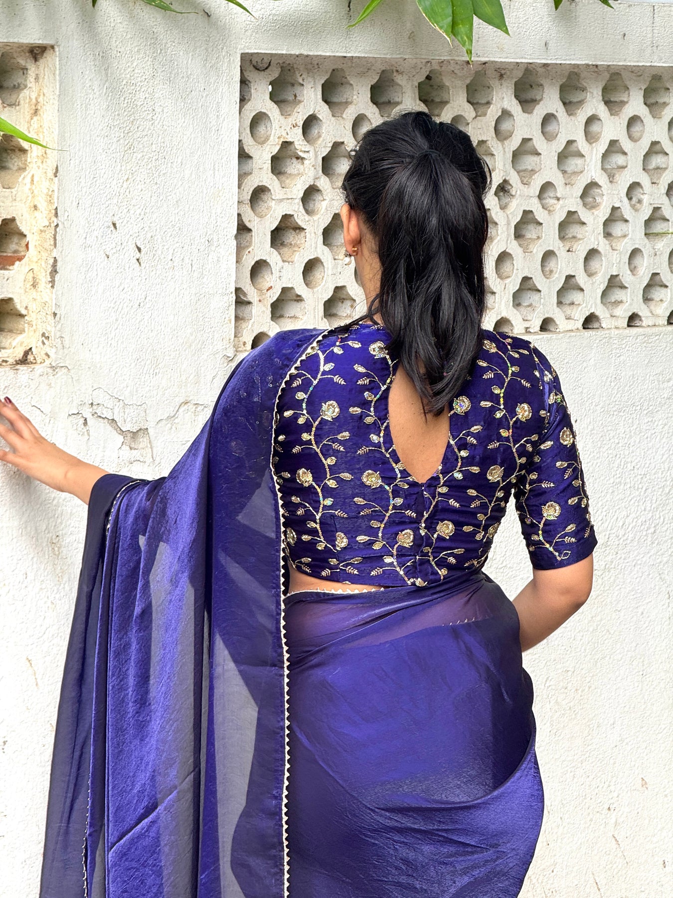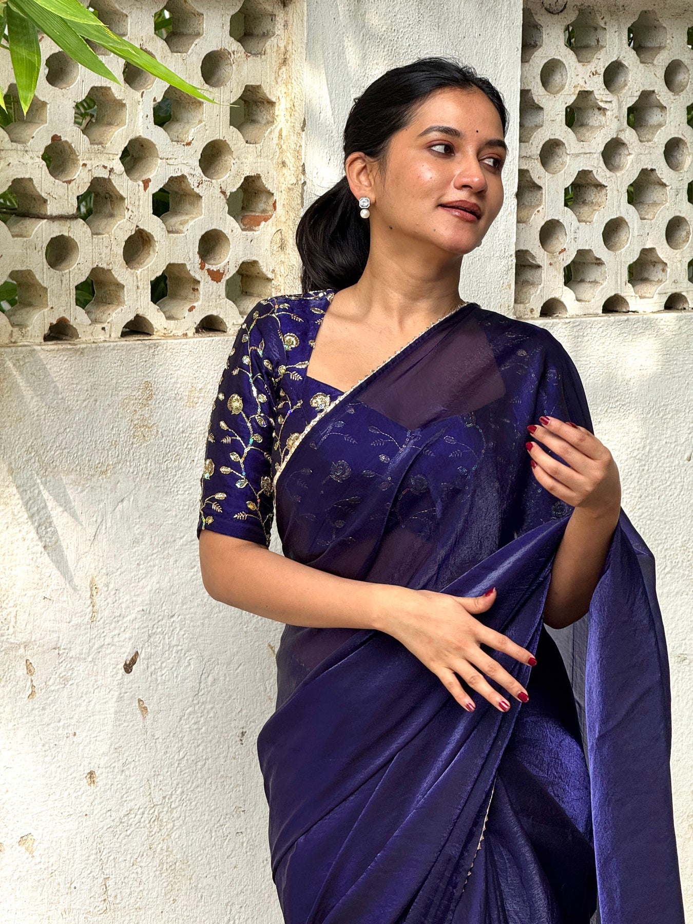 This stunning saree set in an opulent shade of royal blue radiates timeless grandeur and sophistication. The saree, crafted in smooth silk with a lustrous finish, drapes elegantly, creating a rich, regal flow. The matching blouse stands out with its intricate golden floral embroidery highlighted by subtle sequin accents, adding a luminous charm that catches the light beautifully. The deep hue contrasts gracefully with the delicate lace edging on the saree, bringing together a perfect balance of elegance and celebration. Ideal for evening occasions, weddings, or festive gatherings, this ensemble embodies royal allure — bold, graceful, and exquisitely refined.