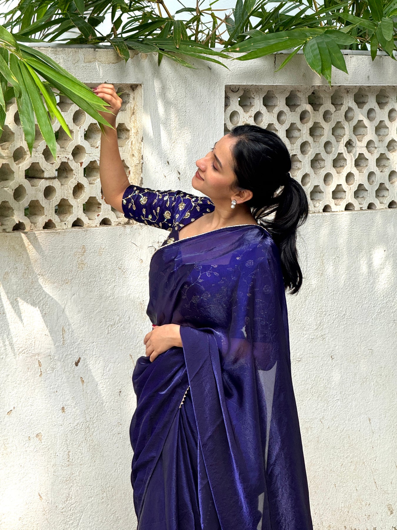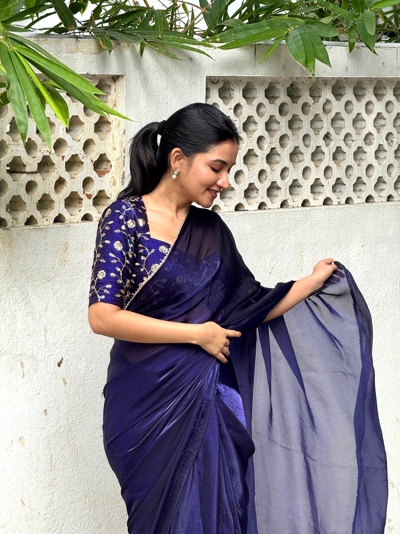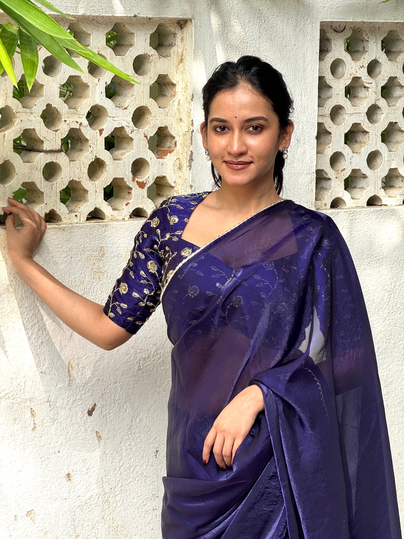 This stunning saree set in an opulent shade of royal blue radiates timeless grandeur and sophistication. The saree, crafted in smooth silk with a lustrous finish, drapes elegantly, creating a rich, regal flow. The matching blouse stands out with its intricate golden floral embroidery highlighted by subtle sequin accents, adding a luminous charm that catches the light beautifully. The deep hue contrasts gracefully with the delicate lace edging on the saree, bringing together a perfect balance of elegance and celebration. Ideal for evening occasions, weddings, or festive gatherings, this ensemble embodies royal allure — bold, graceful, and exquisitely refined.