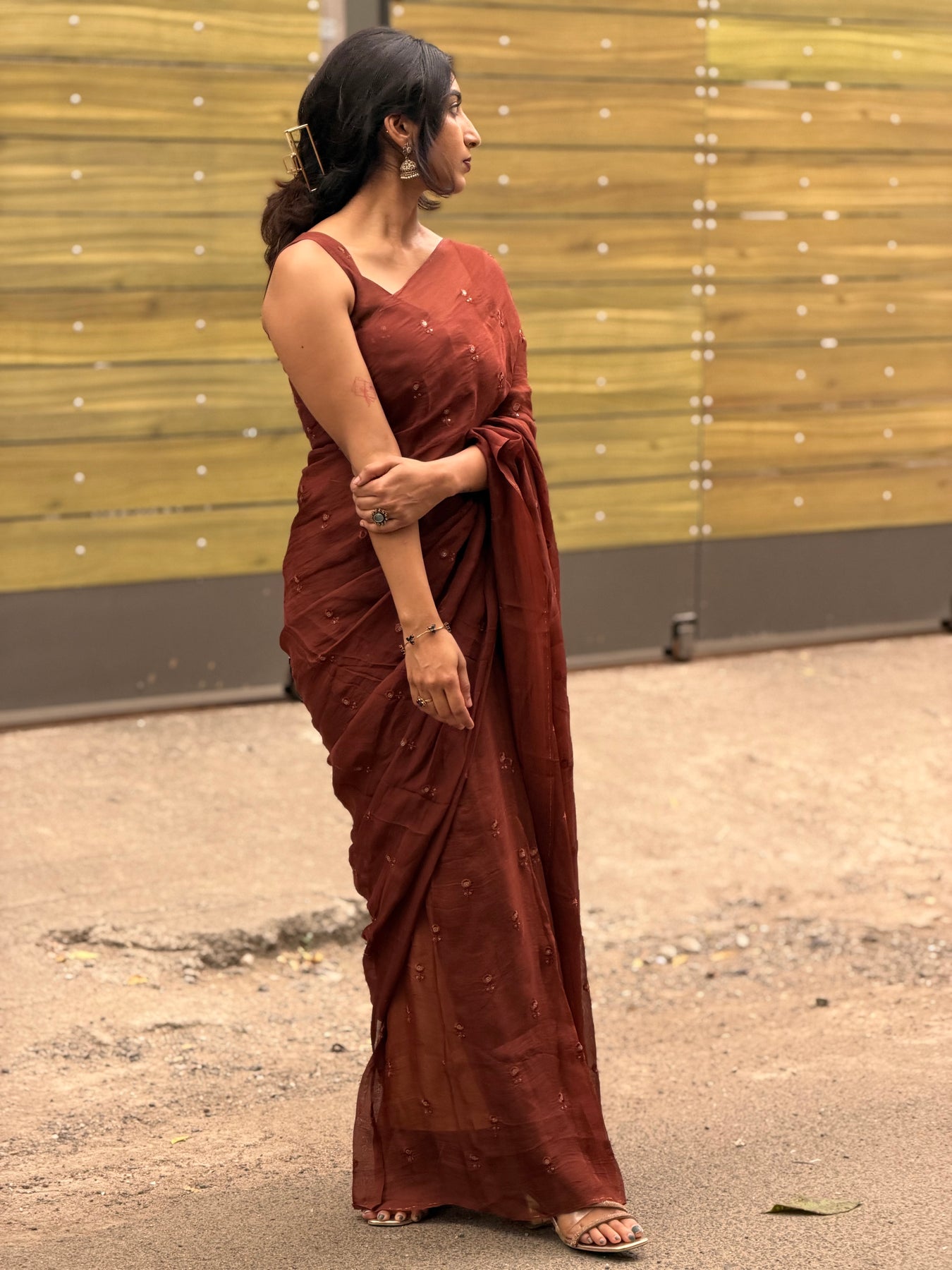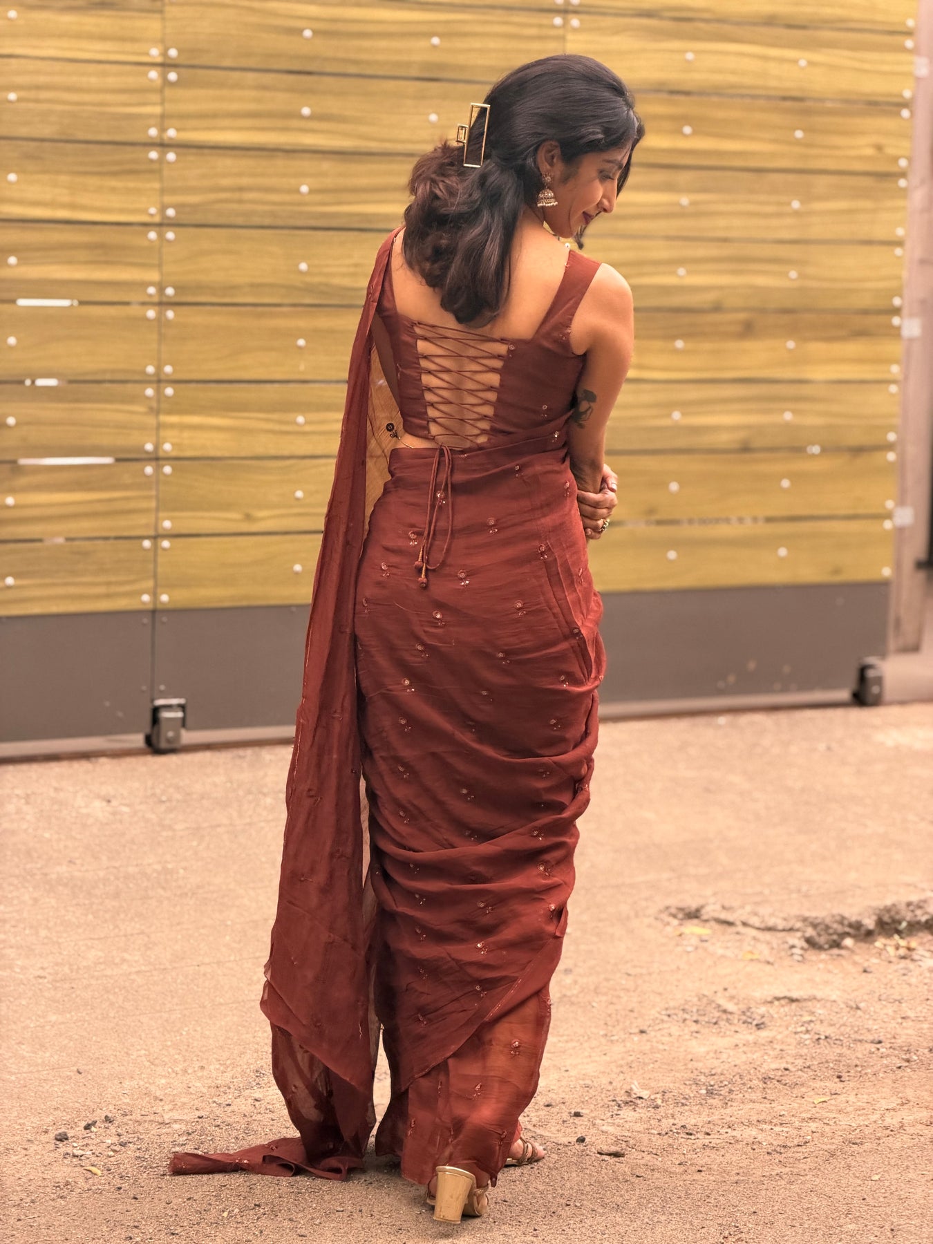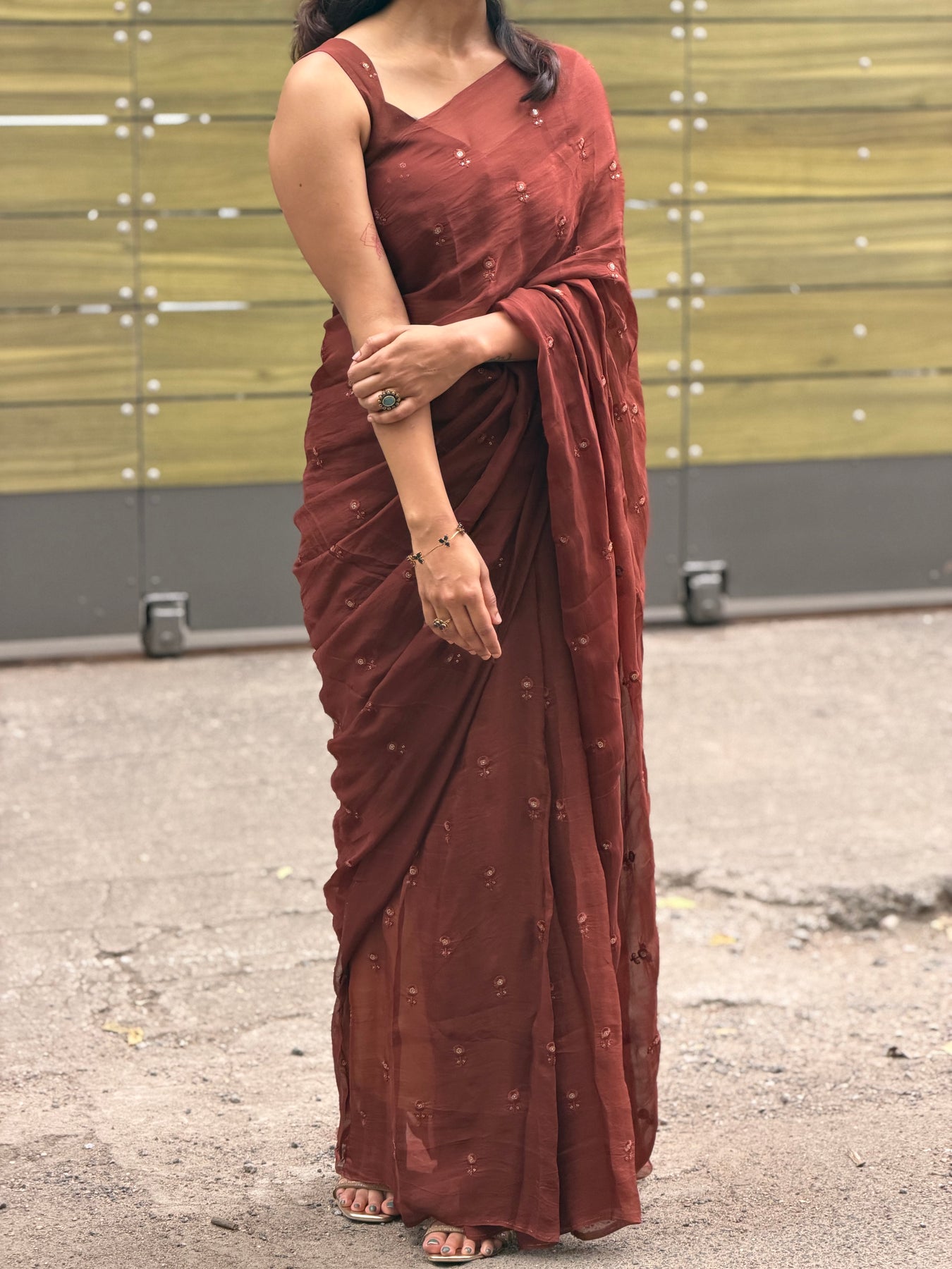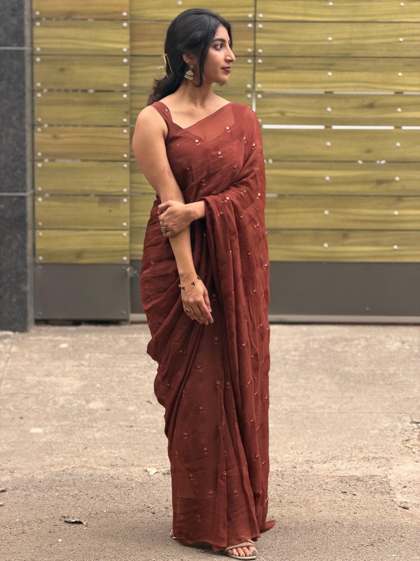 Paired with a customised blouse, thoughtfully designed to complement the saree's fluid texture and elevate the overall look. A timeless combination made for intimate celebrations, festive evenings, and refined occasions.