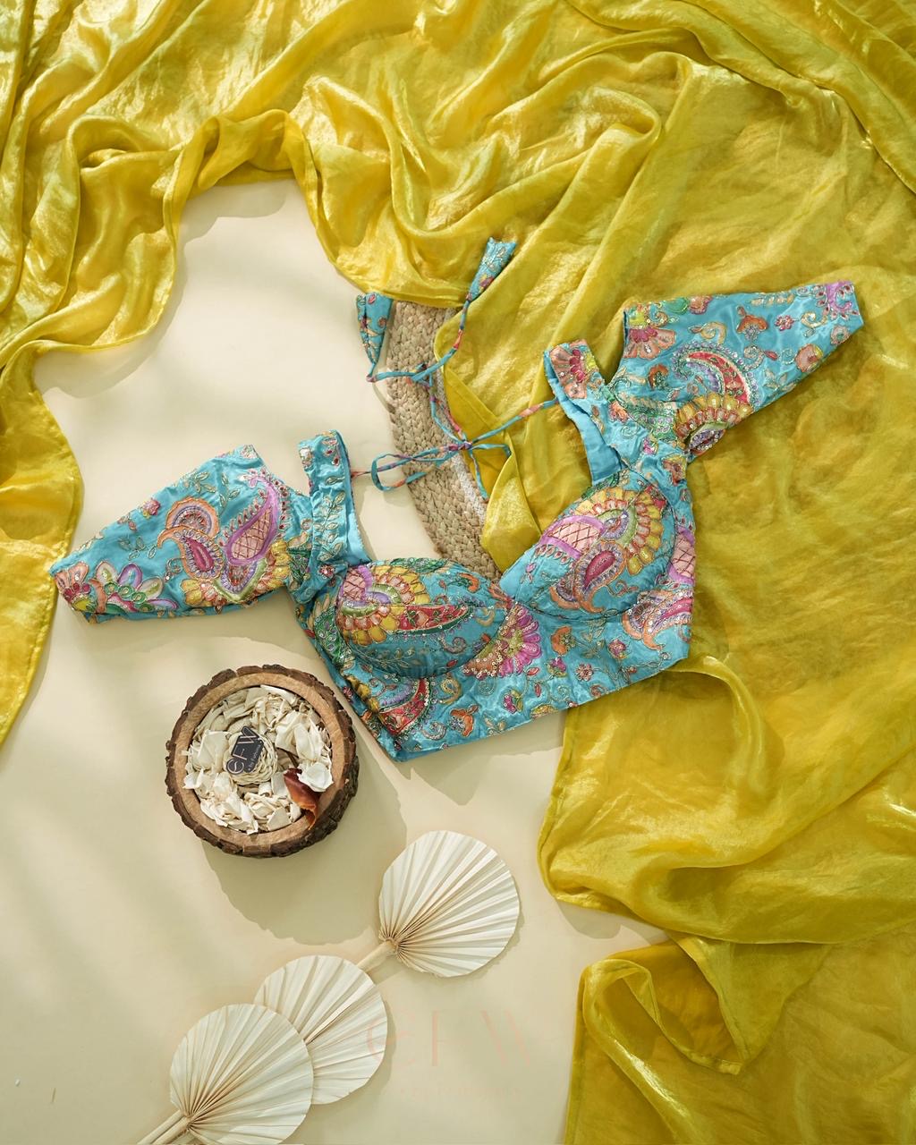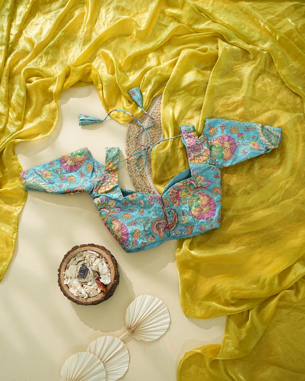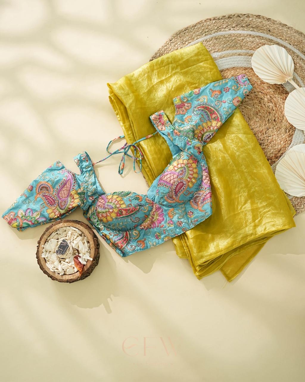 This vibrant saree set bursts with festive energy and modern charm. The saree, in a radiant shade of lemon yellow, is crafted from lustrous silk that drapes gracefully, adding a luminous glow to the look. Its statement blouse in turquoise blue steals the spotlight with intricate multicolour embroidery in paisley and floral motifs, enhanced with sequin and thread detailing for a playful yet elegant finish. The combination of bright hues creates a joyful contrast that reflects confidence and creativity. Perfect for haldi ceremonies, festive celebrations, or daytime events, this ensemble is a celebration of color, artistry, and youthful sophistication — a piece that instantly uplifts any occasion with its lively allure.