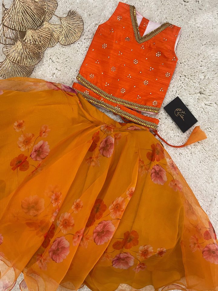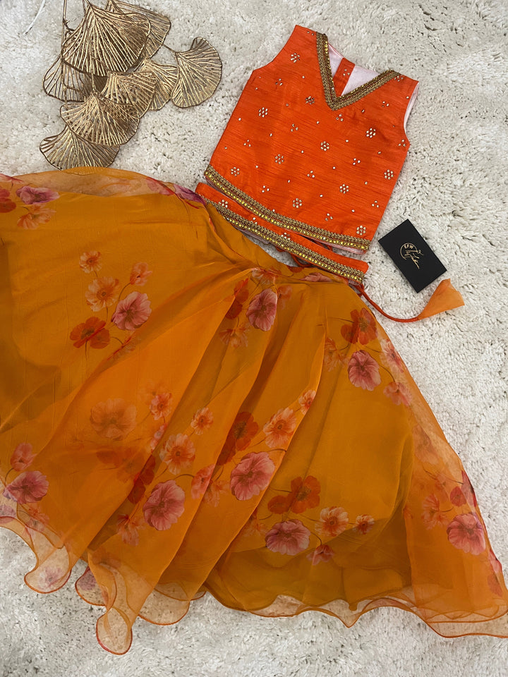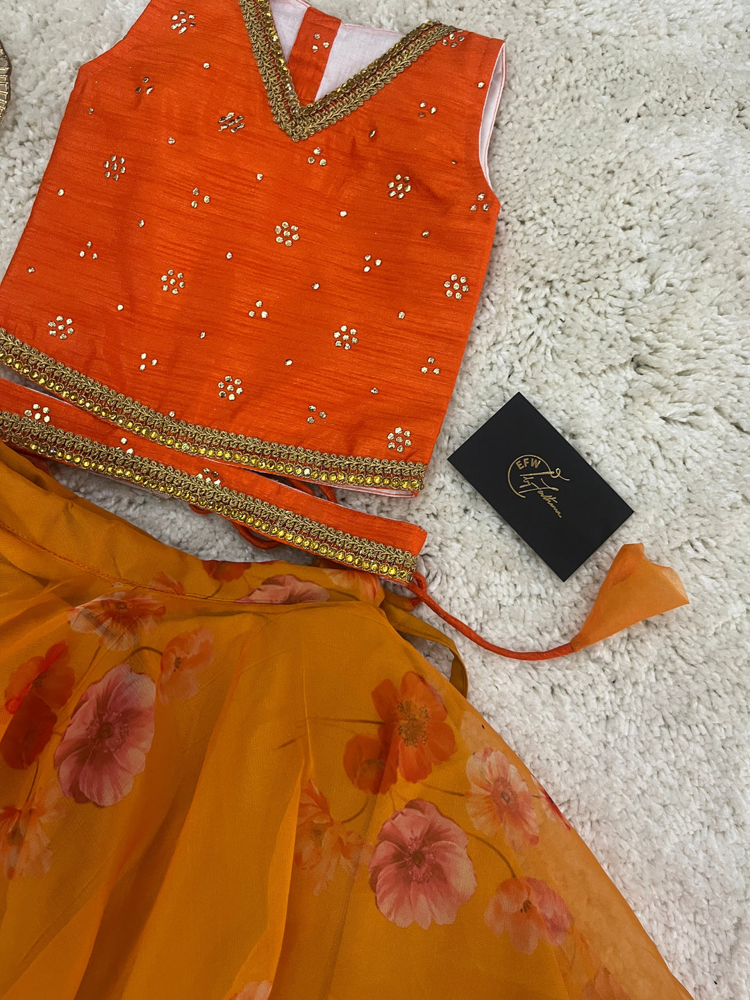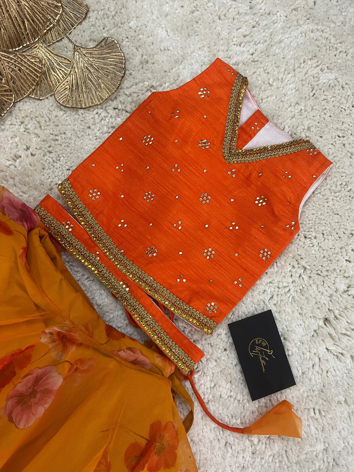 Elevate your little one’s wardrobe with the Saanvi Bloom, a delightful two-piece outfit that radiates charm and elegance. This vibrant ensemble features a flowing orange floral-printed skirt crafted from soft, sheer fabric, exuding grace and comfort. Paired with a bright orange blouse adorned with intricate golden embroidery and delicate embellishments, the outfit combines tradition with a touch of modern flair.
