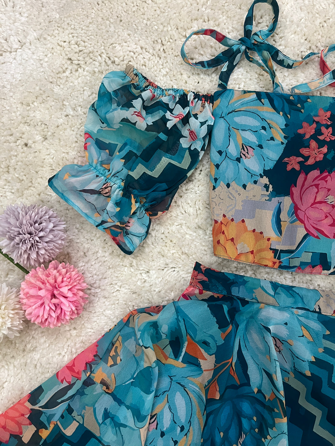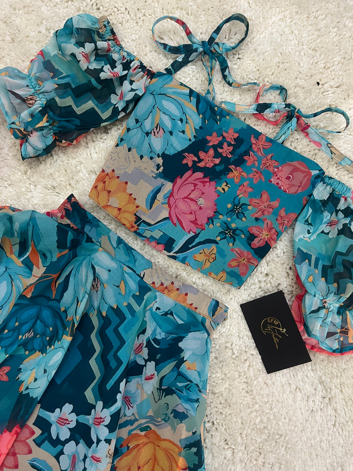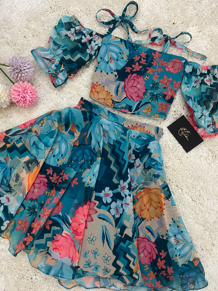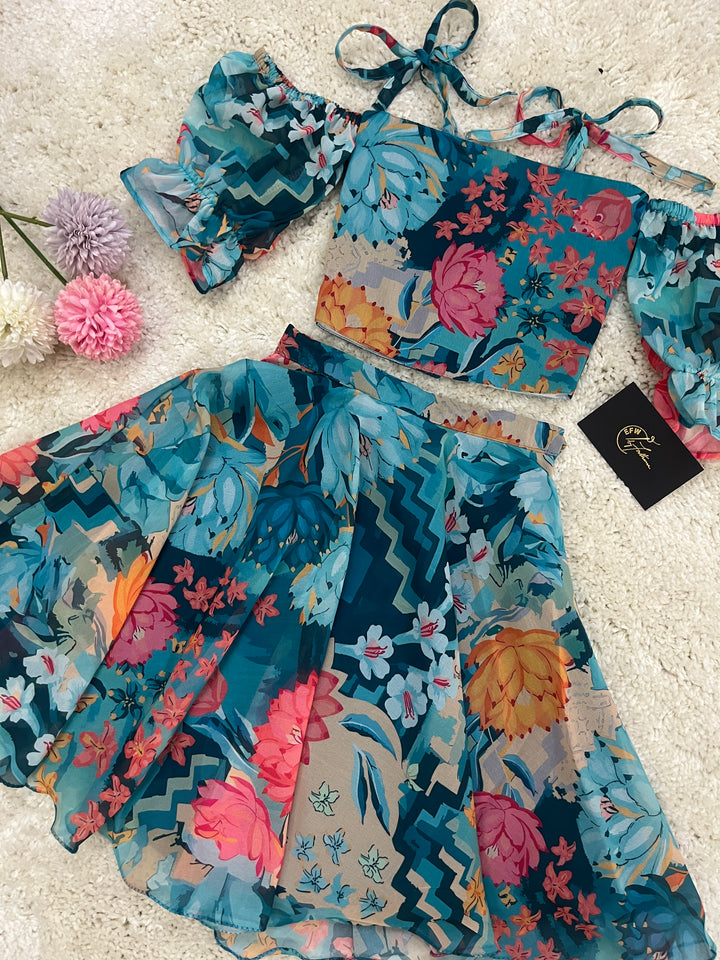 Unleash the beauty of a blooming garden with Malaroli, an exquisite outfit inspired by the charm of flora. The vibrant floral prints on a teal base evoke the freshness of nature, while the trendy off-shoulder blouse with tie-up straps brings a playful modern twist. Paired with a flowy, matching skirt, this ensemble radiates joy and elegance, making it perfect for festive occasions, outdoor gatherings, or casual celebrations. Let your little one shine like a flower in full bloom!