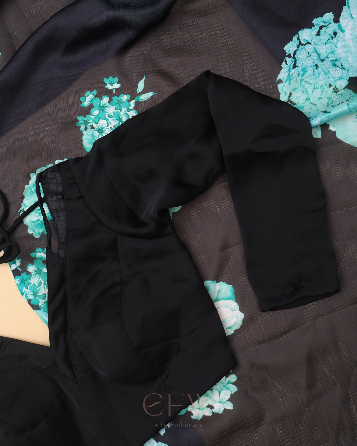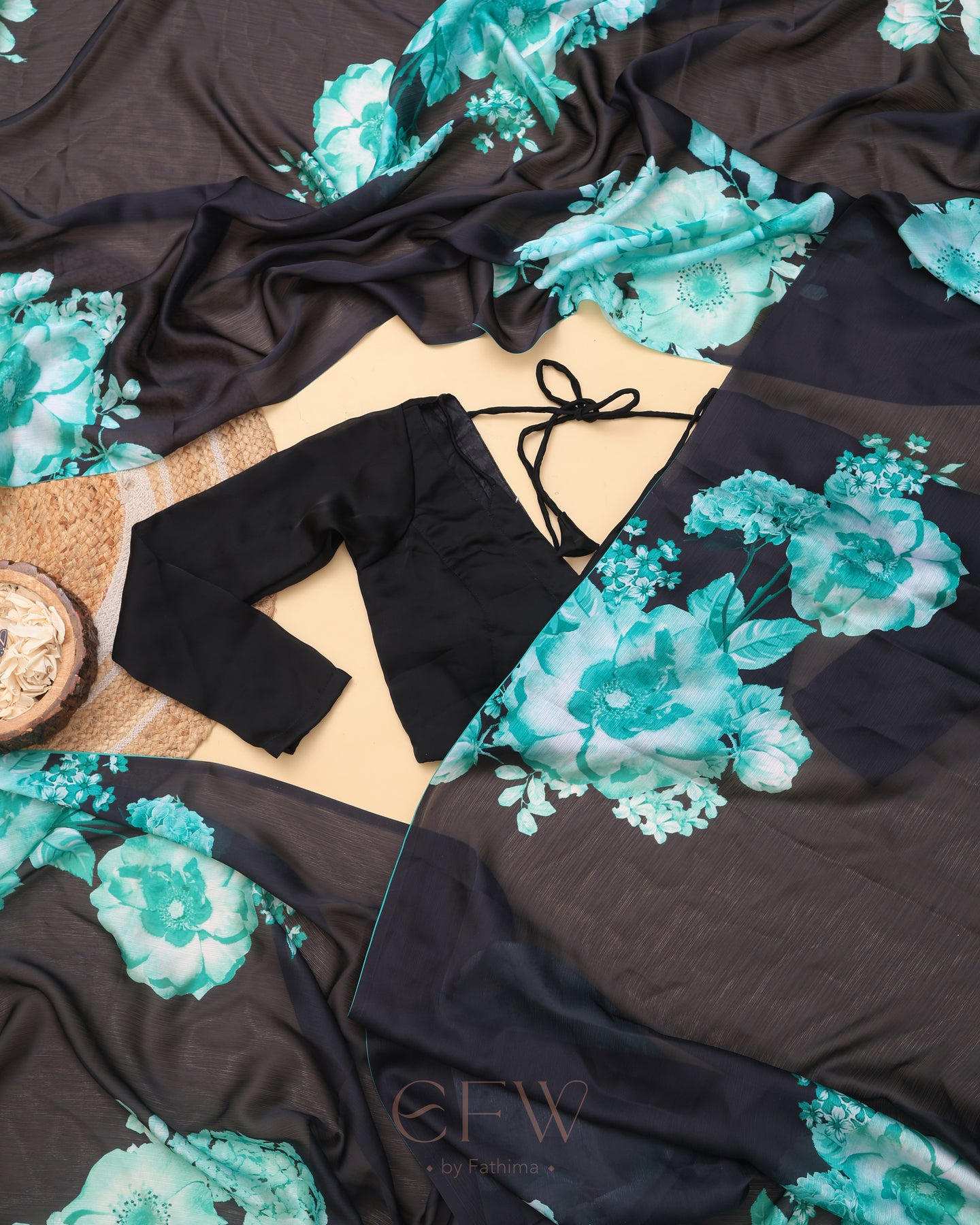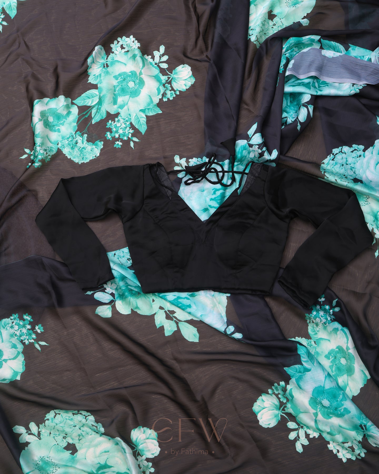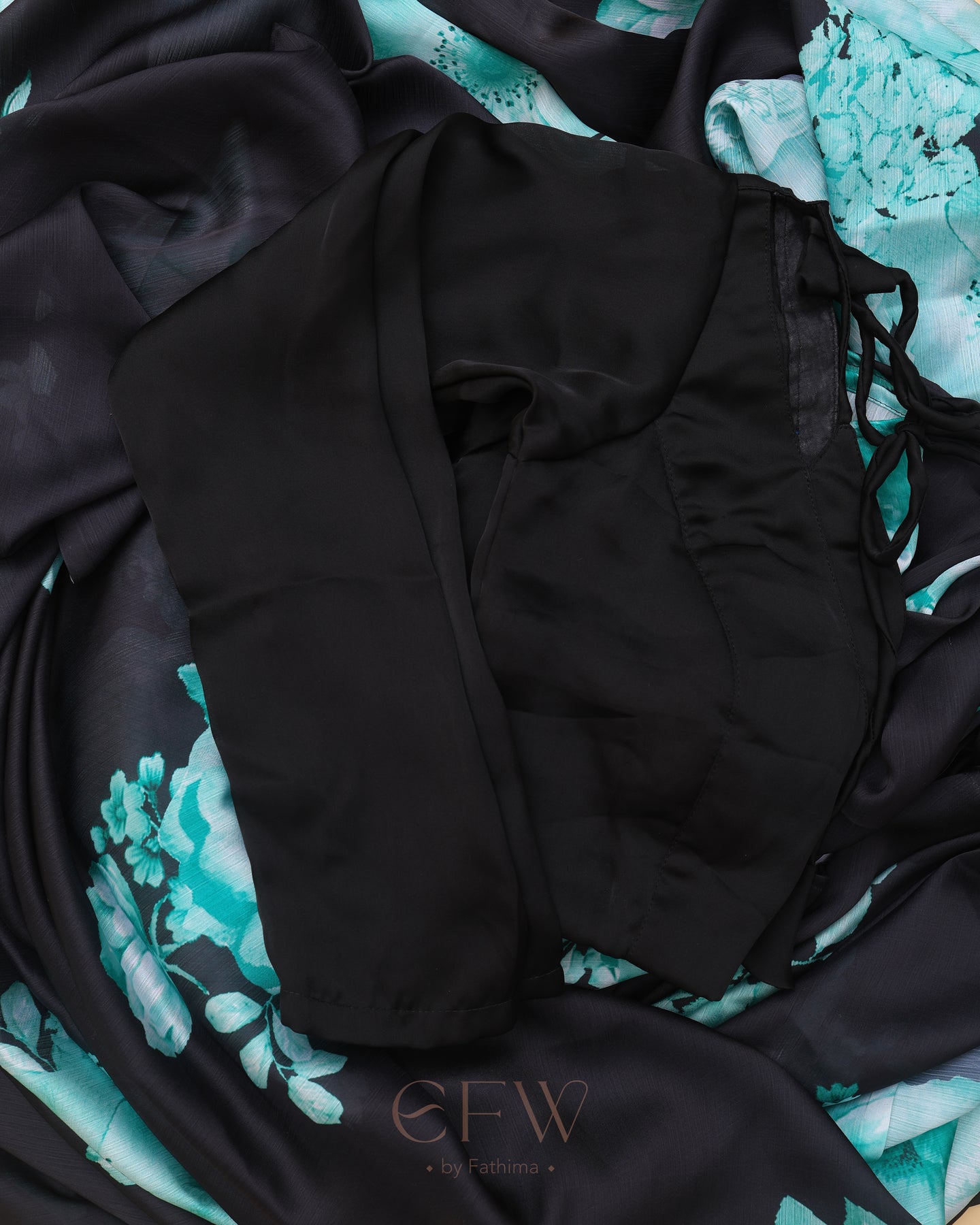 Drape yourself in the enigmatic charm of Ira, a saree that channels midnight elegance with a bold flourish. The sheer black georgette base flows effortlessly, creating a featherlight drape that glides over your silhouette with graceful fluidity. Its deep noir canvas is artistically adorned with radiant teal and seafoam floral blooms—digitally printed with striking clarity—evoking the calm intensity of moonlit gardens.