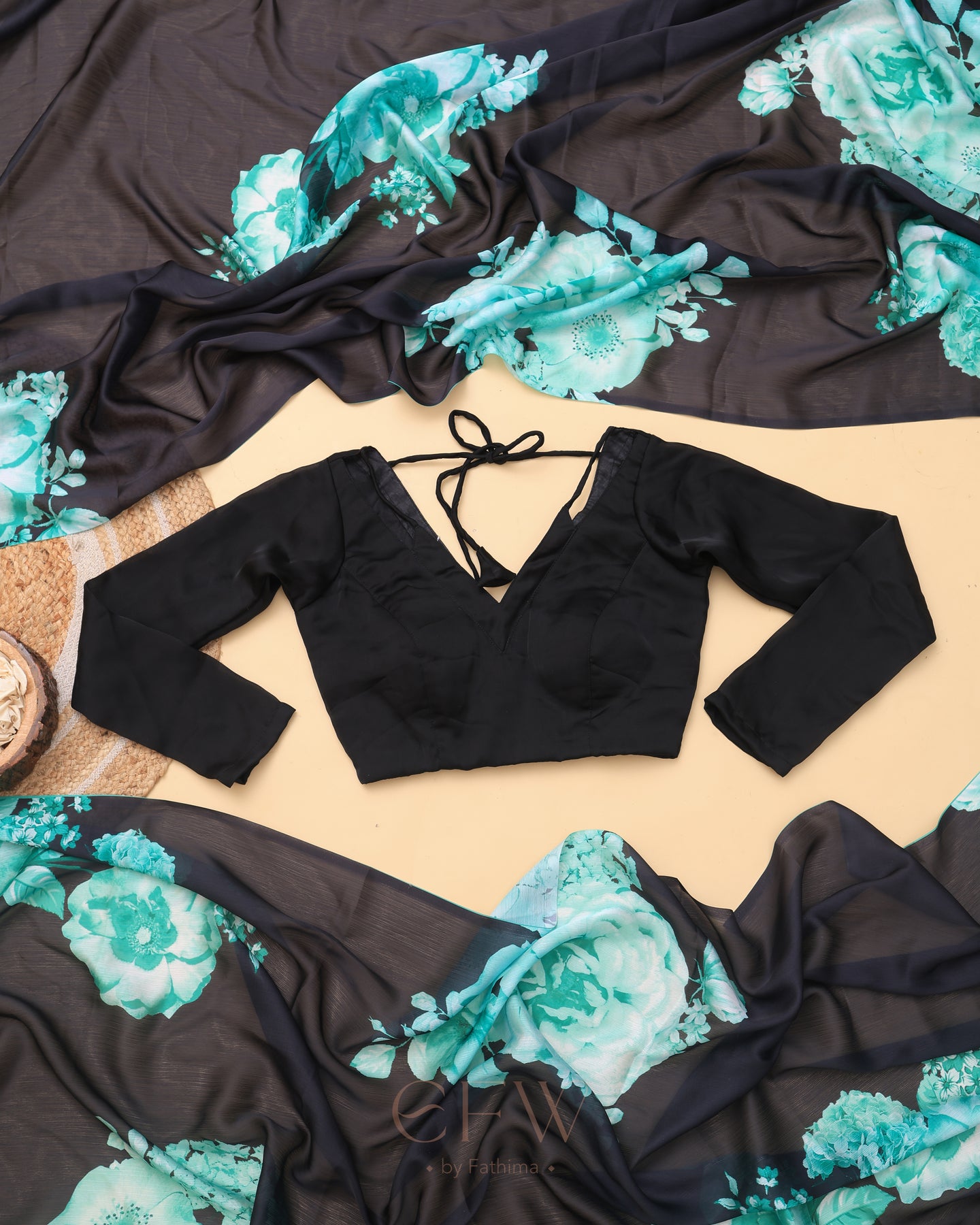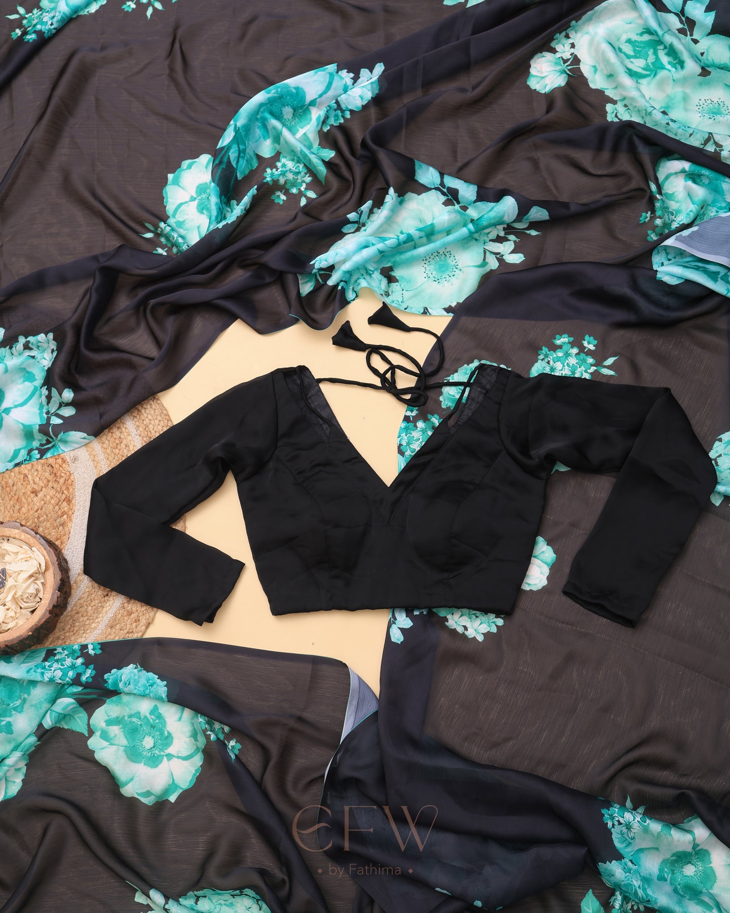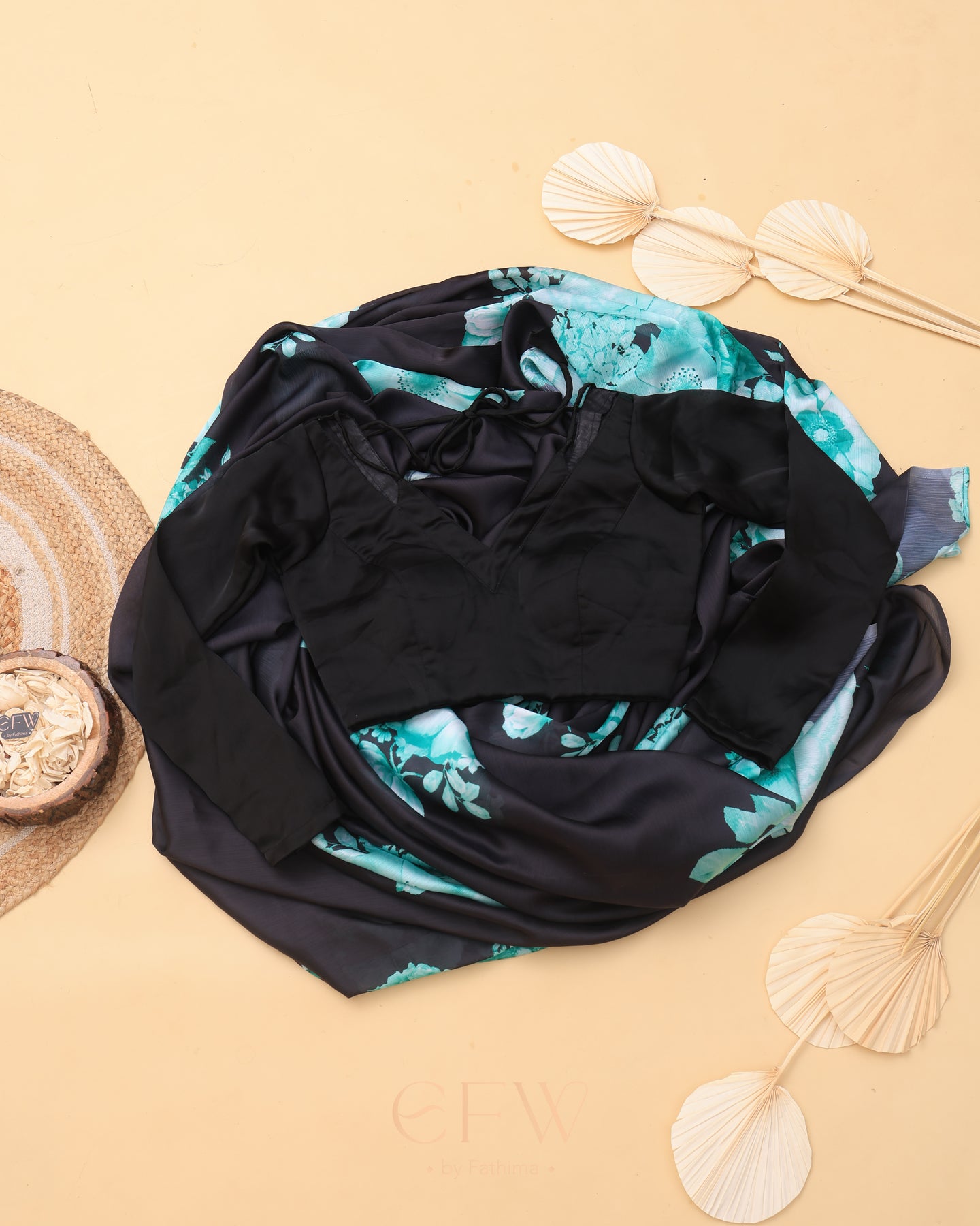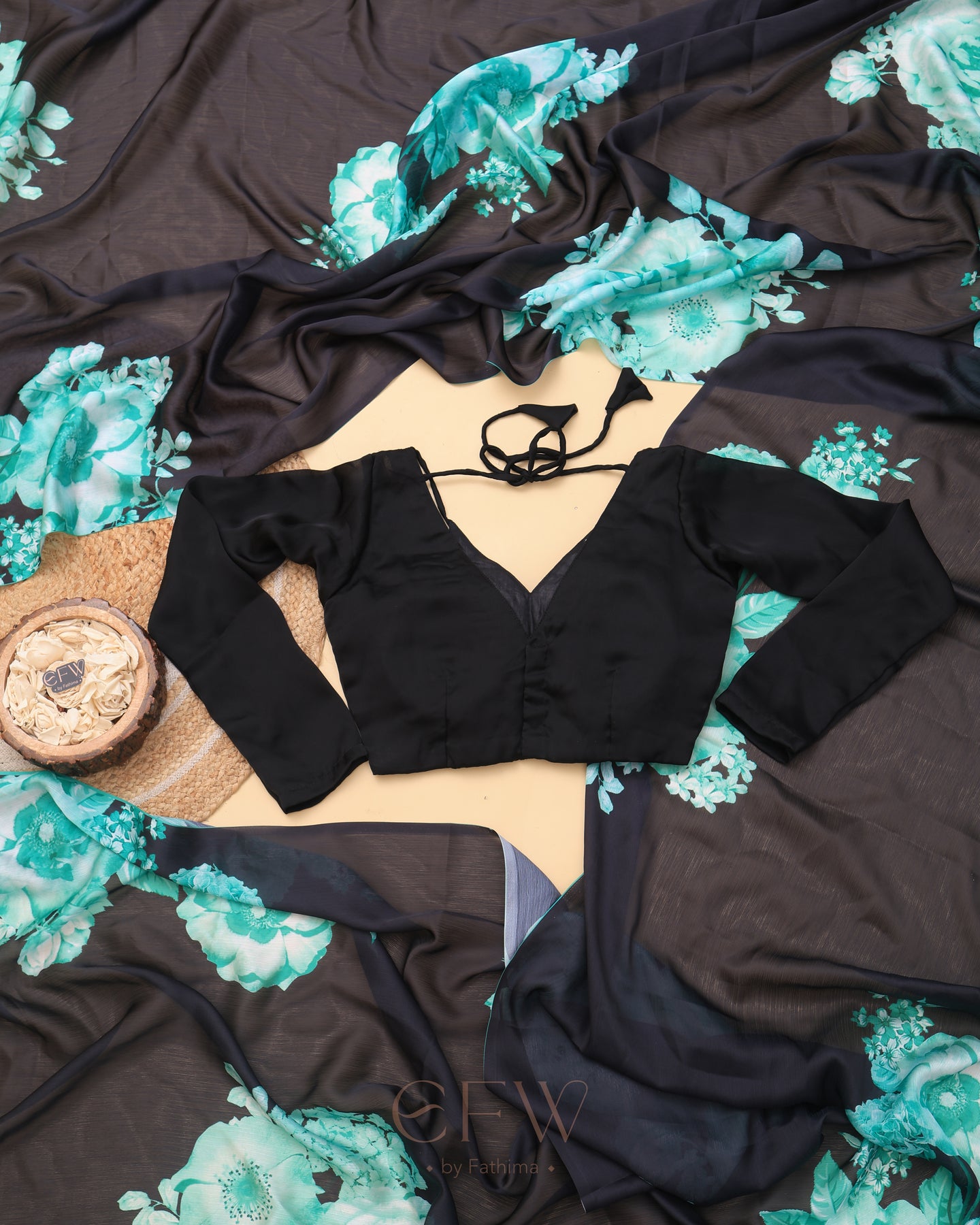Drape yourself in the enigmatic charm of Ira, a saree that channels midnight elegance with a bold flourish. The sheer black georgette base flows effortlessly, creating a featherlight drape that glides over your silhouette with graceful fluidity. Its deep noir canvas is artistically adorned with radiant teal and seafoam floral blooms—digitally printed with striking clarity—evoking the calm intensity of moonlit gardens.