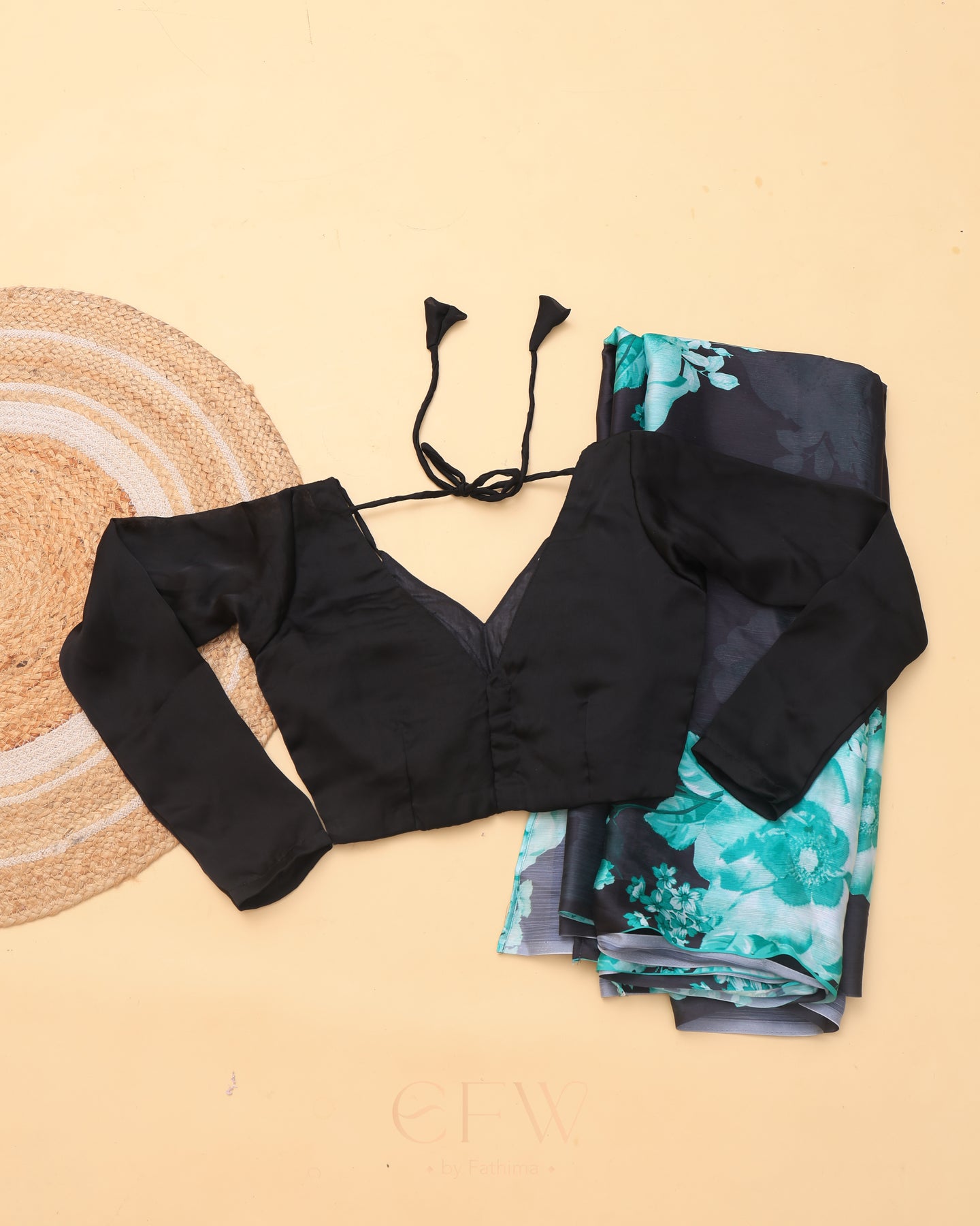 The full-sleeved blouse in solid onyx black brings contemporary sharpness to the ensemble, with its deep V-neck and structured fit offering just the right touch of modernity. The delicate tie-up back adds an understated sensuality, balancing tradition and trend.