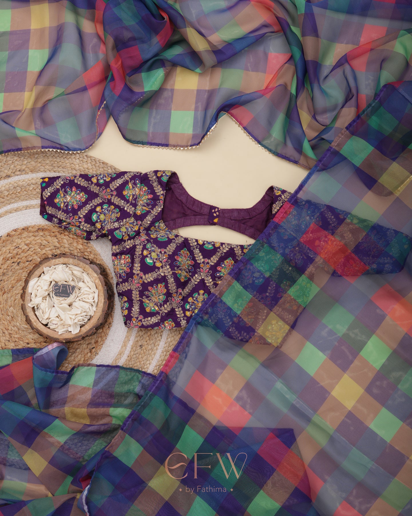 Celebrate heritage with a modern twist in our Madras Checks Organza Saree, a fresh take on the timeless classic. Traditionally woven in silk, the iconic Madras checks are here reimagined in lightweight, flowy organza for everyday usability, effortless drape, and contemporary styling.