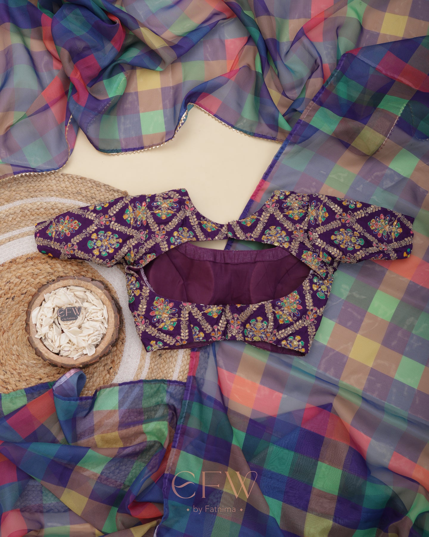 Crafted from premium organza, this saree showcases vibrant Madras checks in shades of emerald green, sapphire blue, ruby red, and golden beige.