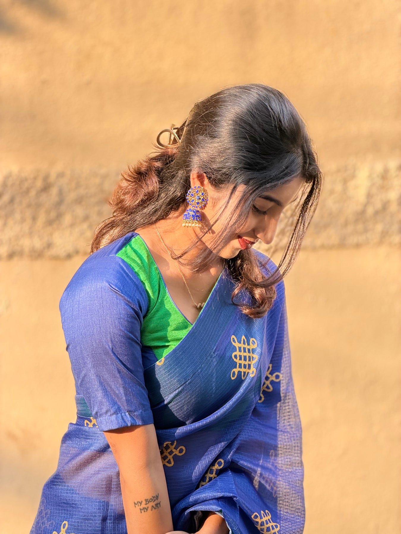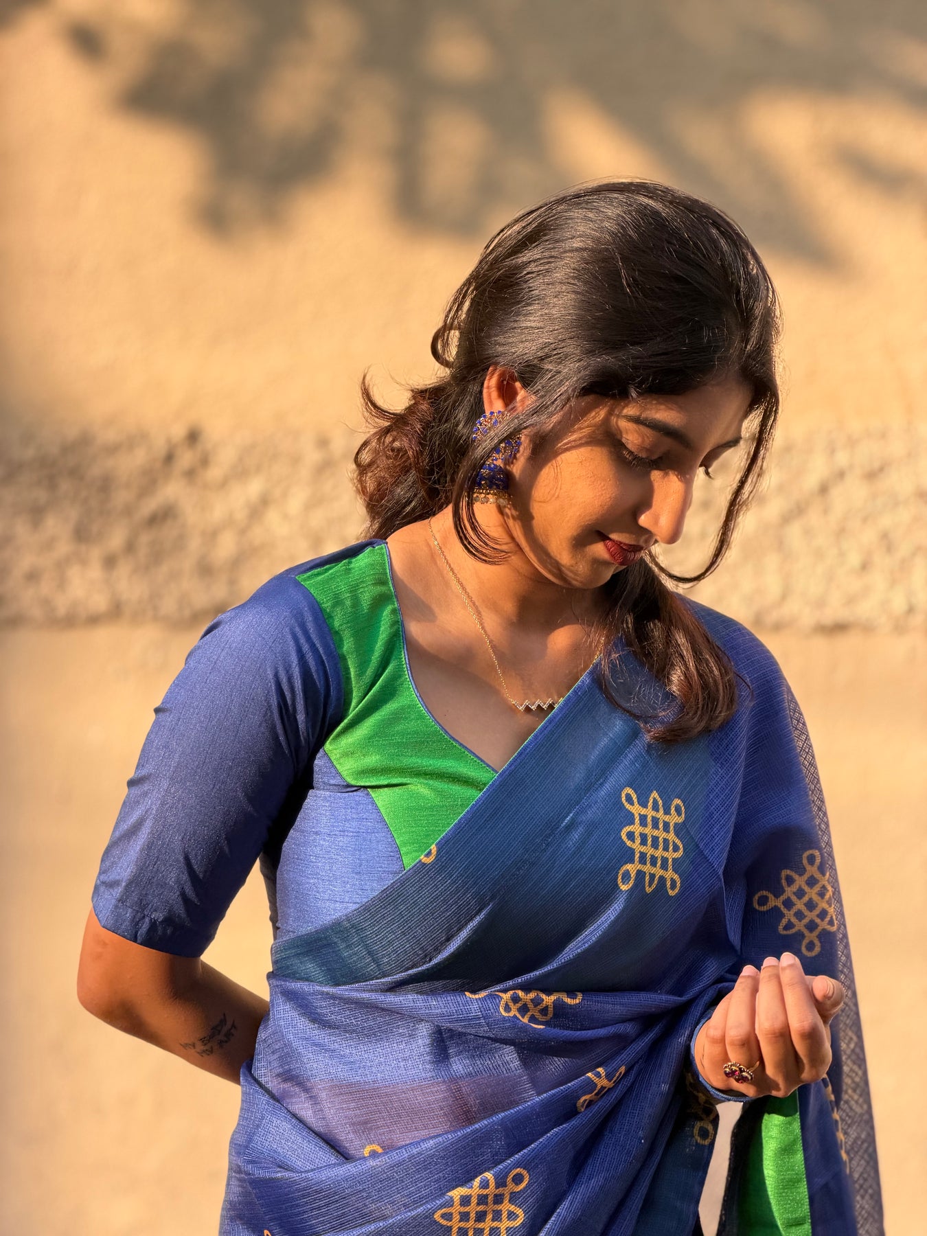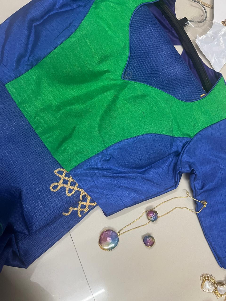 The blouse stands out with its contemporary panelled design, pairing green at the centre with royal blue sleeves and back, outlined with subtle piping that sharpens the silhouette. Together, the contrast hues create a vibrant yet polished look—perfect for festive occasions, cultural celebrations, or evening gatherings.