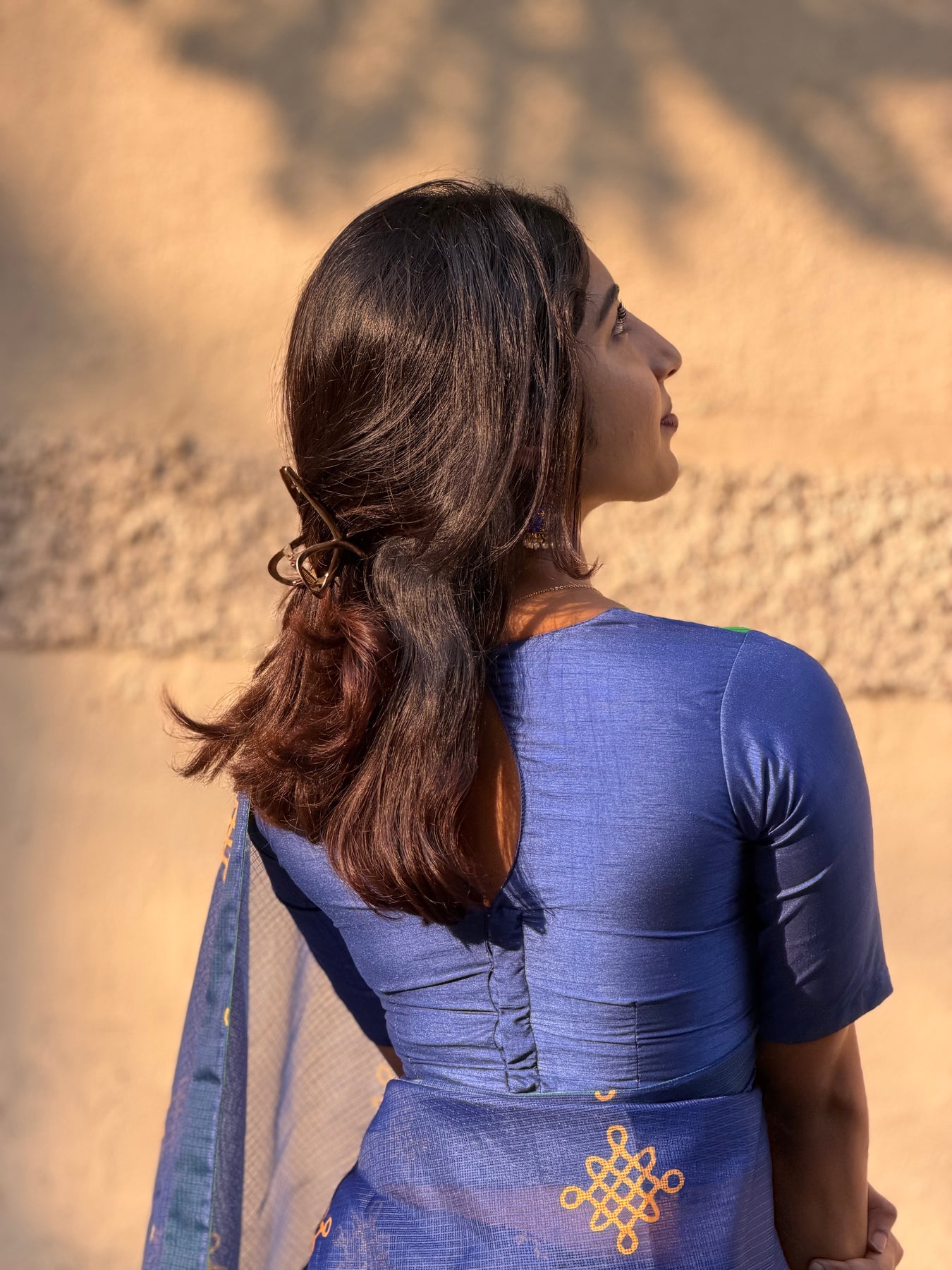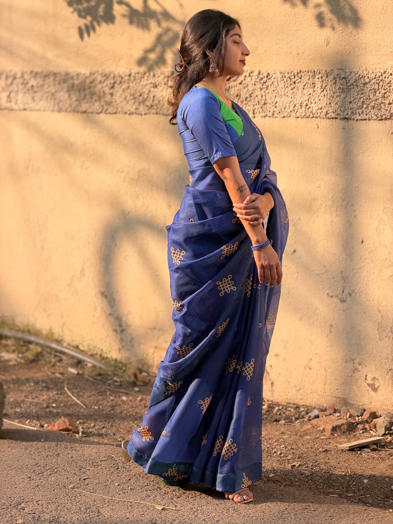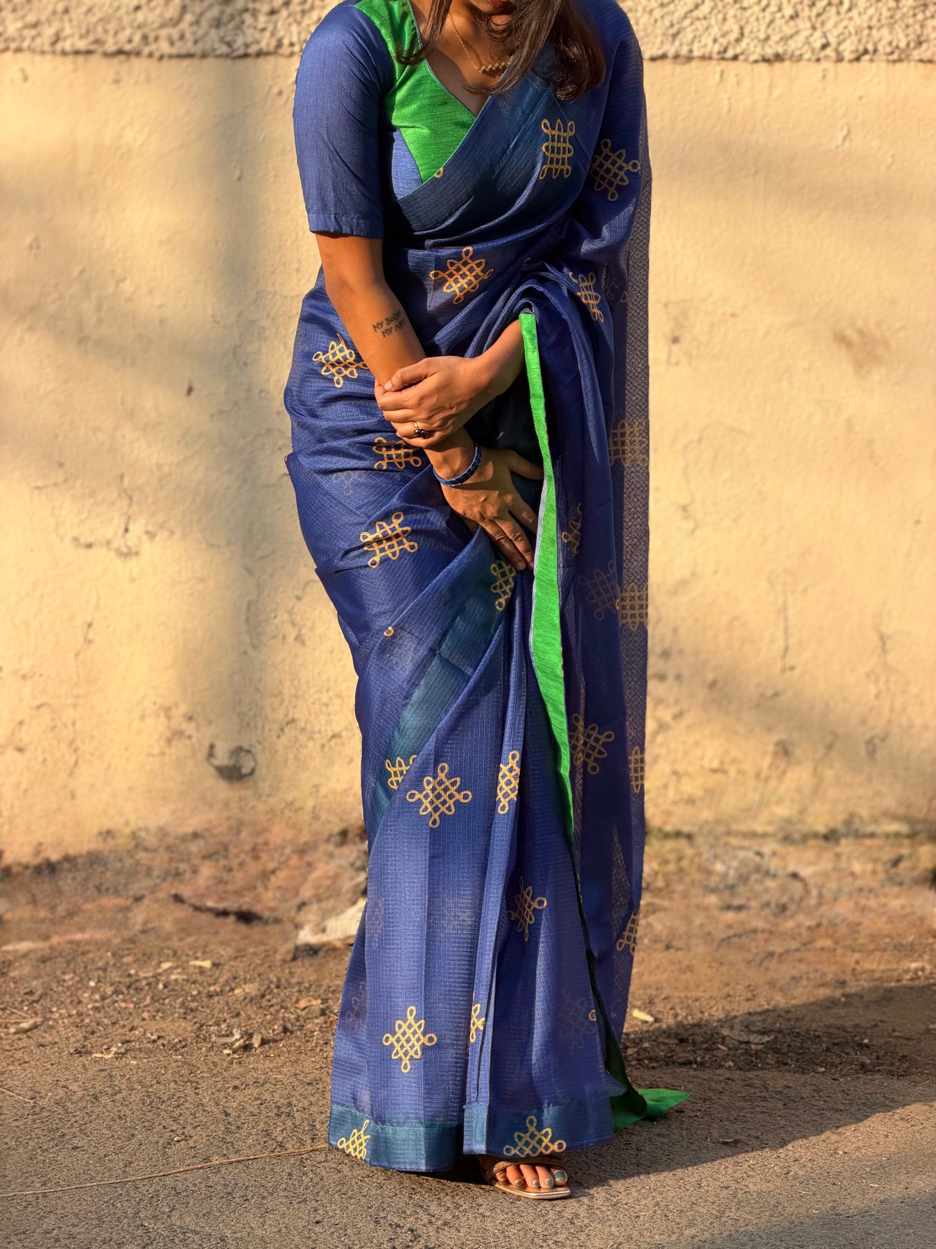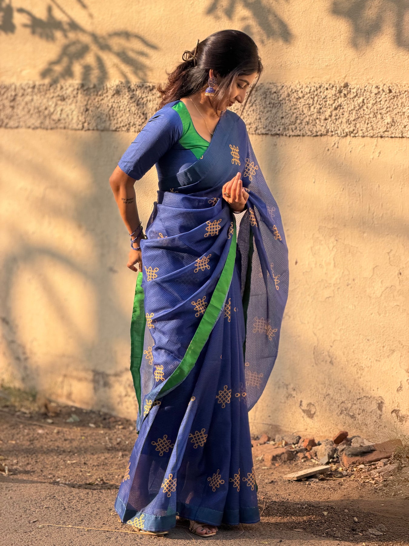 The NALIRA blends bold colourplay with understated elegance, creating a look that is both modern and rooted in traditional finesse. The saree features a striking combination of deep royal blue and rich emerald green, crafted from a textured kota checks weave that drapes with a natural, graceful flow. Kolam motifs add a touch of heritage shimmer, elevating the ensemble with quiet sophistication.