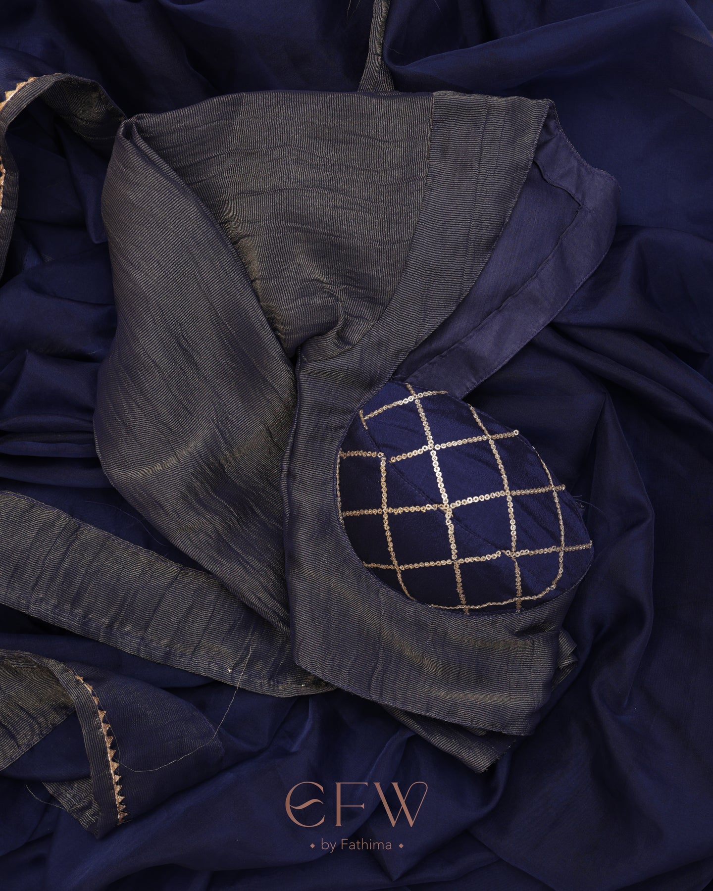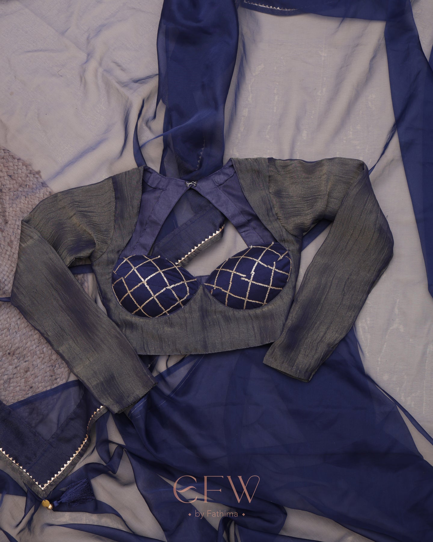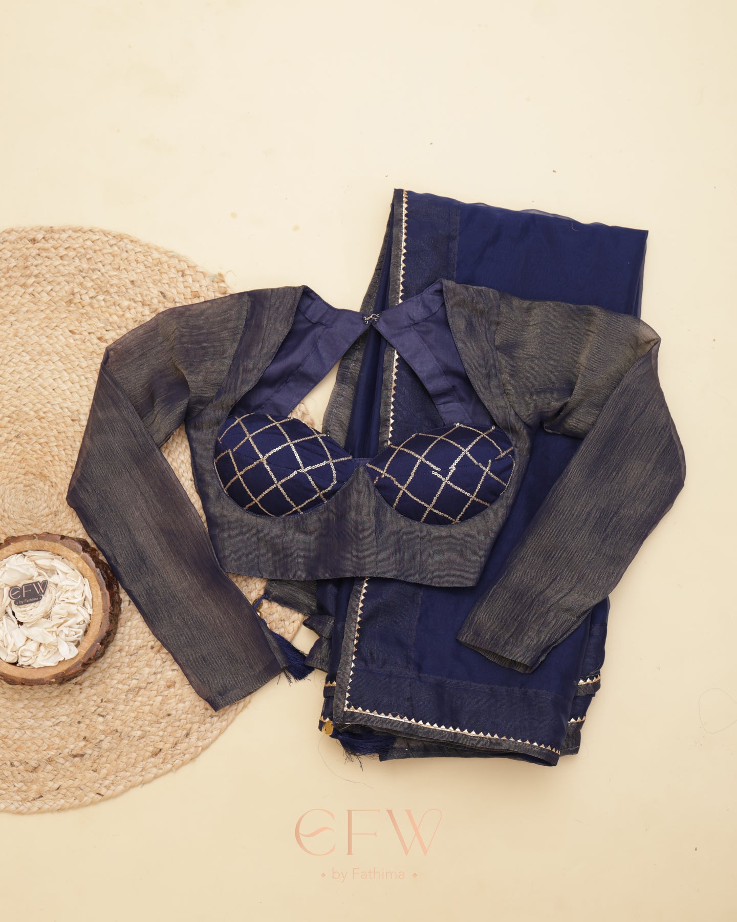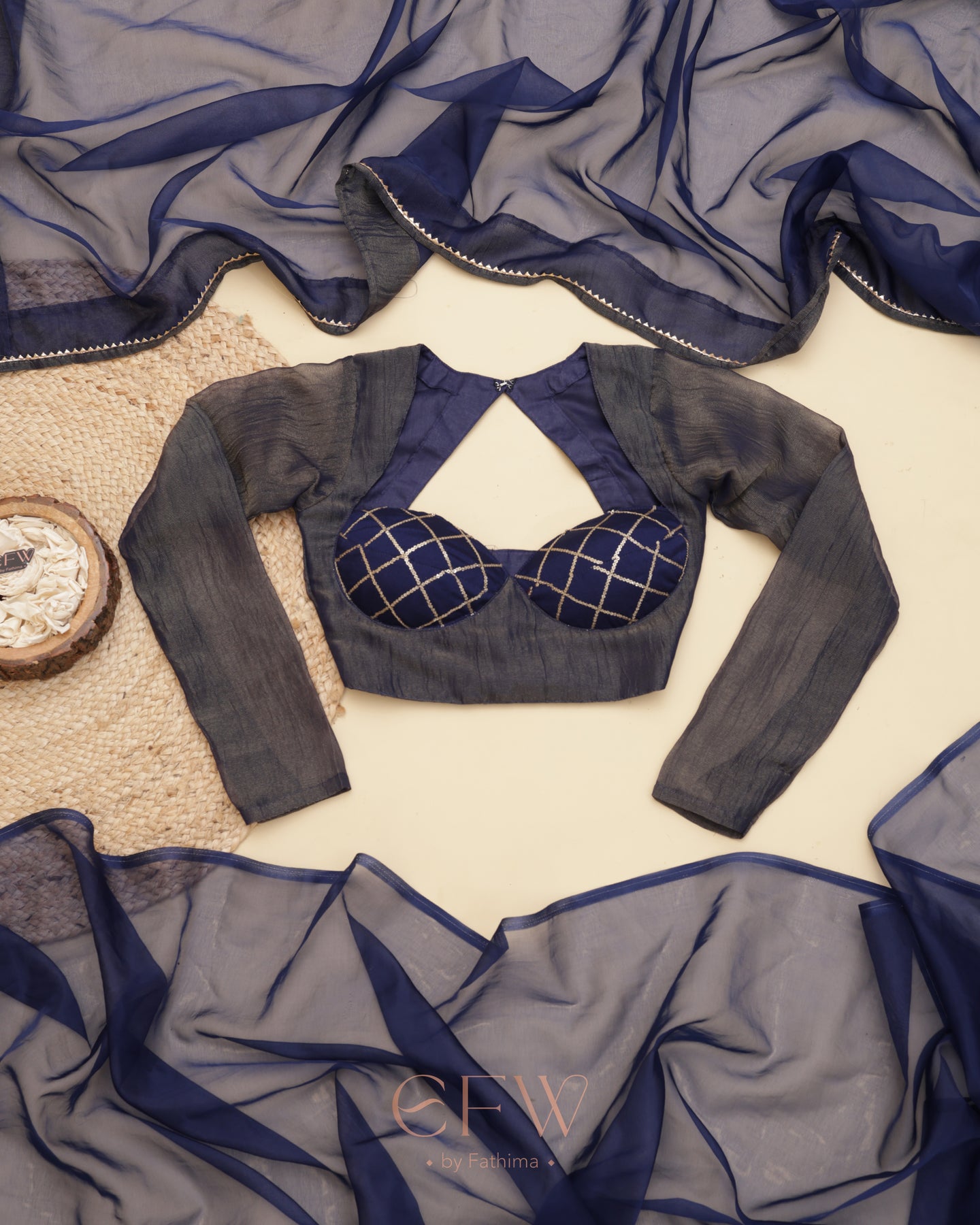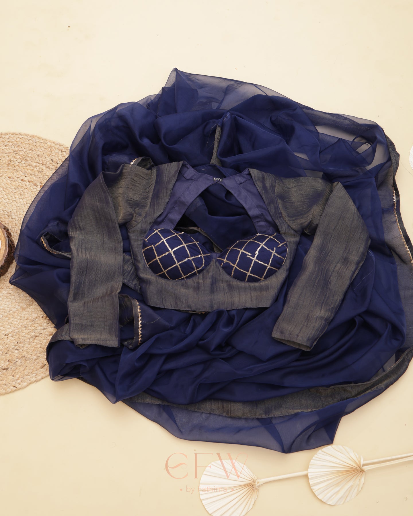 Celebrate the night of lights in the Neel Noor Saree Set. The saree features a sheer midnight-blue drape with a soft sheen and a delicate gold zig-zag trim—clean, minimal, and glowing under festive lights. The coordinated blouse is crafted in rich navy with a hand-worked sequin jaali (lattice) on the cup and a chic back cut-out, echoing the geometry of rangoli and rows of diyas.