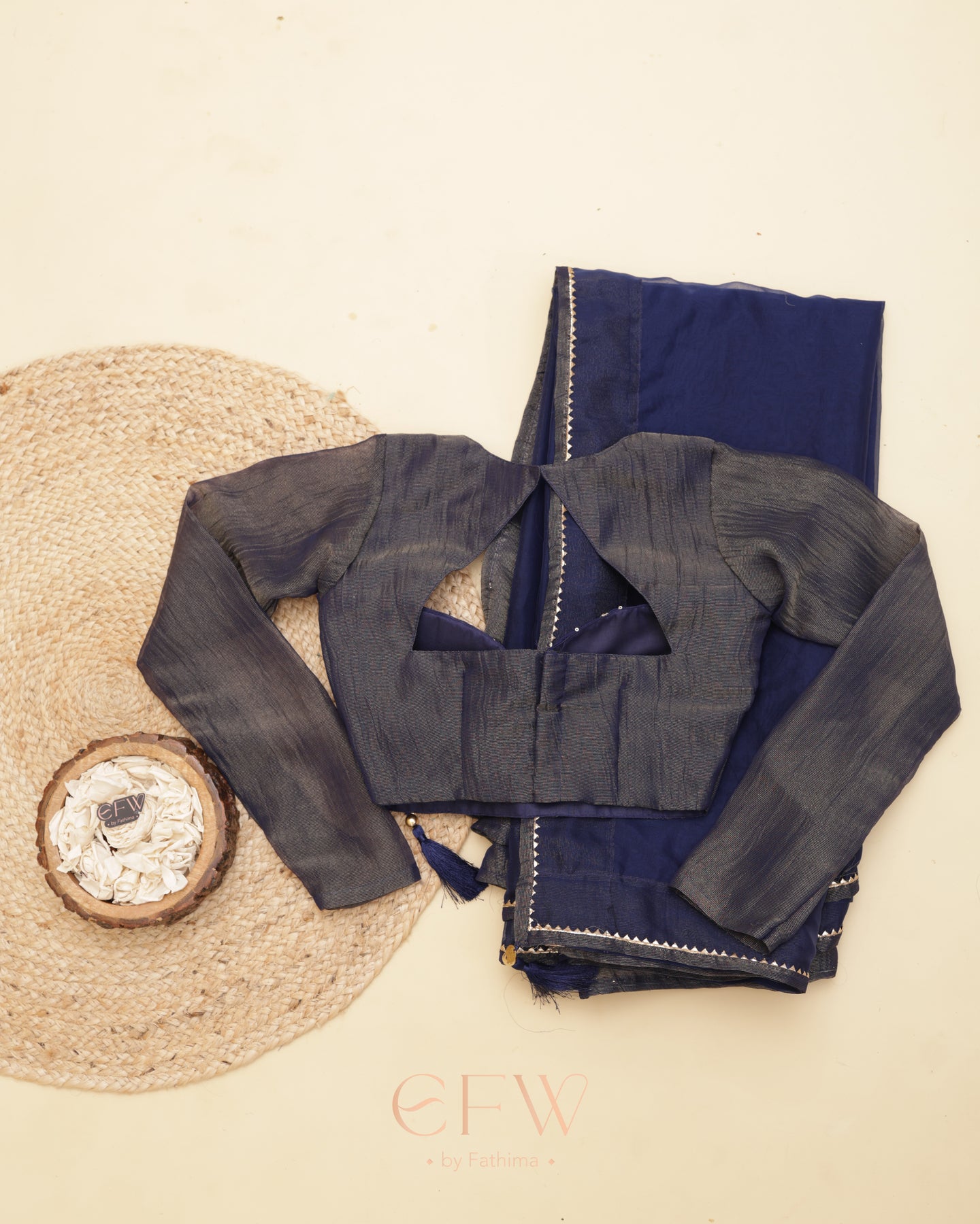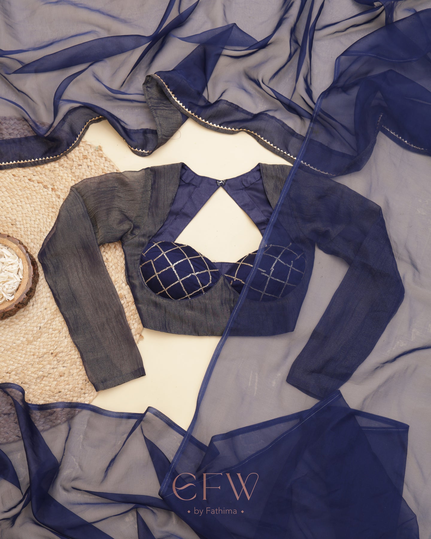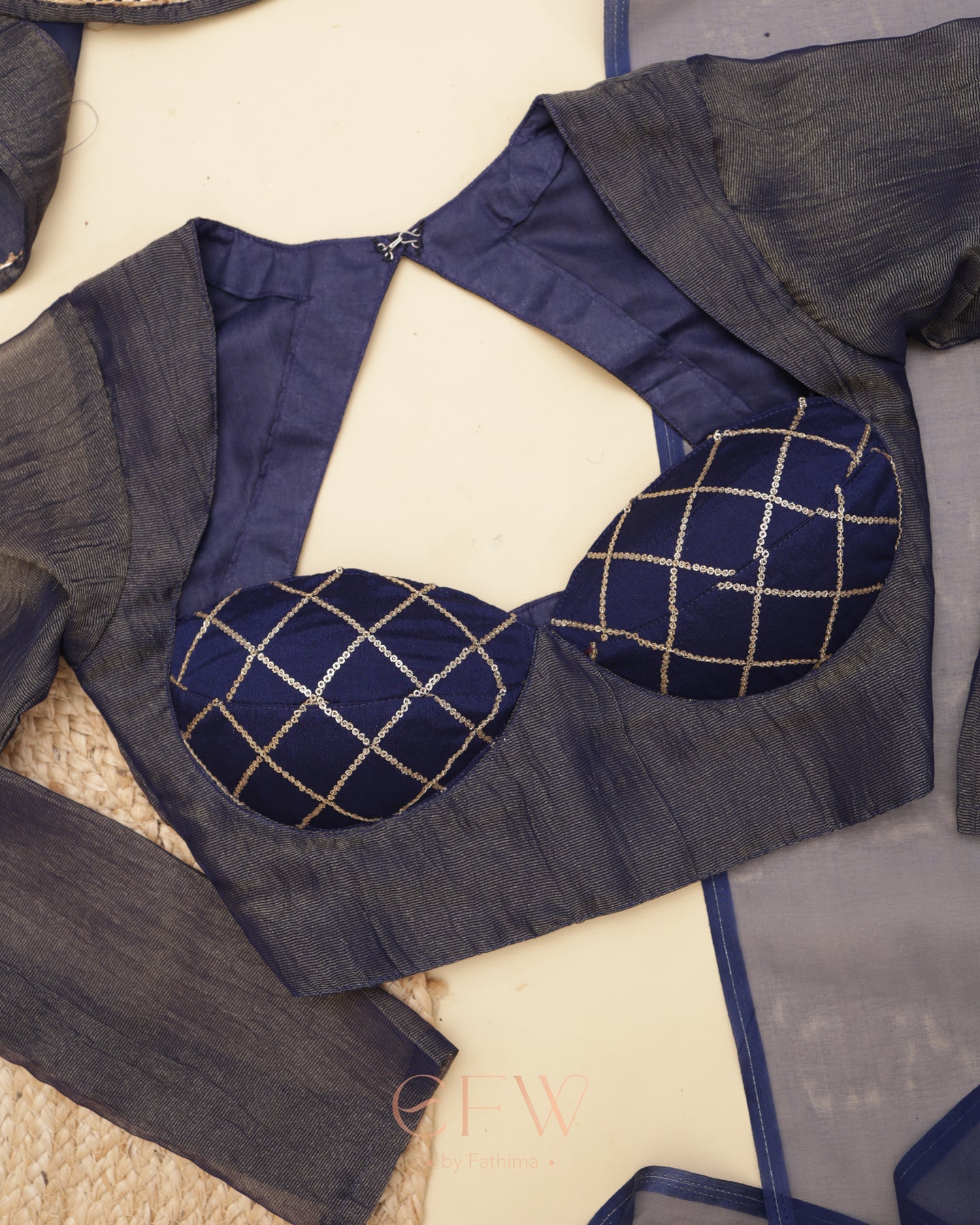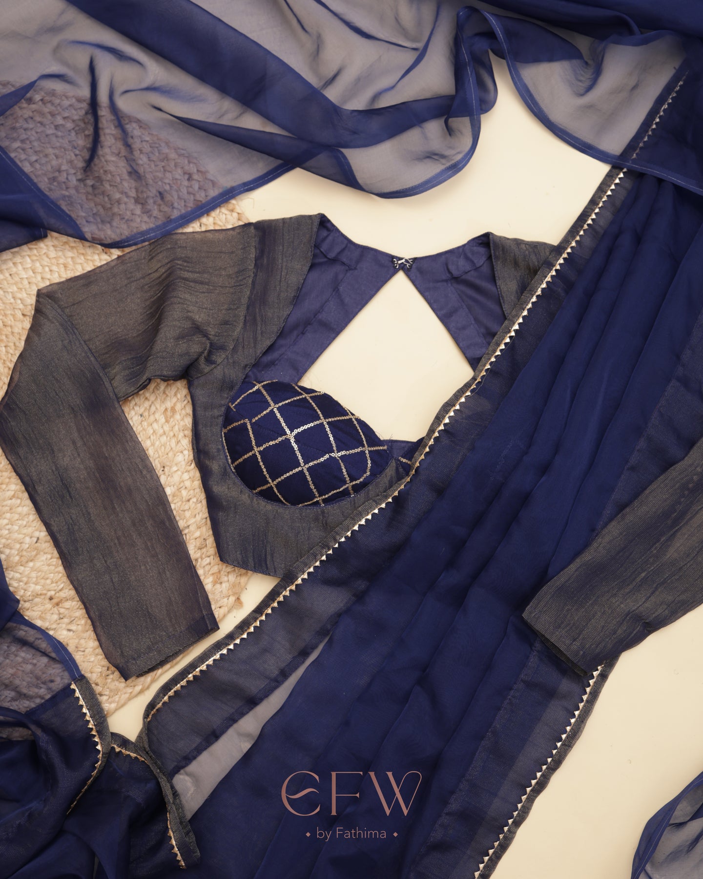 Celebrate the night of lights in the Neel Noor Saree Set. The saree features a sheer midnight-blue drape with a soft sheen and a delicate gold zig-zag trim—clean, minimal, and glowing under festive lights. The coordinated blouse is crafted in rich navy with a hand-worked sequin jaali (lattice) on the cup and a chic back cut-out, echoing the geometry of rangoli and rows of diyas.
