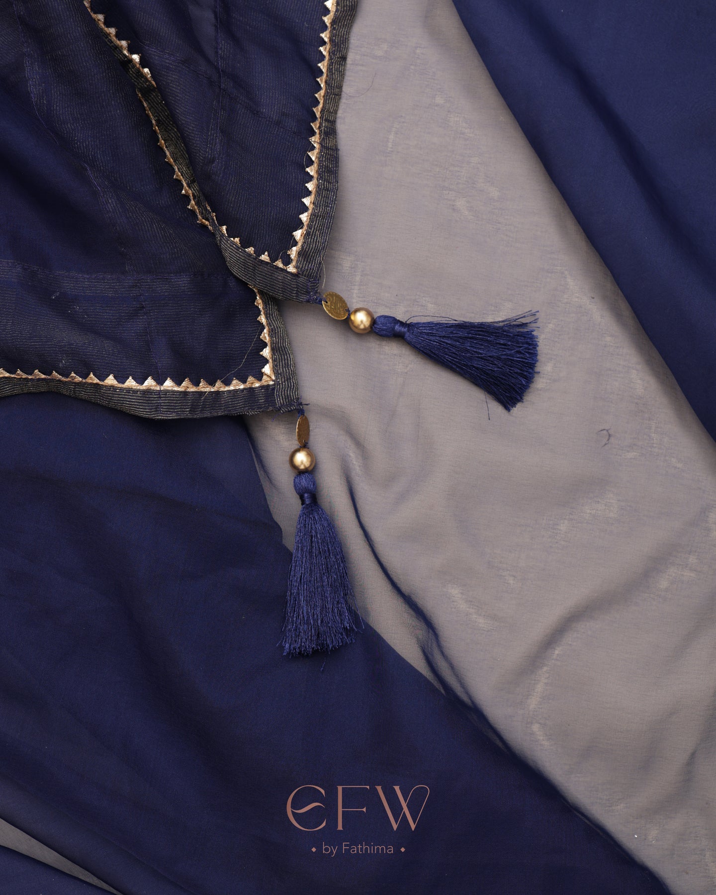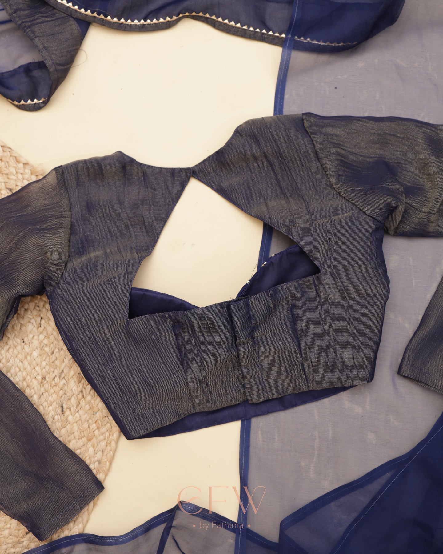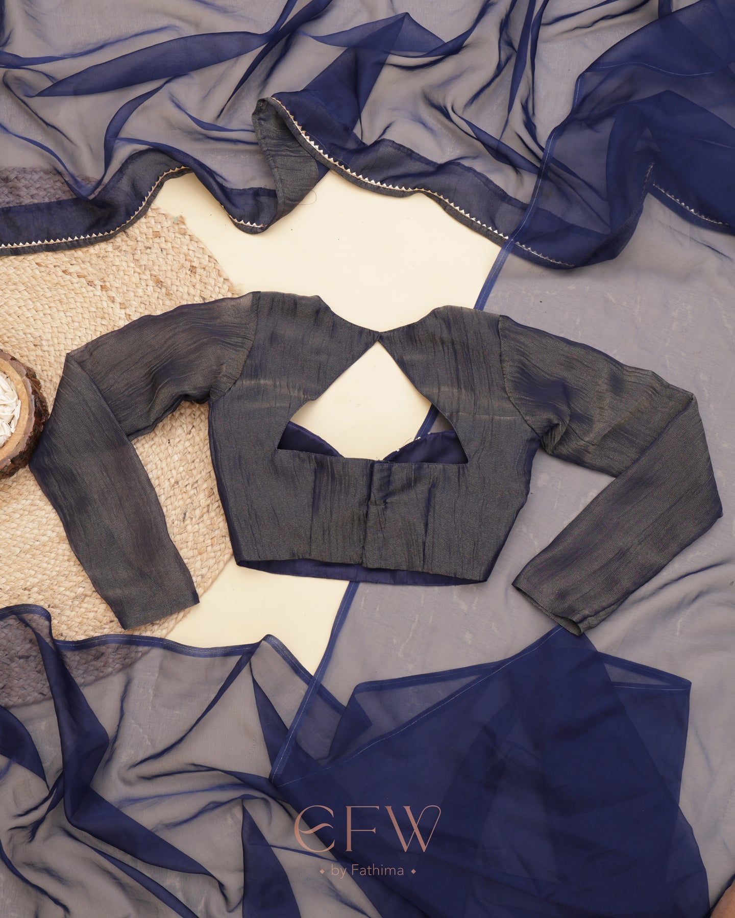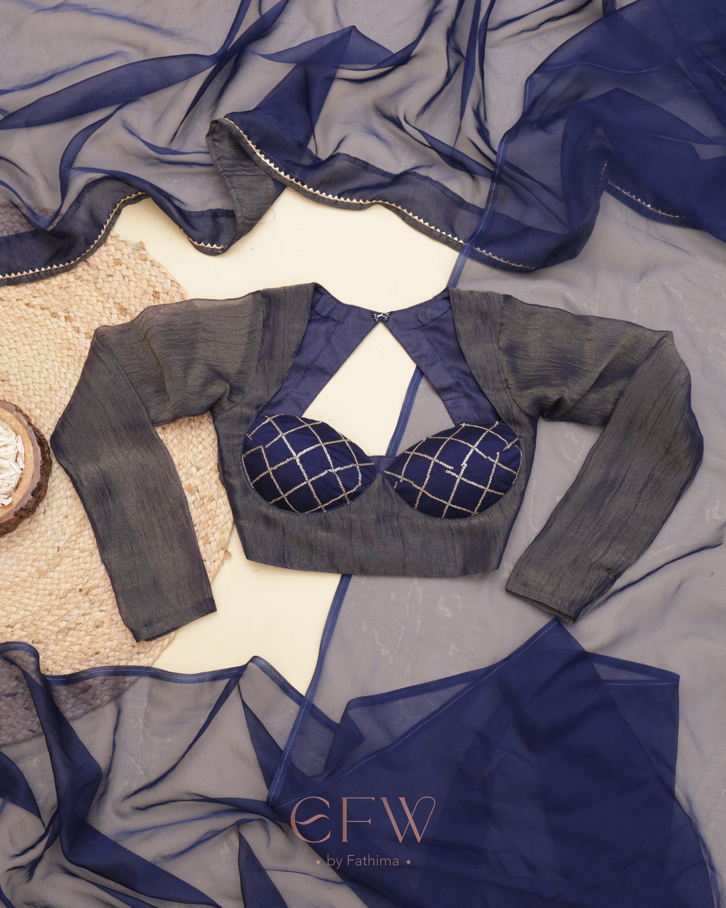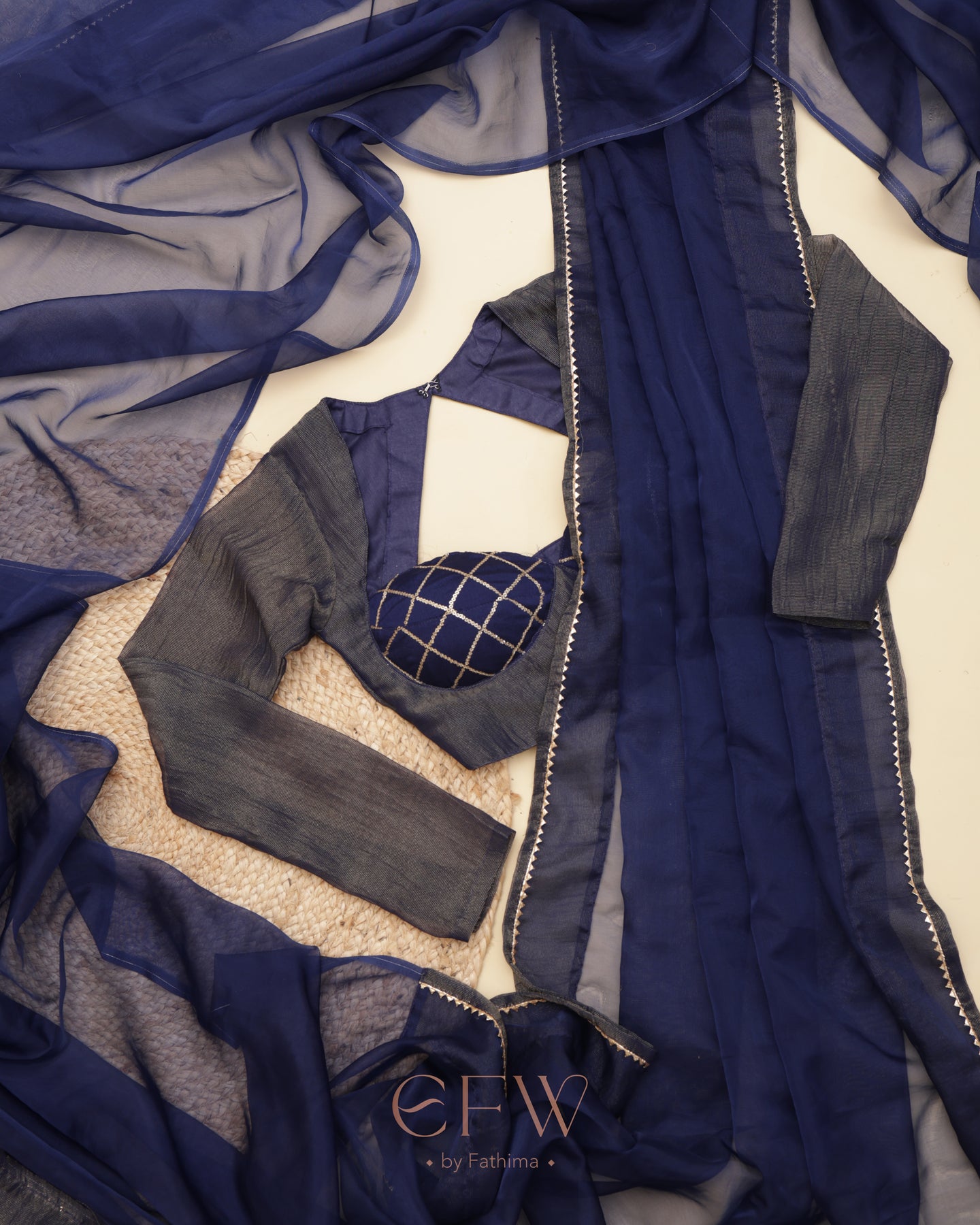 Celebrate the night of lights in the Neel Noor Saree Set. The saree features a sheer midnight-blue drape with a soft sheen and a delicate gold zig-zag trim—clean, minimal, and glowing under festive lights. The coordinated blouse is crafted in rich navy with a hand-worked sequin jaali (lattice) on the cup and a chic back cut-out, echoing the geometry of rangoli and rows of diyas.