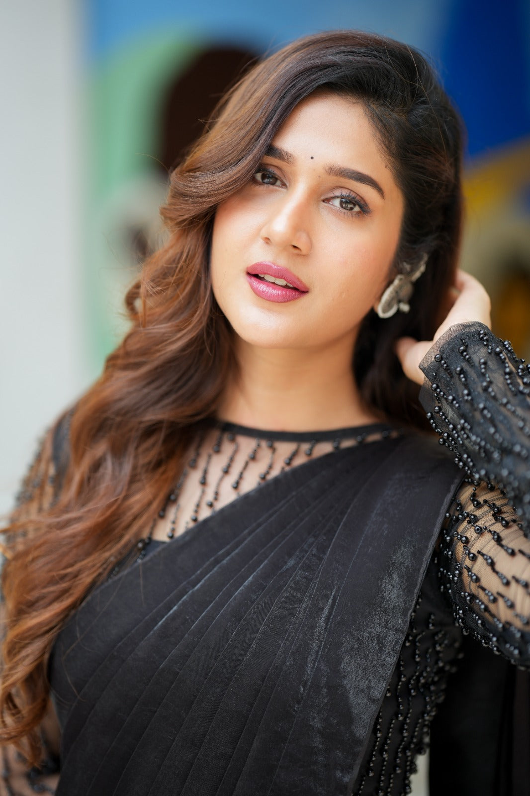 The statement blouse elevates the ensemble to couture territory. Designed on a sheer black base, it features intricate bead embellishments cascading in delicate vertical trails across the sleeves and bodice. The illusion neckline and sheer sleeves balance sensuality with sophistication, making the blouse the true showstopper of this look.